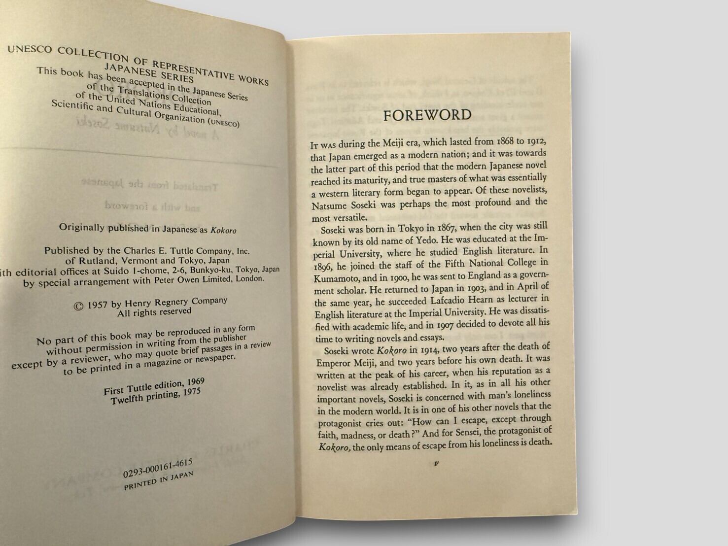 日本の小説家、夏目漱石による長編小説『こゝろ』英訳本。タトル社版初版は1969年刊行。本書は1975年に刊行された第12刷。