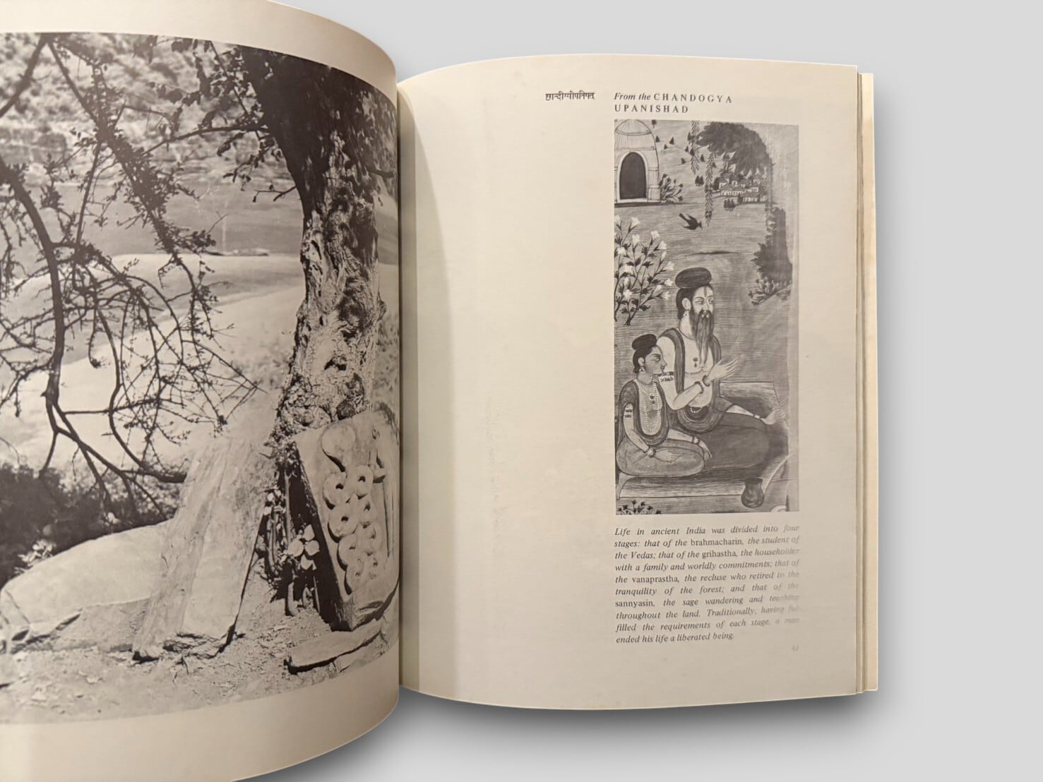 サンスクリット語で書かれたヴェーダの奥義書、ウパニシャッドを要約した写真付き英訳本。
