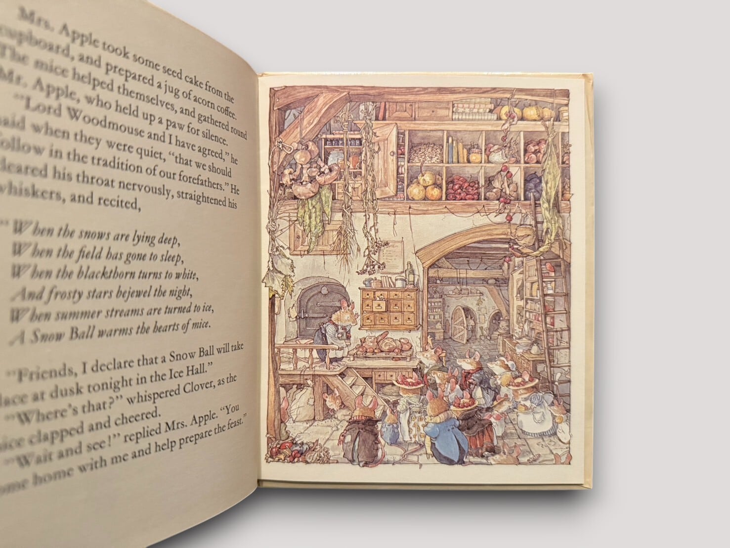 イギリスの絵本作家、イラストレーターのジル・バークレム(1951-2017)の代表作「のばらの村のものがたり(Brambly Hedge)」シリーズ『雪の日のパーティ』。初版は1980年刊行、本書は1981年に刊行された第8刷。