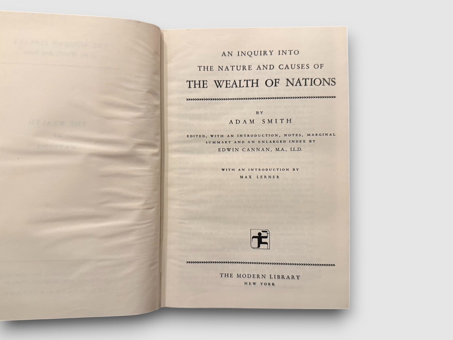 アダム・スミスの著作『国富論』(諸国民の富の性質と原因に関する研究)。1965年刊行モダンライブラリーエディション。