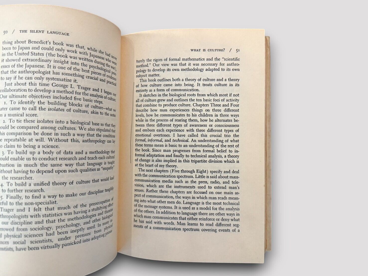 アメリカ合衆国の文化人類学者、エドワード・T・ホール(1914-2009)による名著『沈黙のことば』。1959年刊行初版。日本の精神科医、土居健郎氏(1920-2009)宛て署名入り著者献呈本。