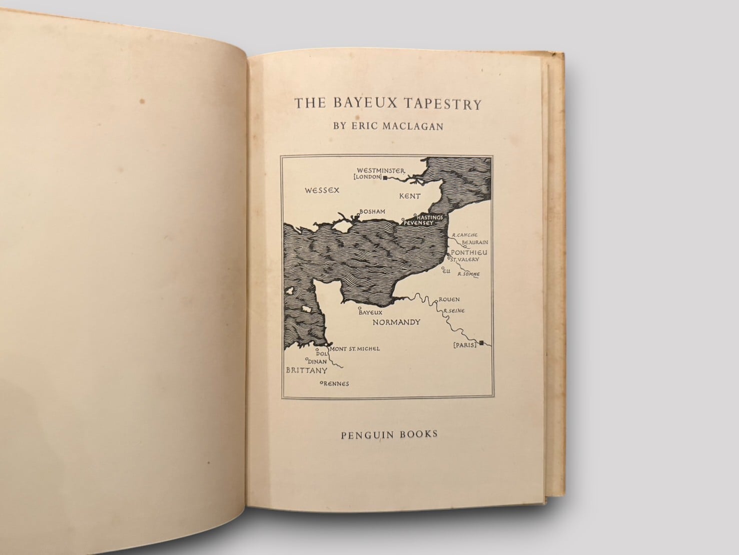 イギリスの美術史家エリック・マクラーガンによる1066年のノルマン・コンクエストを描いた有名な「バイユーのタペストリー」(*イングランド征服(ノルマン・コンクエスト)の物語を、亜麻で作った薄布(リネン)に刺繍によって描いた刺繍画)の歴史的背景、構成、芸術的価値について解説された1冊。ペンギン・ブックス社の「キング・ペンギン・シリーズ」の第10巻として1943年12月に初版が刊行された。カラーを含む図版と扉絵に小さなMAP収録。コンパクトながら見ごたえのある1冊。1953年刊行。