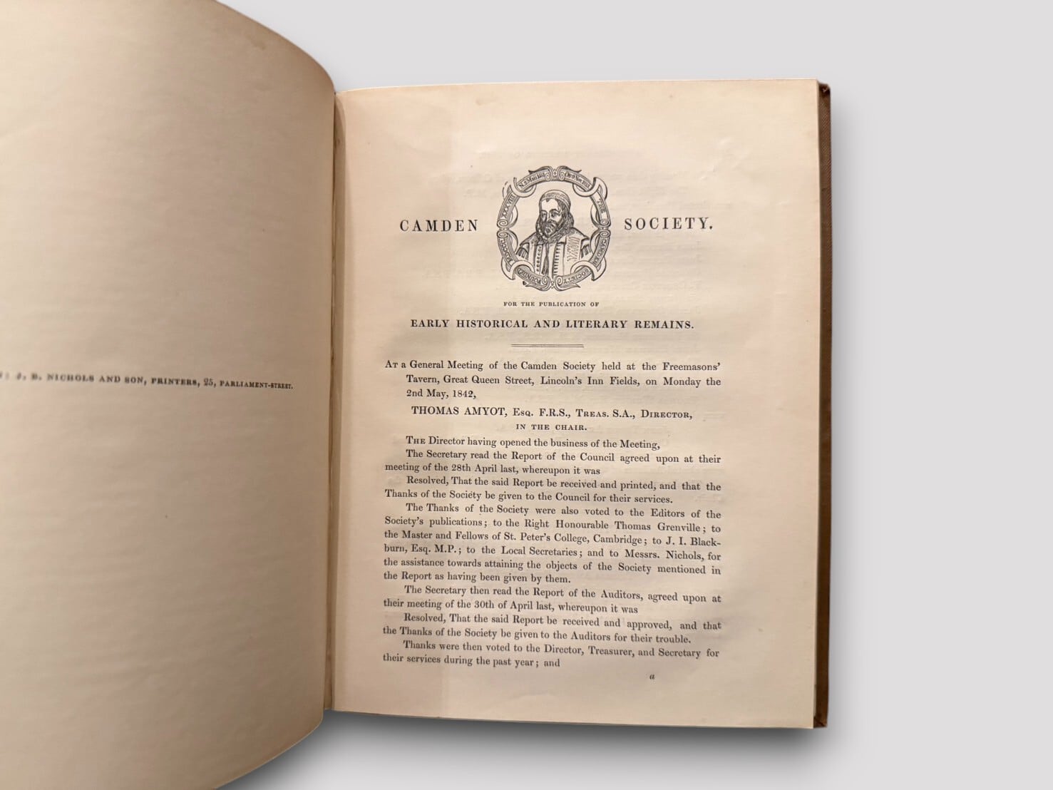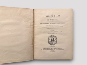 ジョン・ディーの私的日記と蔵書目録を、オックスフォード大学アシュモレアン博物館およびケンブリッジ大学トリニティ・カレッジ図書館に残された原資料に基づき編纂・出版した貴重な記録集。日記部分では、1554年から1601年にかけての日常や出生記録、神秘思想の足跡が淡々と記され、蔵書目録にはディーの知的宇宙が凝縮されている。西洋神秘思想や16世紀英国に関心を持つ研究者・収集家にとっては、まさに魂を呼び覚ますような1冊。カムデン協会から1842年に出版された貴重な初版。