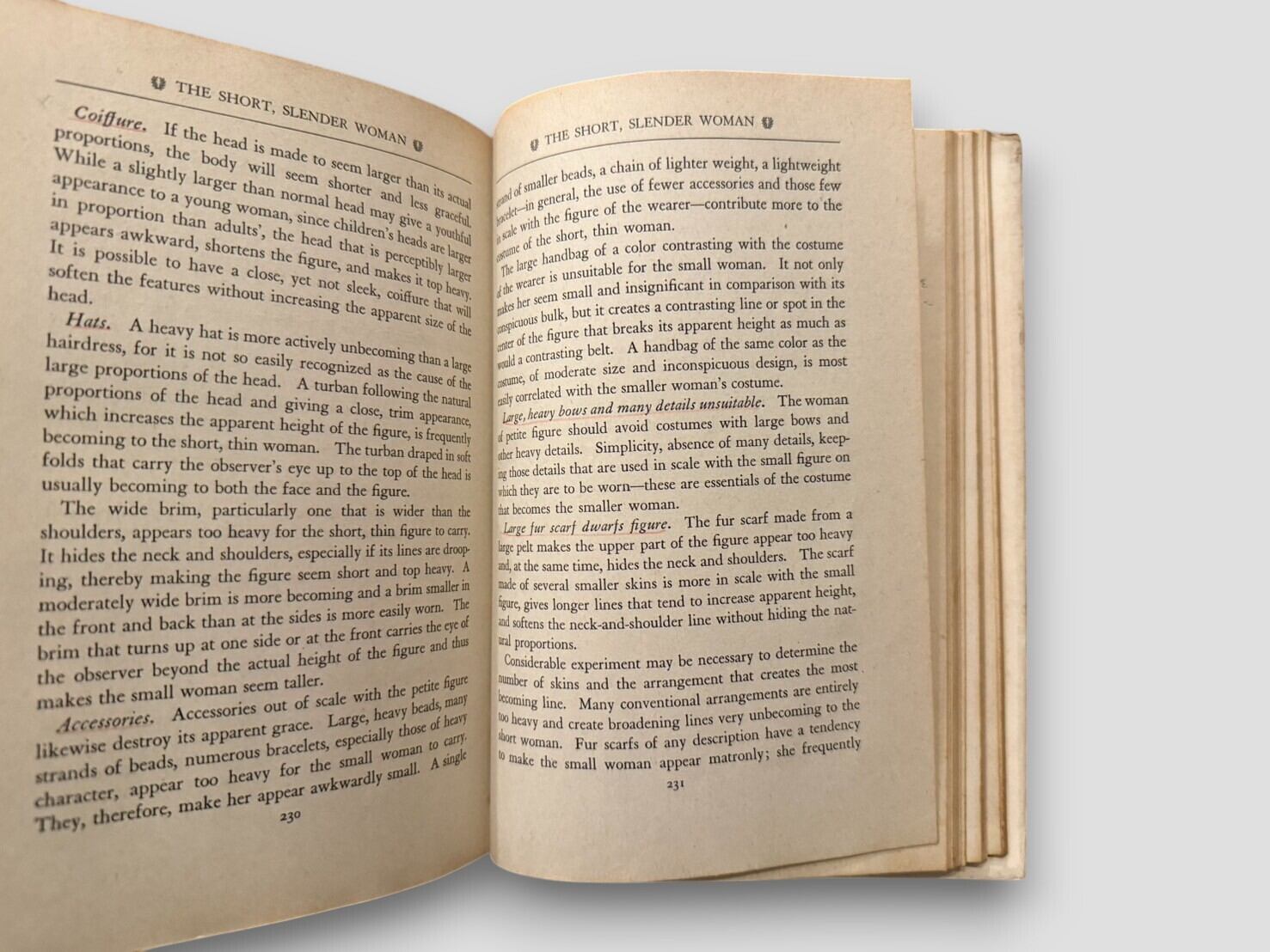色彩と線が与える印象の心理学的・視覚的効果に基づき、衣服の選び方を体系的に説いた1940年代の服飾教育書。顔の輪郭、首の長さ、体型などを考慮し、ネックライン、アクセサリー、ヘアスタイルに至るまで「見せ方」のセオリーを詳細に解説している。殆どの挿絵に日本語書き込みが加わっており、前持ち主(服飾業界において非常に著名な方です)の息づかいも感じられるユニークな1冊。古き良きアメリカの美意識とともに、服飾理論の原点をたどる貴重な資料である。1947年に刊行された第3版。