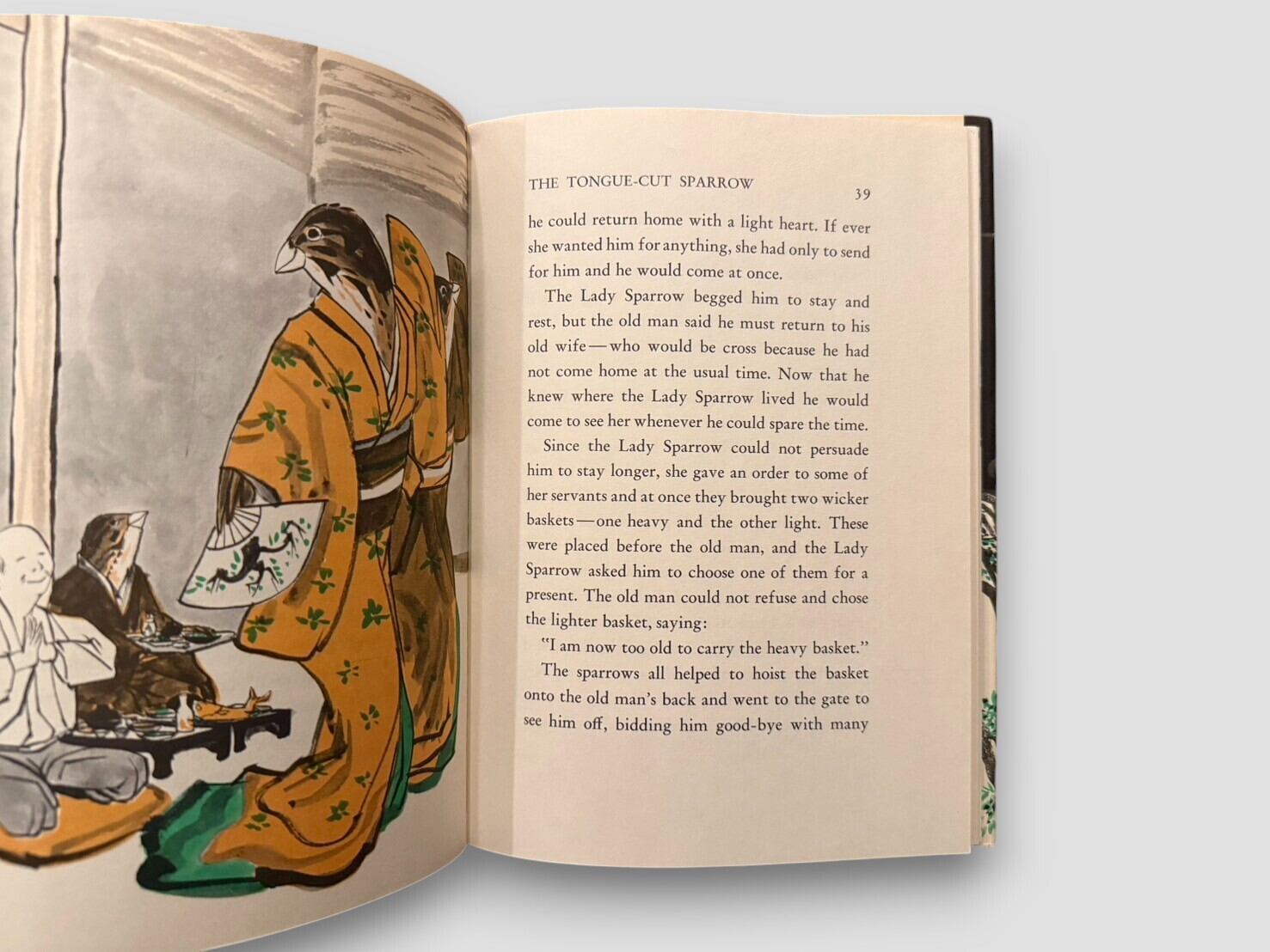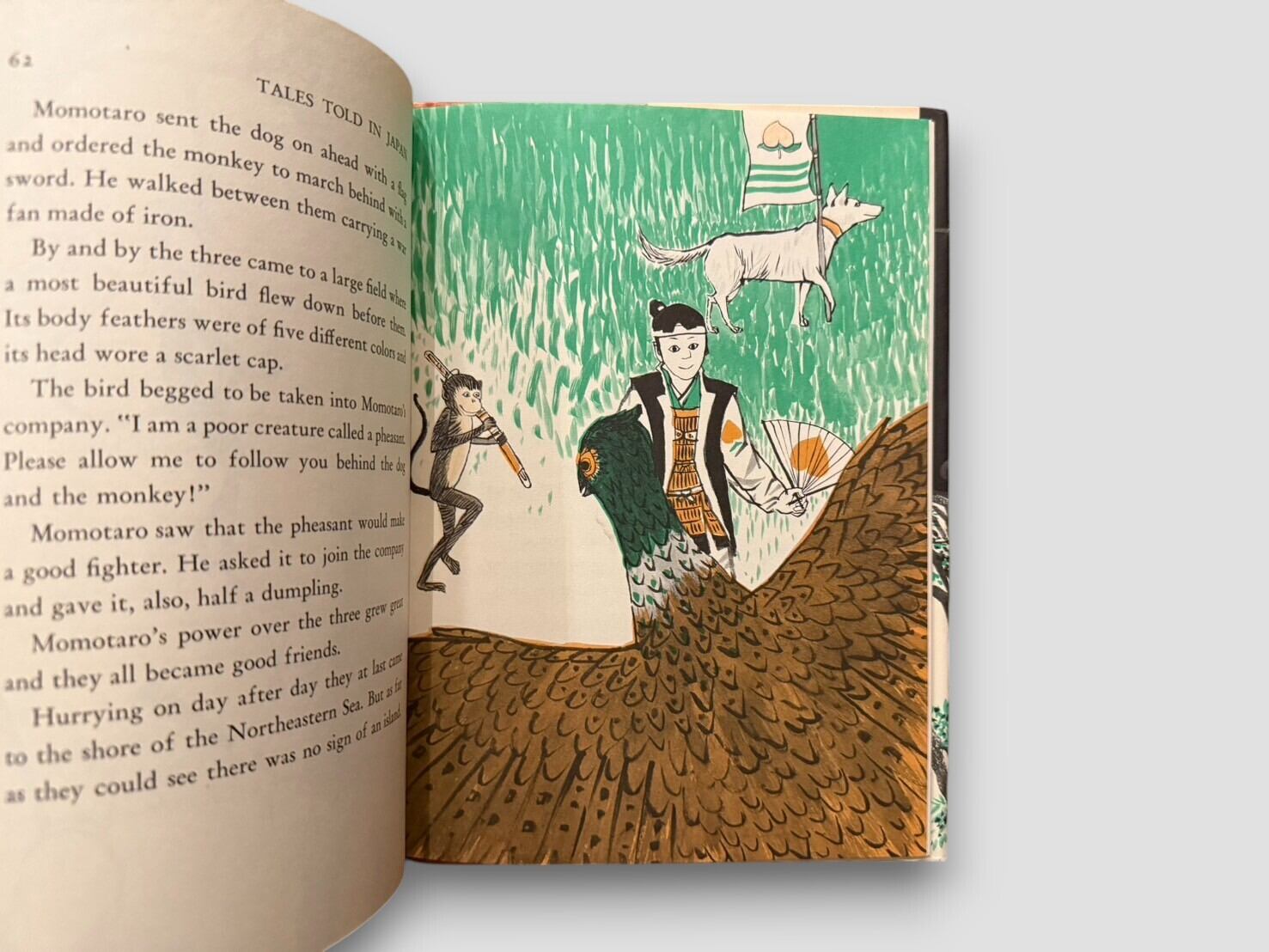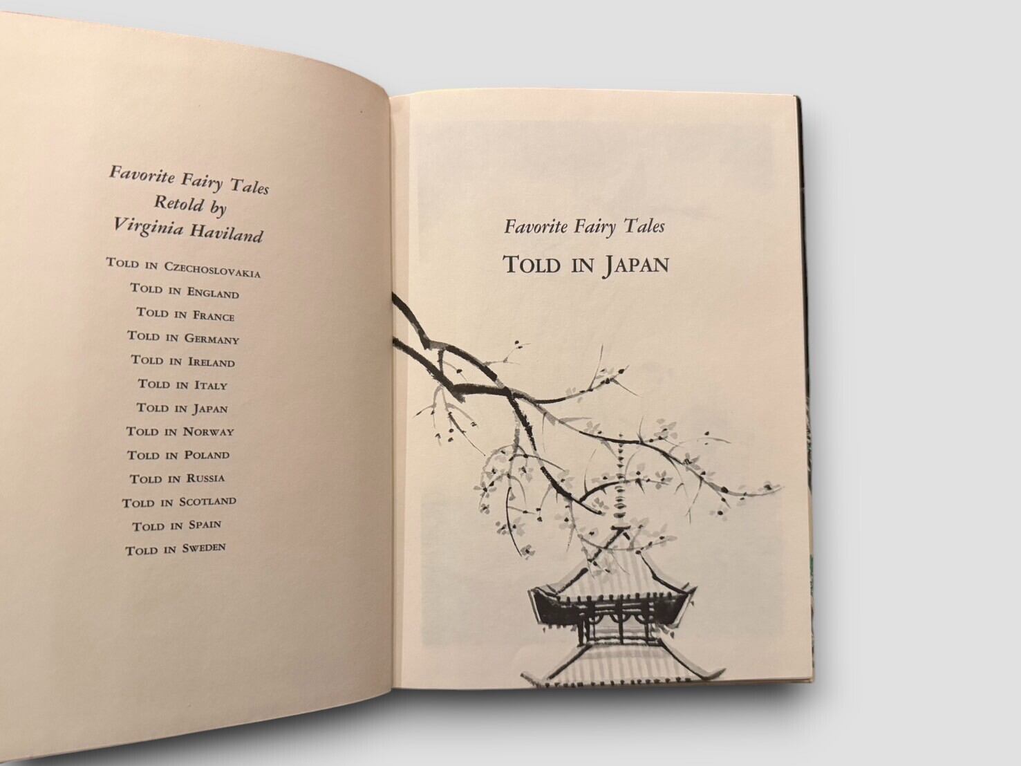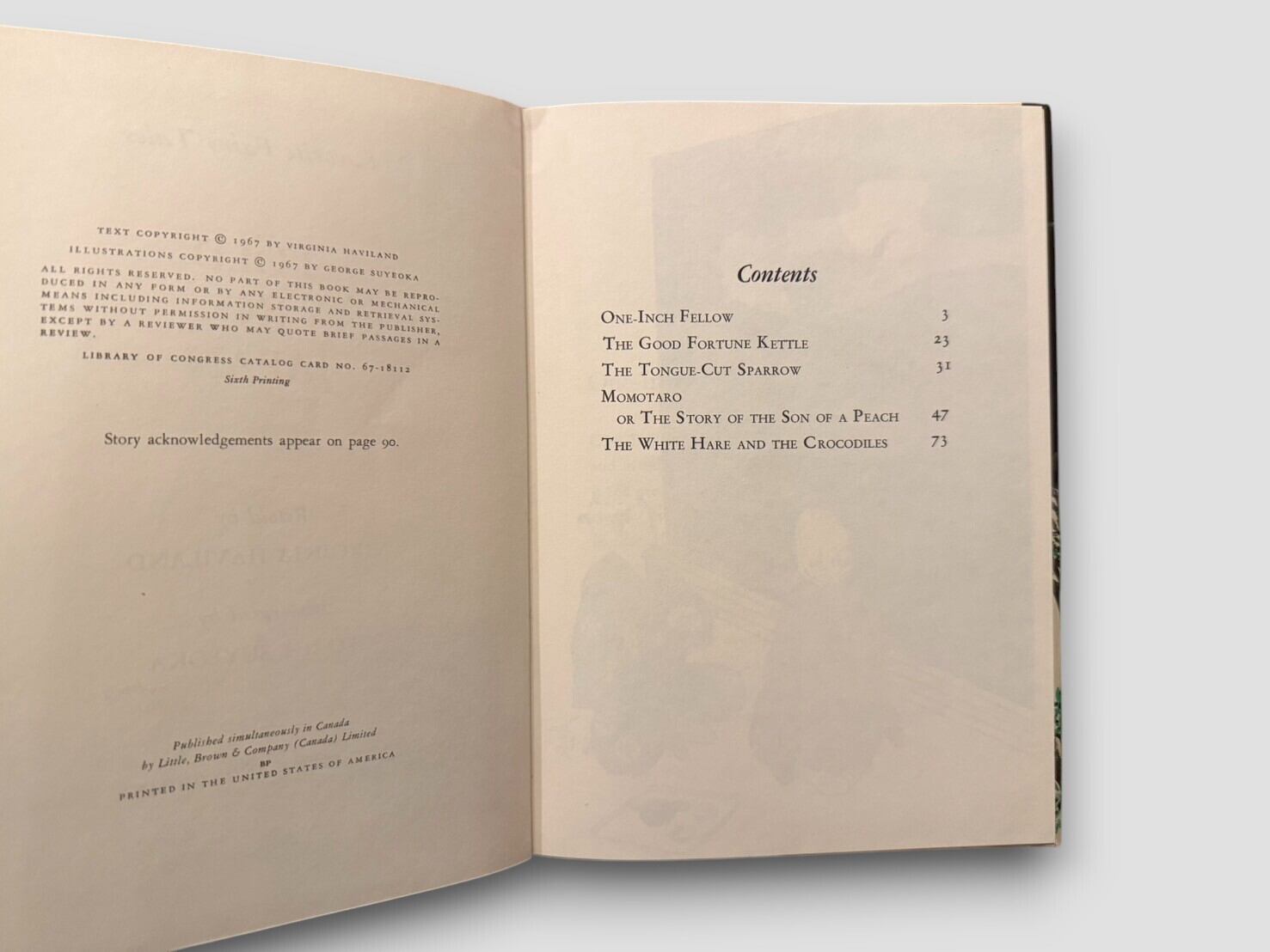 アメリカの児童文学編集者ヴァージニア・ハヴィランドによって再話された、日本の昔話集。桃太郎、一寸法師、舌切り雀、白兎など、海外でも愛されてきた6編の物語を、柔らかな語り口で英語に語り直した1冊。装画と挿絵は日系アメリカ人アーティスト、ジョージ・スエヨカが手がけ、和のモチーフを活かした色彩豊かな絵が物語の世界に花を添えている。1960年代に「世界の昔話」シリーズの一環として刊行された本書は、現在では入手困難な部類に入りつつあり、コレクターズ・アイテムとなっている。1967年刊行初版。