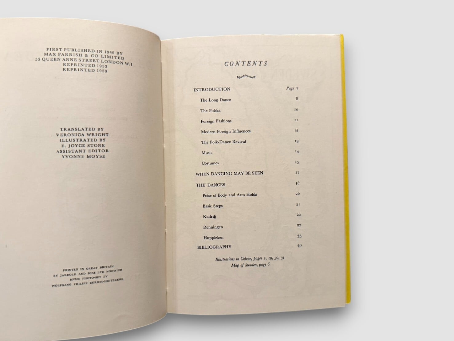 北欧スウェーデンに受け継がれる伝統舞踊の数々を紹介した、Handbooks of European National Dancesシリーズの中でも穏やかで品格ある一冊。著者エリック・サルヴェーンはスウェーデンの民俗舞踊の研究者として知られ、本書では「カドリール」「フップレカン」など、各地に根差した踊りの様式を音楽・衣装・所作の観点から丁寧に解説している。1959年刊行リプリント。