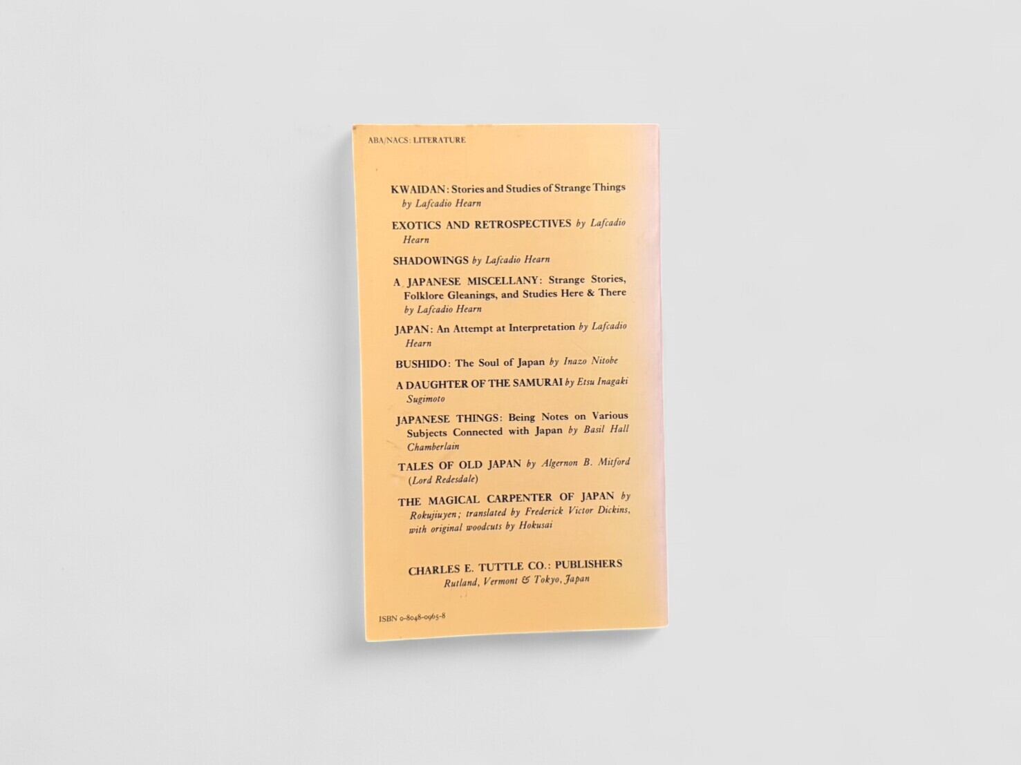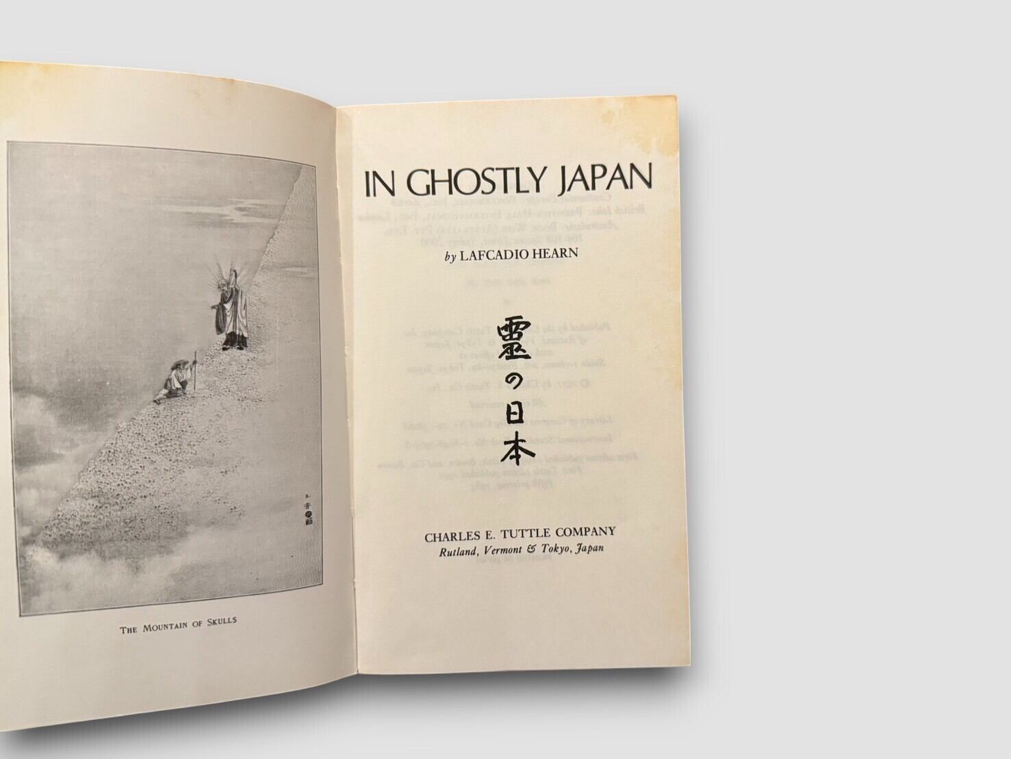 ラフカディオ・ハーンによる随筆集『In Ghostly Japan』。「Furisodé(振袖)」「Incense(香)」「Footprints of the Buddha(仏足跡)」「Ingwa-Banashi(因果話)」など、日本の宗教・風習・説話にまつわる15の小品が収録されている。本書は1971年にTuttle社から復刊された英語版の第5刷(1985年)。