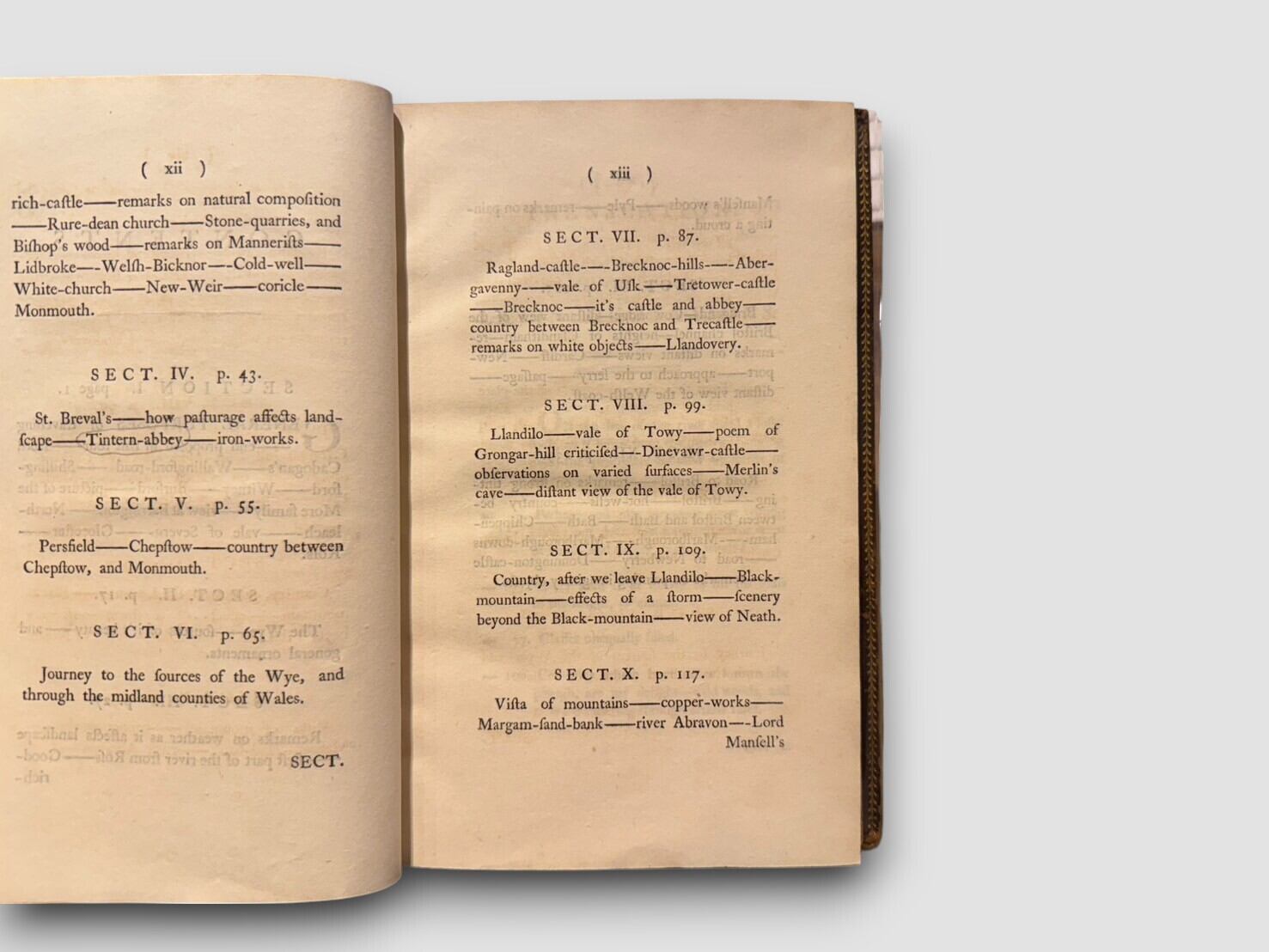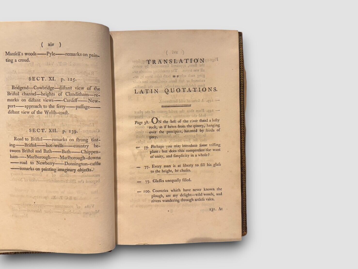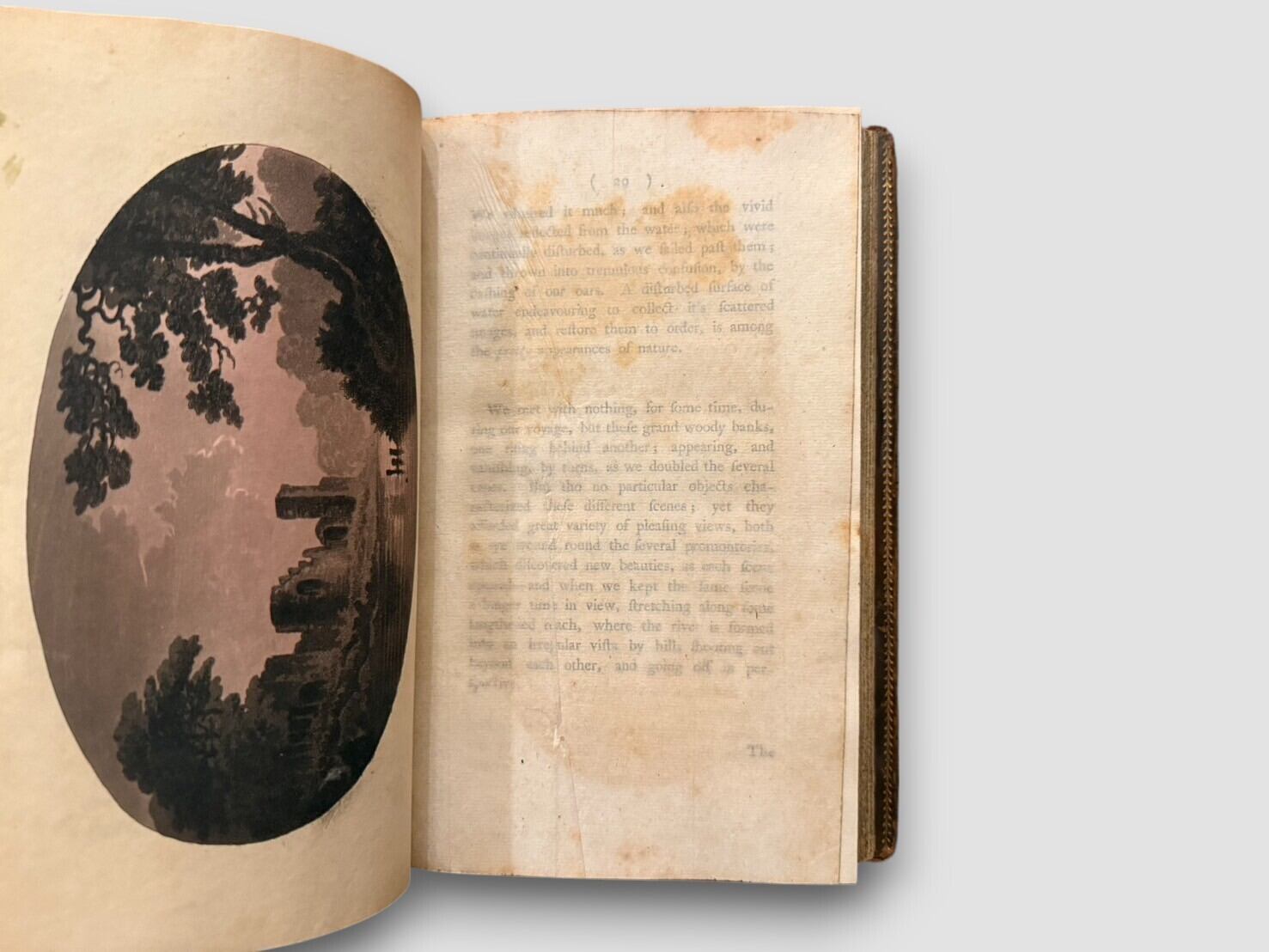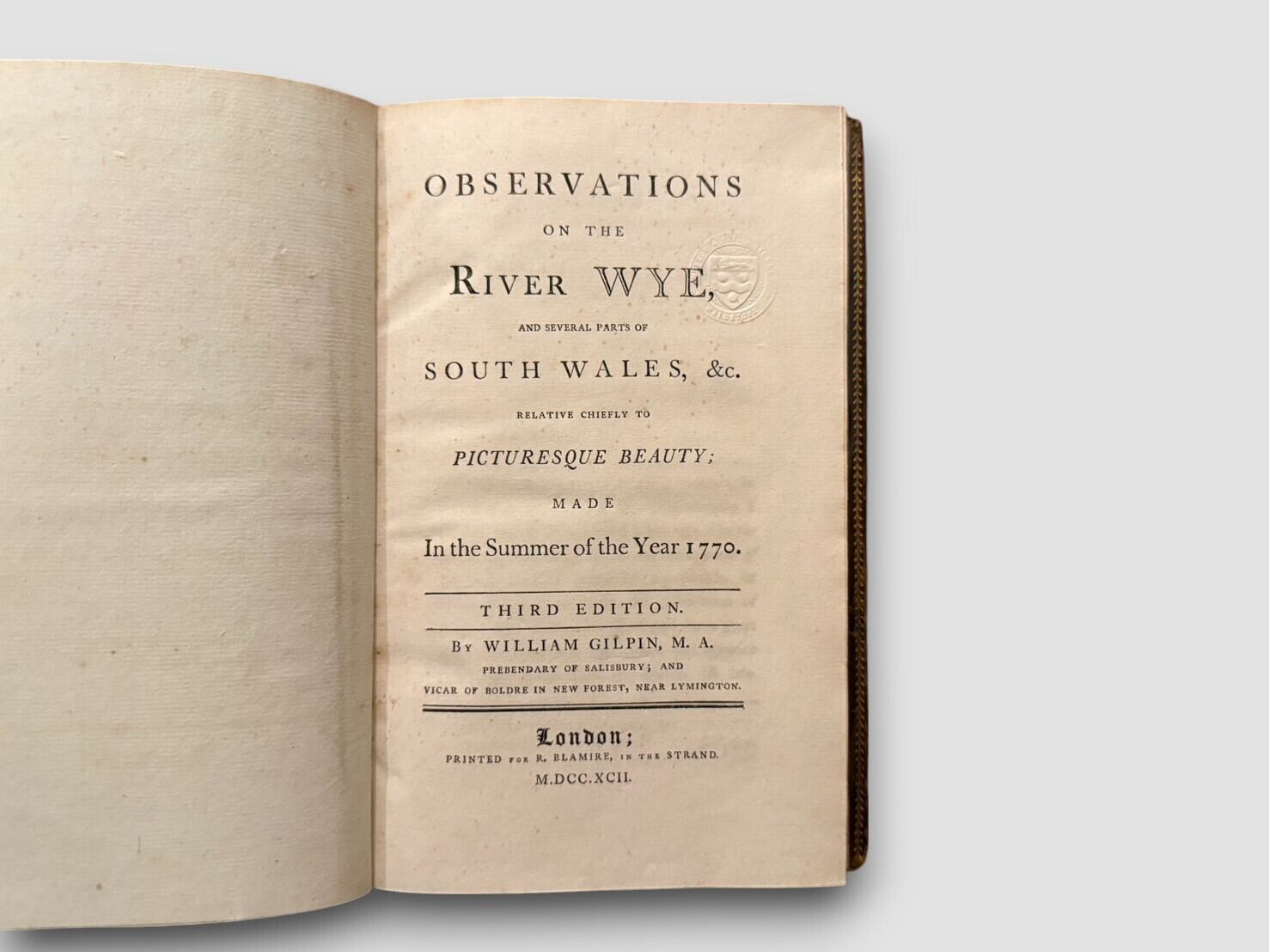 ウィリアム・ギルピンが1770年夏に行ったワイ川と南ウェールズ地方の旅行をもとに、風景の「ピクチャレスク(絵画的美)」という美学概念を通して綴った古典的紀行文学。本書は1792年に刊行された第三版(Third Edition)。17枚収録された図版、美麗な総革装丁、金箔の背装飾、見返しには華やかなマーブル紙、そして2点の蔵書票が貼付された、由緒ある一冊。
