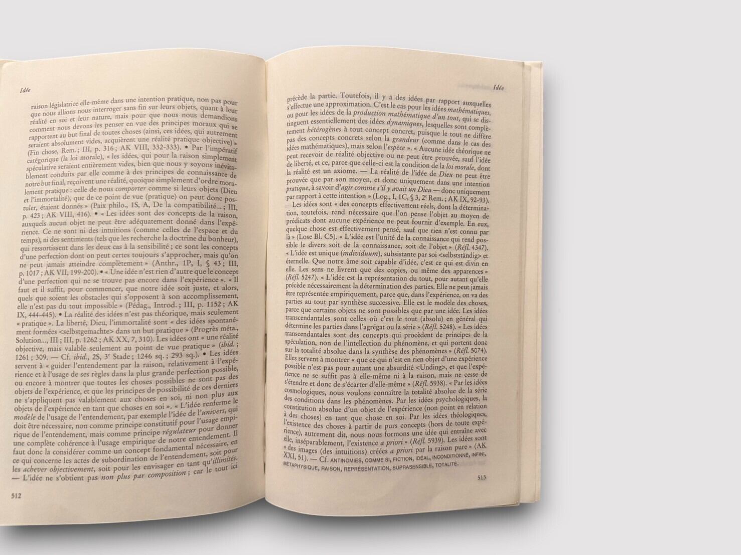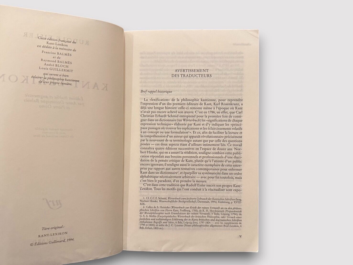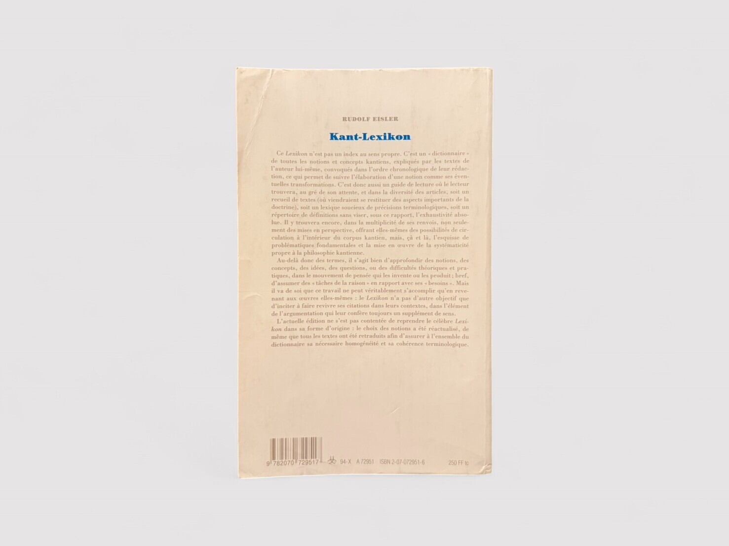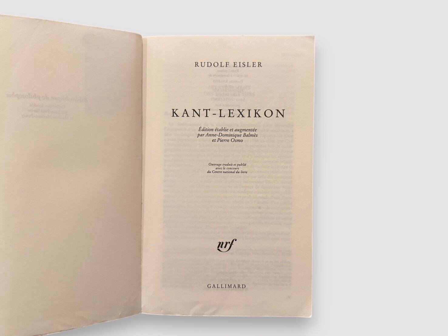 オーストリアの哲学者ルドルフ・アイスラーによって編纂されたカント用語辞典『Kant-Lexikon』(1904年)のフランス語版。Anne-Dominique BalmèsとPierre Osmoによる校訂増補版で、約500頁以上にわたり詳細かつ明晰な注釈が加えられている。カントの専門的な読解のための道標となる1冊。1994年刊行。
