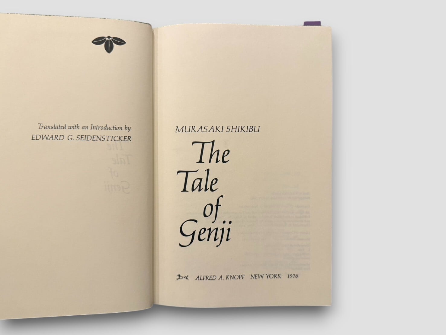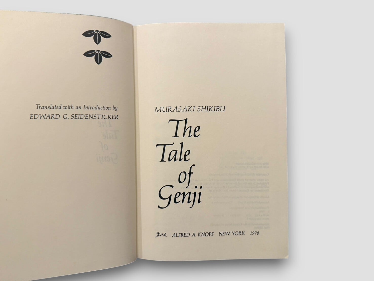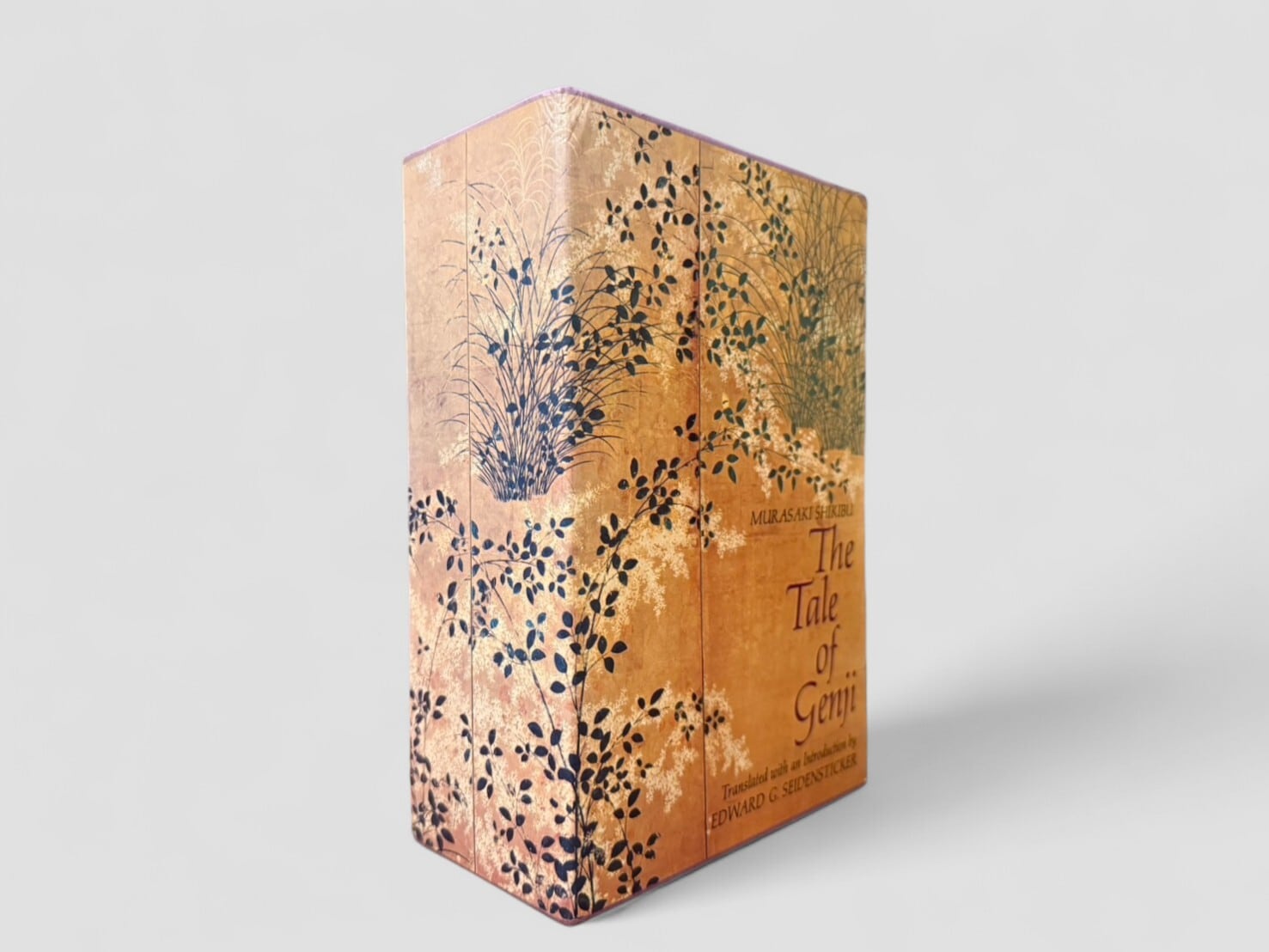 紫式部による平安時代の長編物語『源氏物語』全54帖をEdward G. Seidenstickerが現代英語へ訳出した決定版。構想・注釈・導入を含む2巻本で構成され、Alfred A. Knopf社より1976年に刊行された初版。原作の雅な語り口を損なうことなく、登場人物の心理や宮廷文化を鮮やかに伝える翻訳として世界的に高い評価を受けている。日本の伝統文様があしらわれたスリップケース付き。