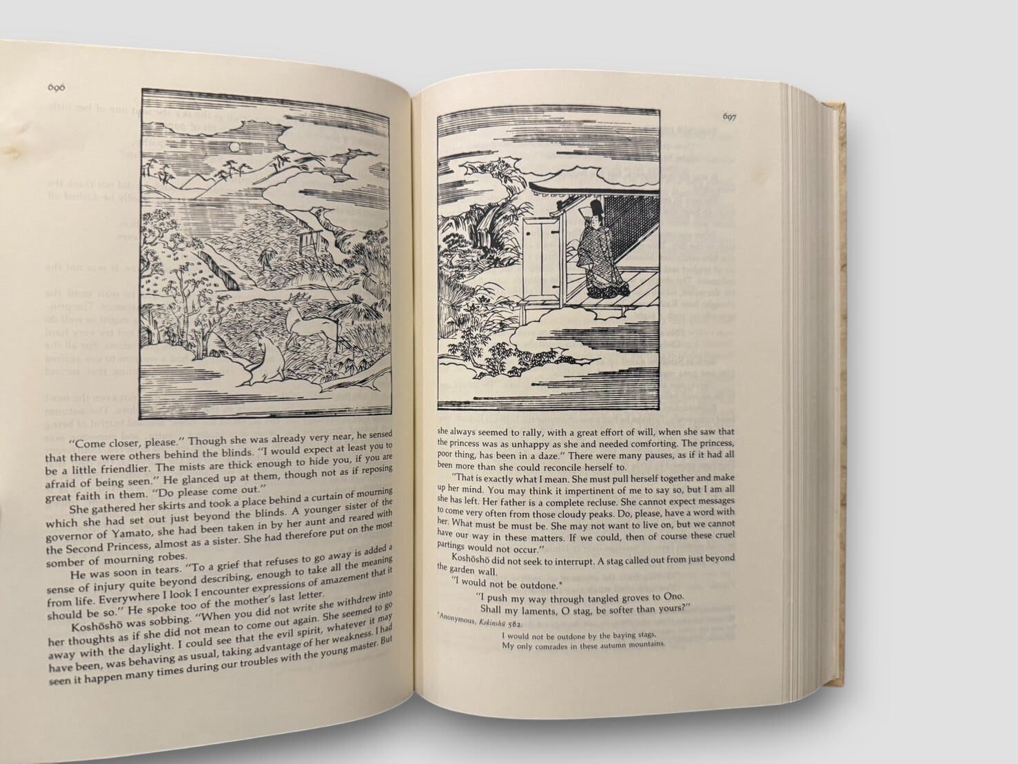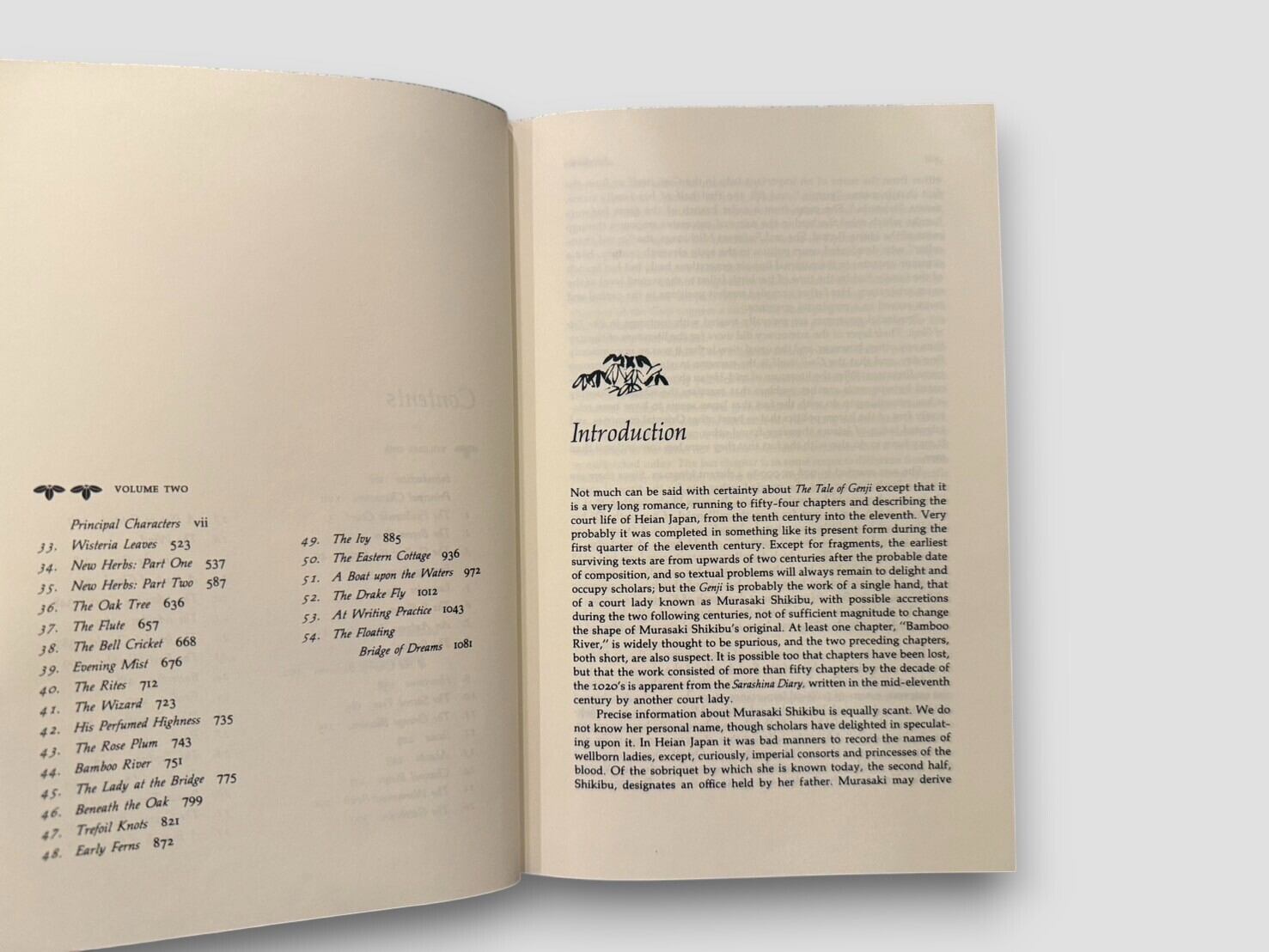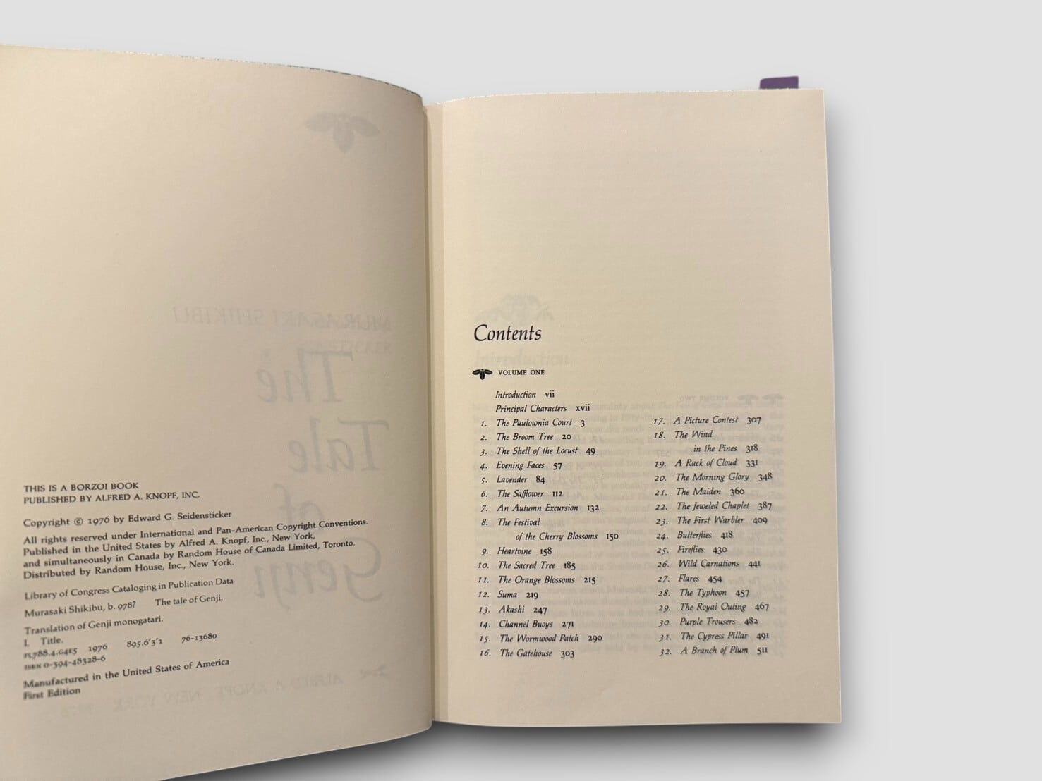 紫式部による平安時代の長編物語『源氏物語』全54帖をEdward G. Seidenstickerが現代英語へ訳出した決定版。構想・注釈・導入を含む2巻本で構成され、Alfred A. Knopf社より1976年に刊行された初版。原作の雅な語り口を損なうことなく、登場人物の心理や宮廷文化を鮮やかに伝える翻訳として世界的に高い評価を受けている。日本の伝統文様があしらわれたスリップケース付き。