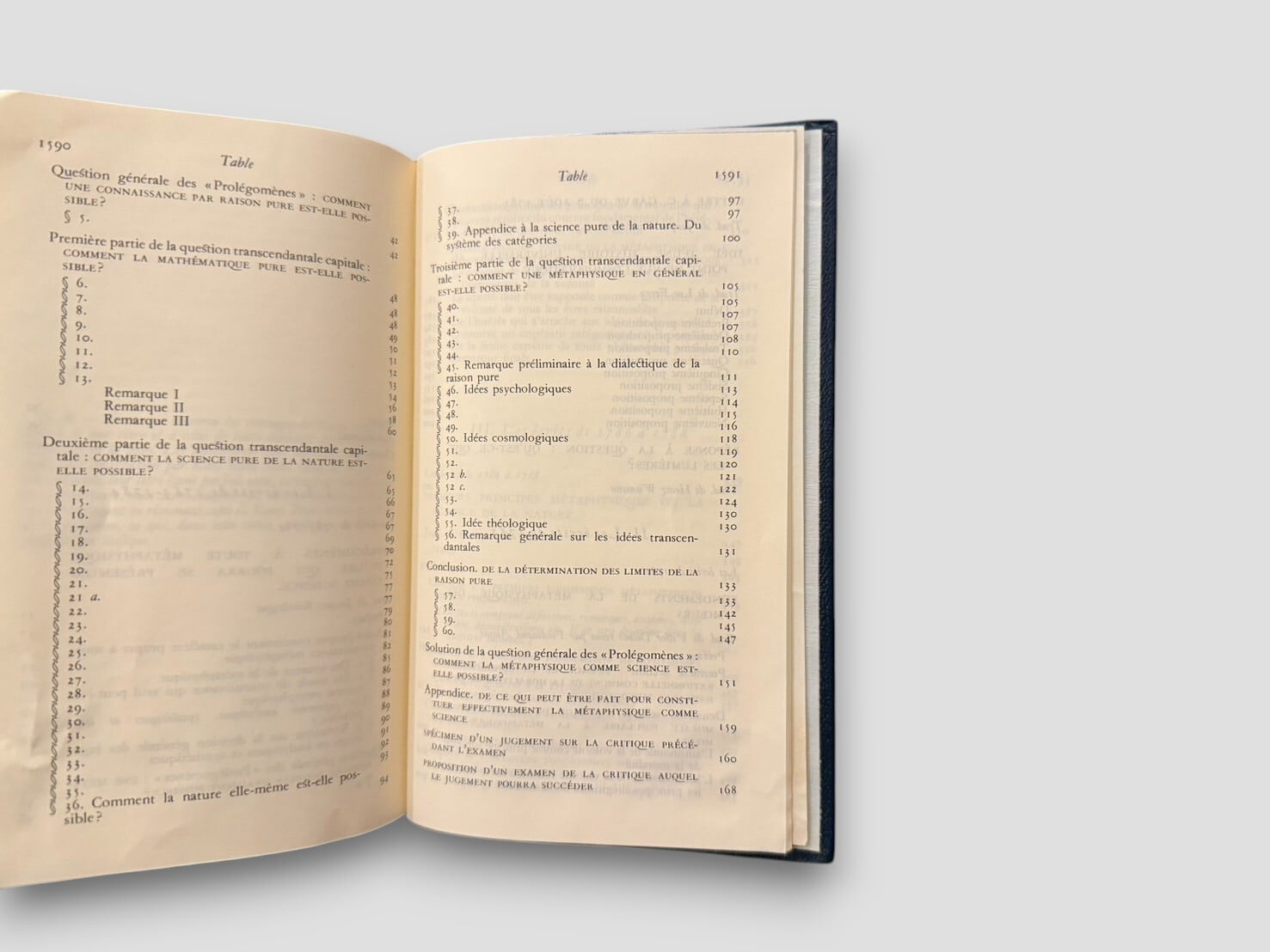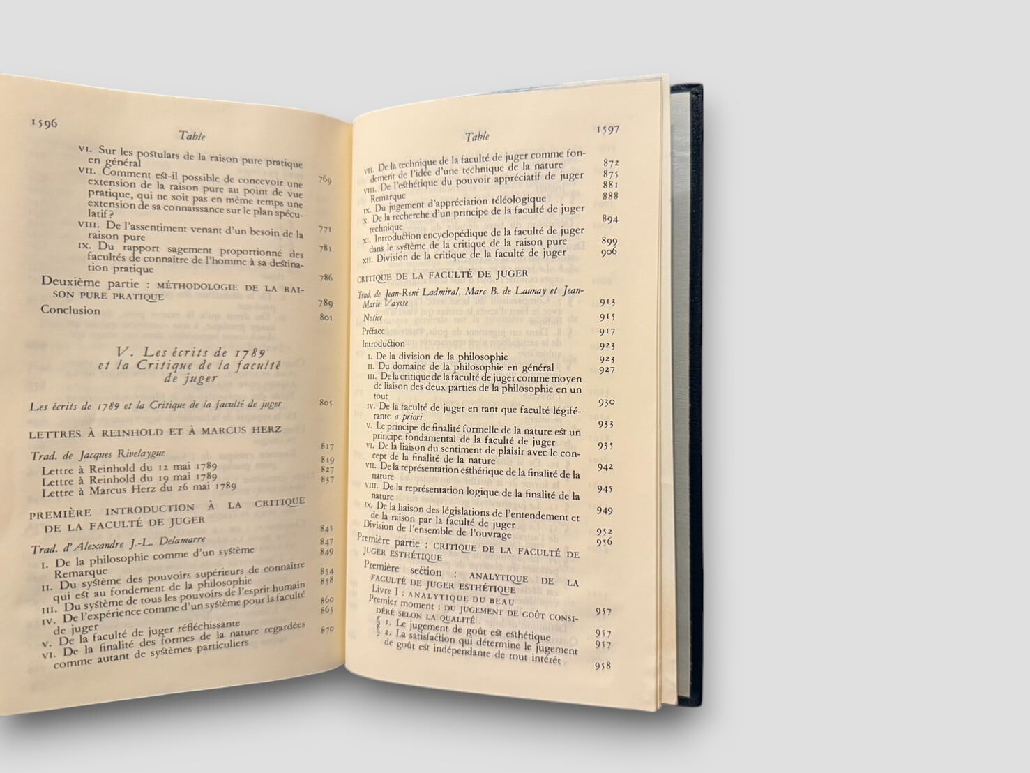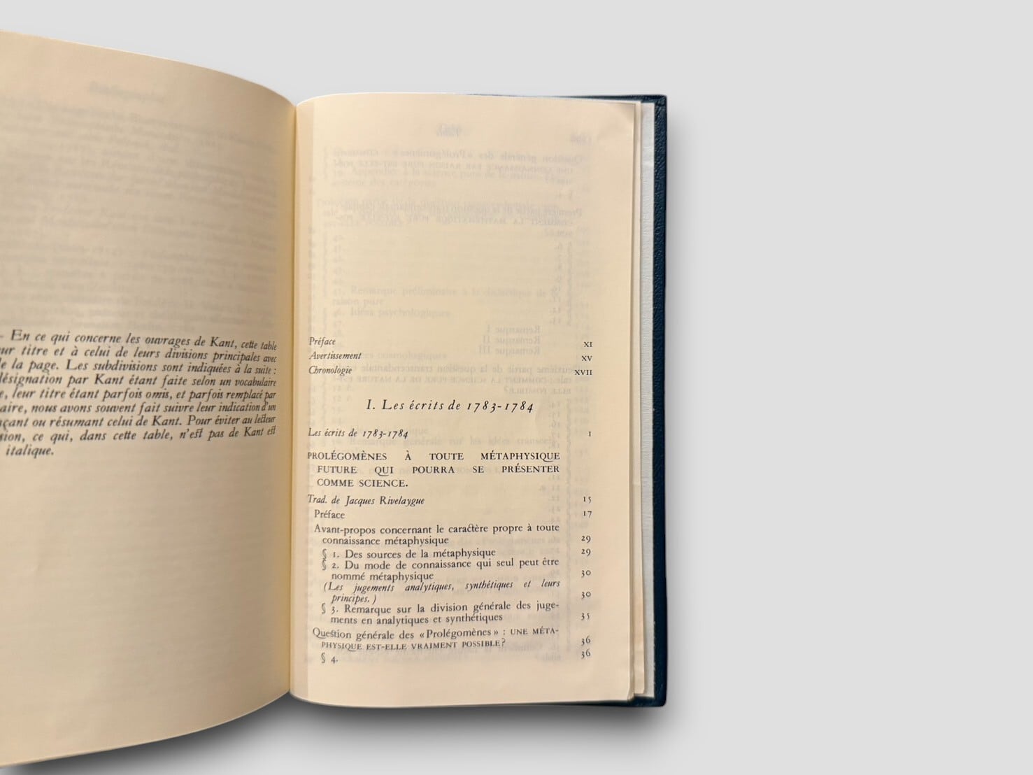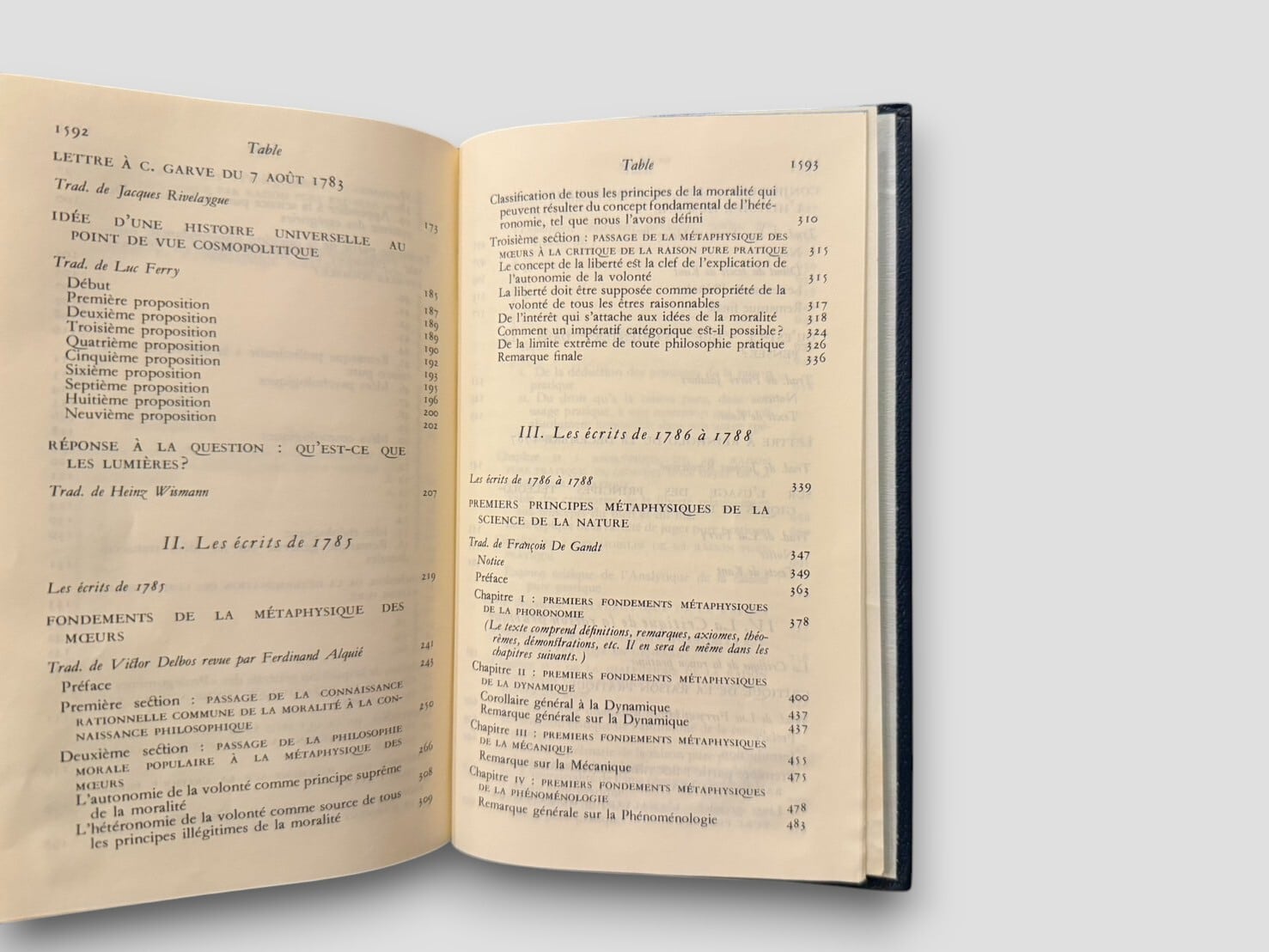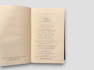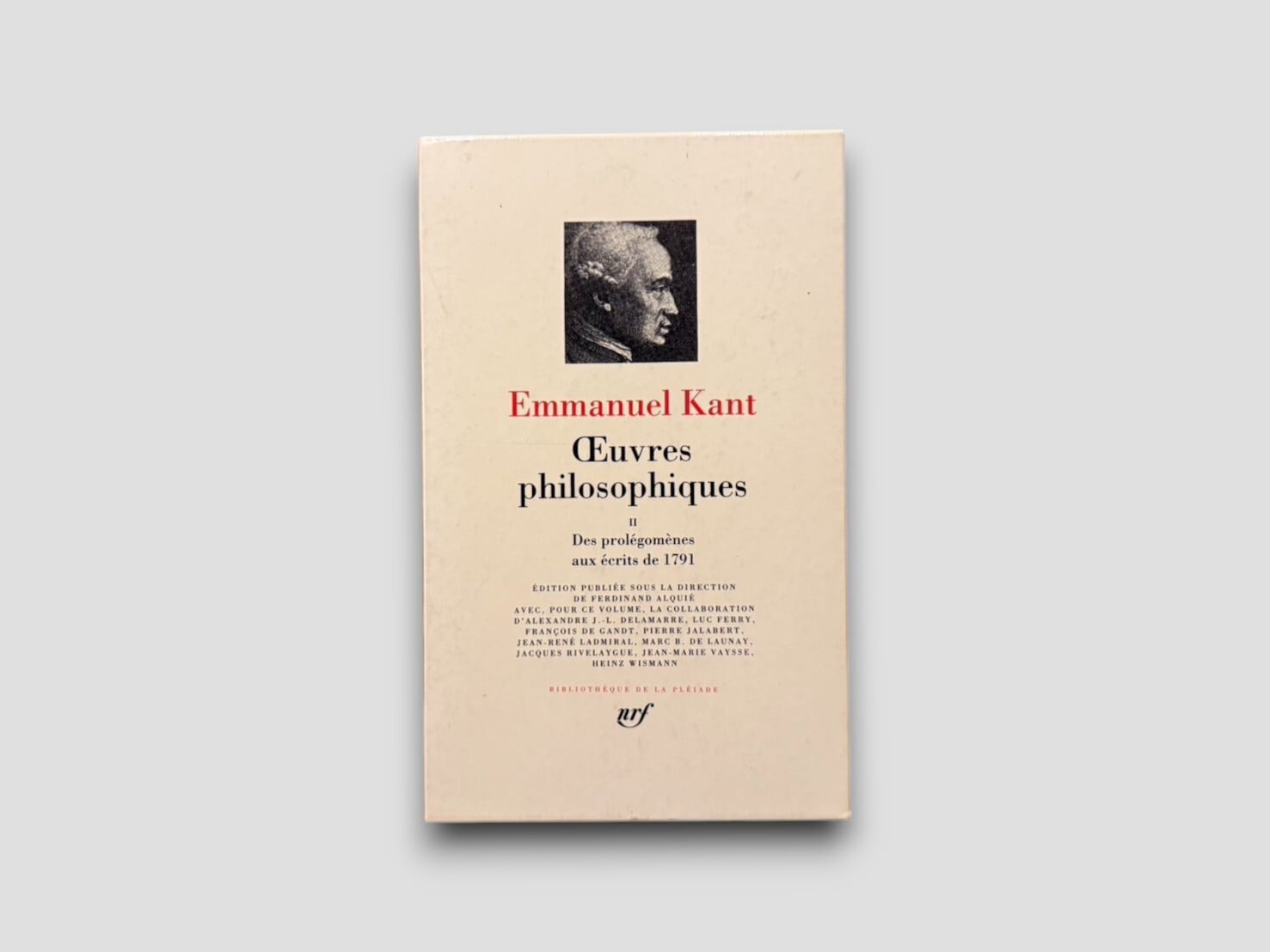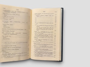 フランス語訳と豊富な注釈で構成された、ビブリオテーク・ドゥ・ラ・プレイヤッド叢書の一冊。本巻には『プロレゴメナ』『啓蒙とは何か』『実践理性批判』『判断力批判』など、カント哲学の中期〜後期の主要著作が精選されて収録されている。翻訳・編集にはジャック・リヴェラリューグ、リュック・フェリー、アレクサンドル・ドラメールほか錚々たる哲学者たちが参加。知性と美を兼ね備えた一冊。1985年刊行。