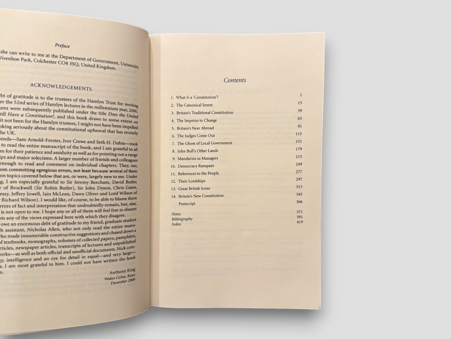 英国憲法の核心を、鋭い知性と比類なき明晰さで読み解いた名著。書き下ろしの全体構成は「憲法とは何か」から始まり、「慣習法」「地方政府の幽霊」「上院改革」「新しい英国憲法の輪郭」など多岐にわたる論点を網羅。著者アンソニー・キングは、エセックス大学の名誉教授であり、BBCでも政治解説を担当した英国政治研究の第一人者。2010年刊行再版。