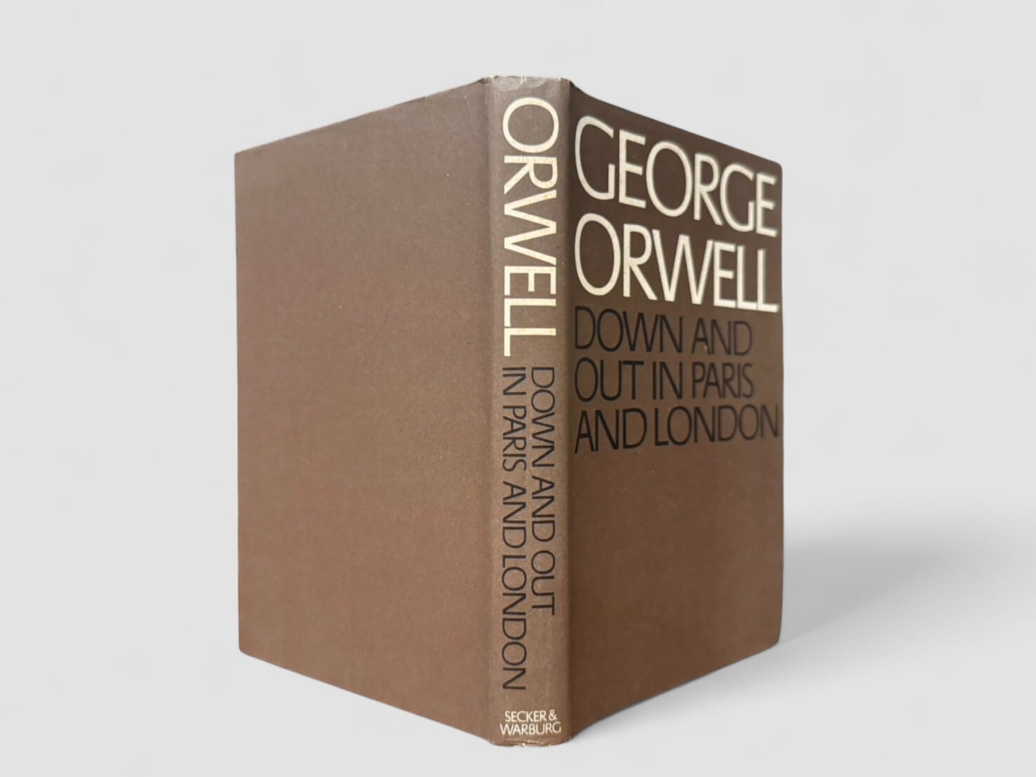 ジョージ・オーウェルのデビュー作『パリ・ロンドン放浪記』。オーウェル自身の実体験をもとに、貧困のなかで生きる人々の暮らしをパリとロンドンを舞台に描いたルポルタージュ的名作。特に労働者階級の目線から描かれる日常は、のちの『動物農場』や『一九八四年』にも通じる社会への鋭い批評精神を感じさせる。本書は1973年に刊行された再版で、ブラウンのタイポグラフィ・デザインのダストジャケット付き。現代でも読み継がれる、オーウェル思想の原点ともいえる一冊。