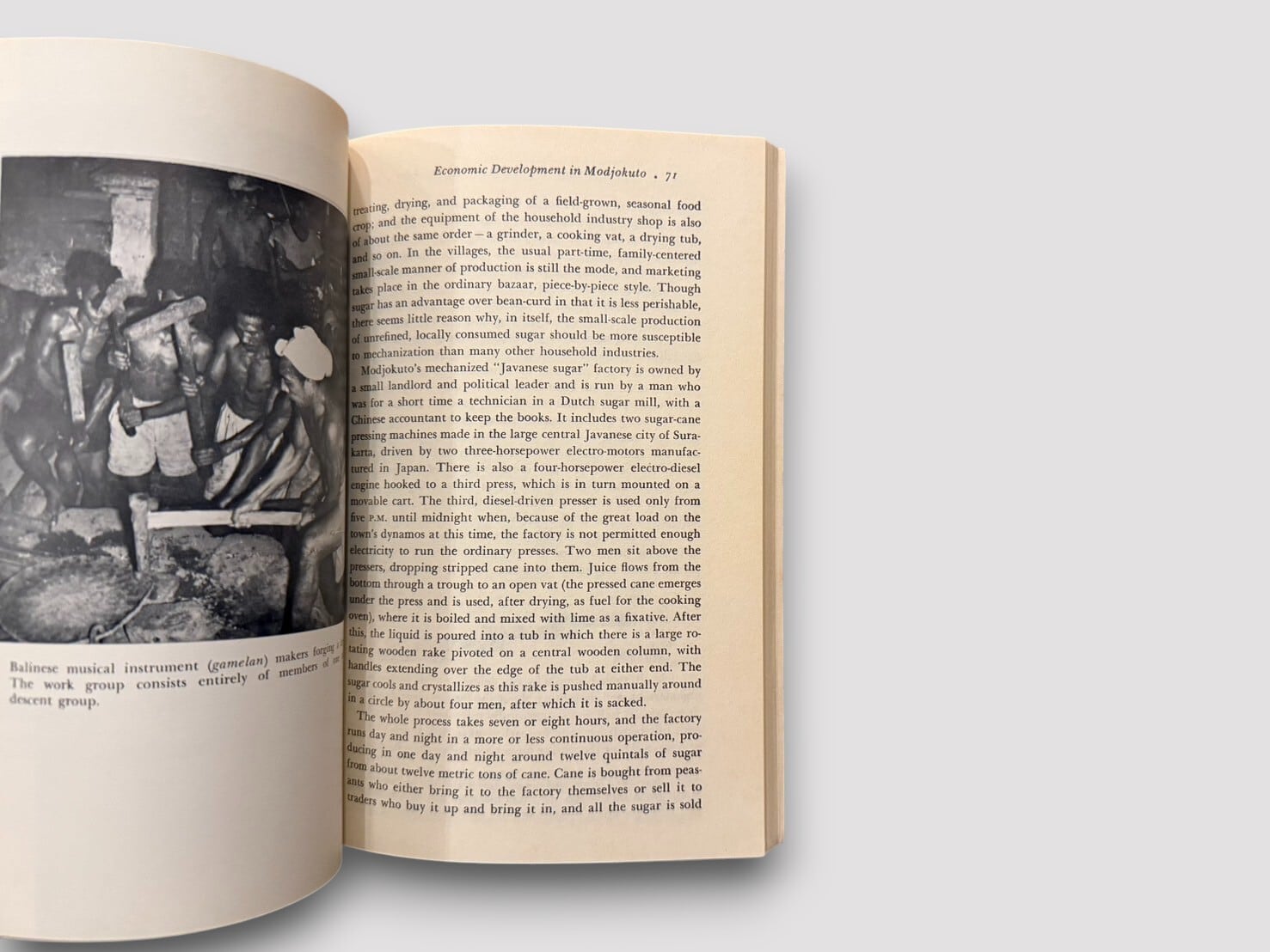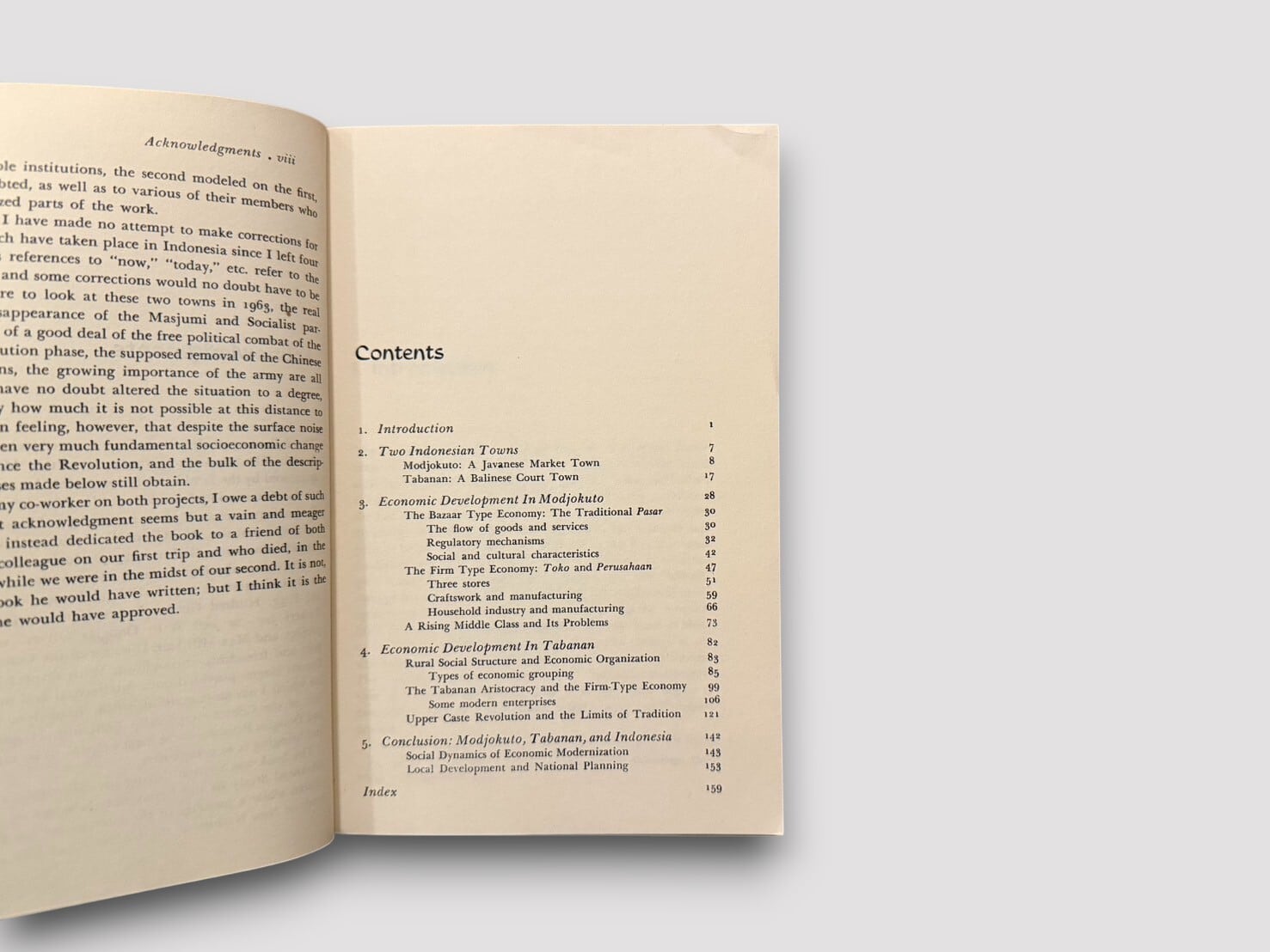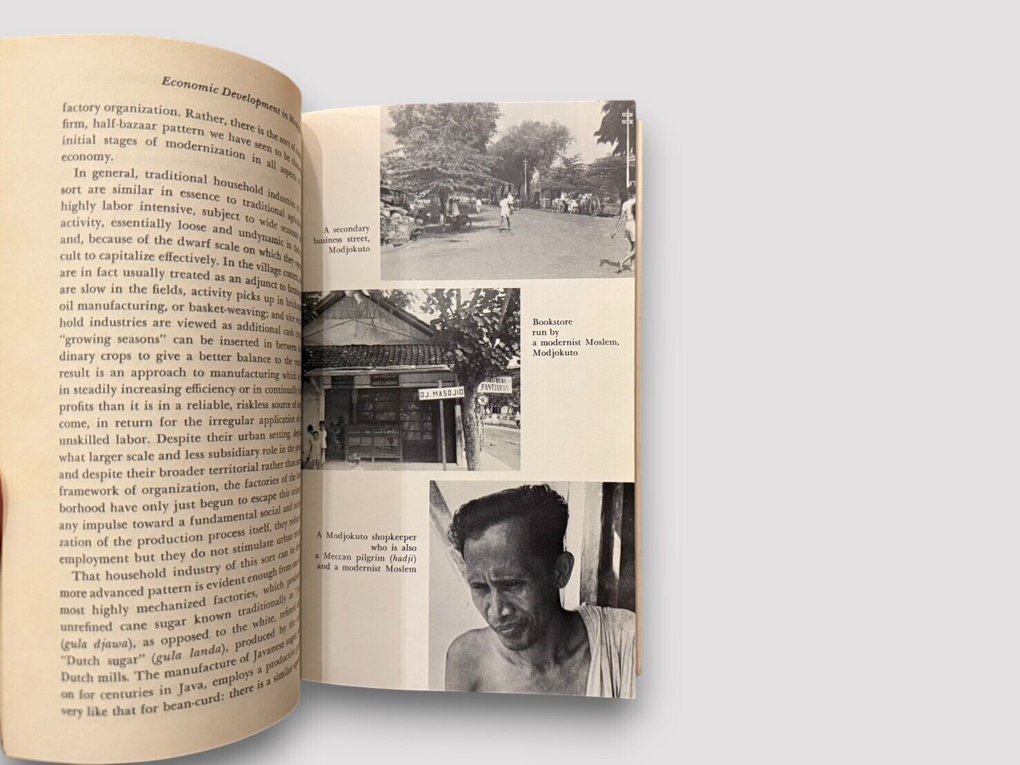 インドネシアの二つの地方都市、マジョケルトとモジョケルトを舞台に、それぞれの町が「近代化(modernization)」にどう適応していったのかを、人類学の視点から丁寧に観察・記述した1冊。全5章構成、巻末に索引付き。1963年刊行初版。