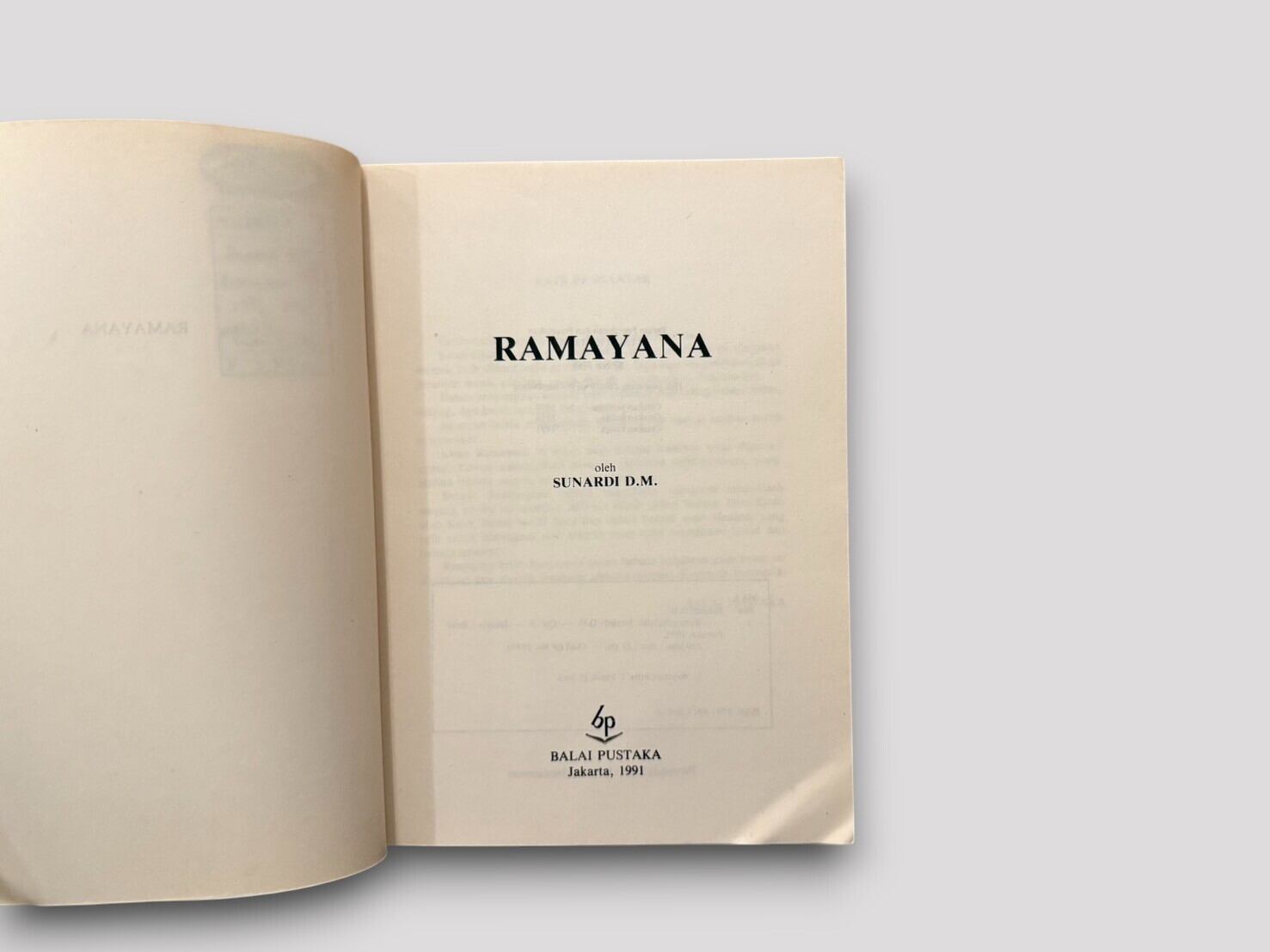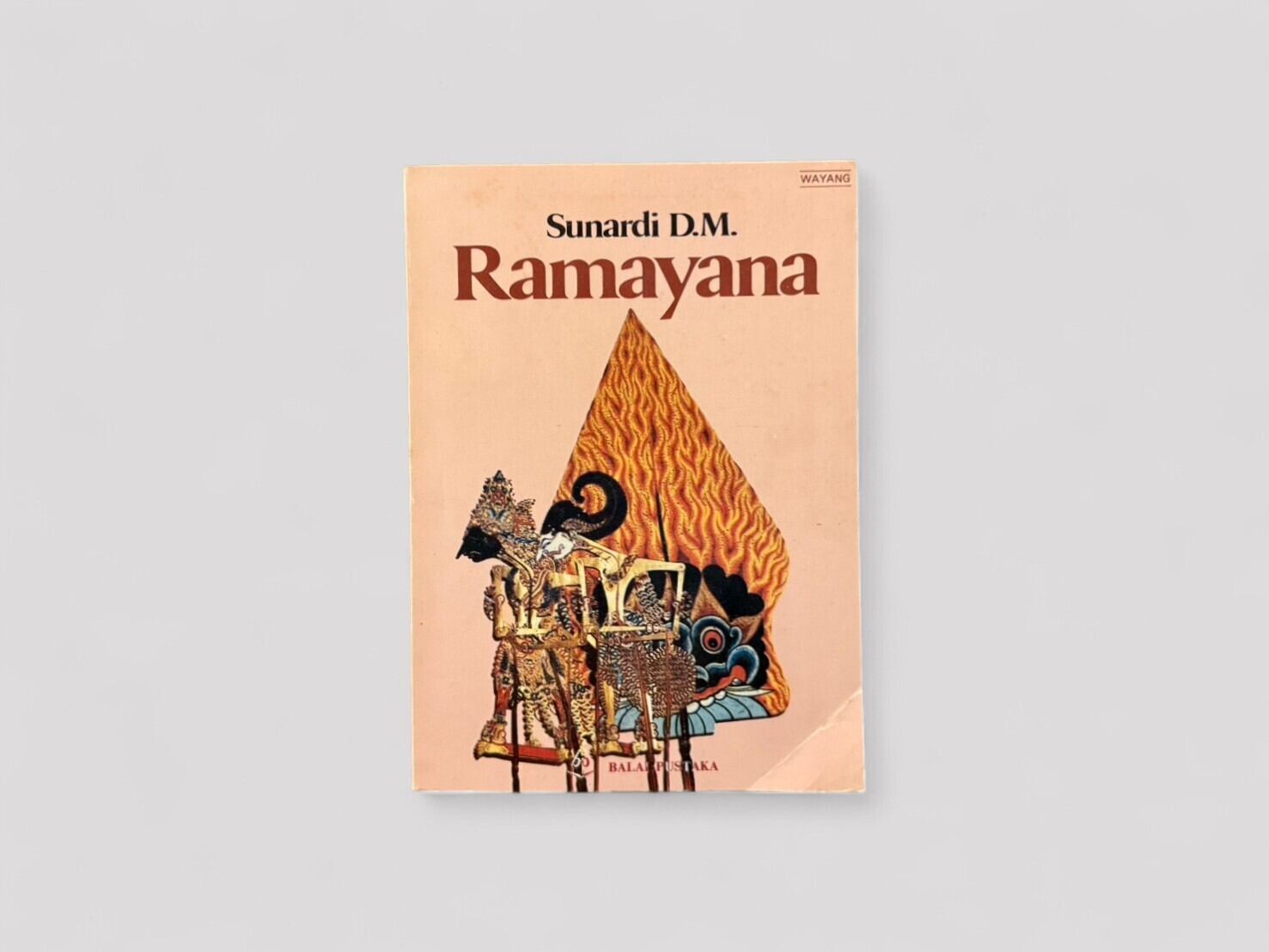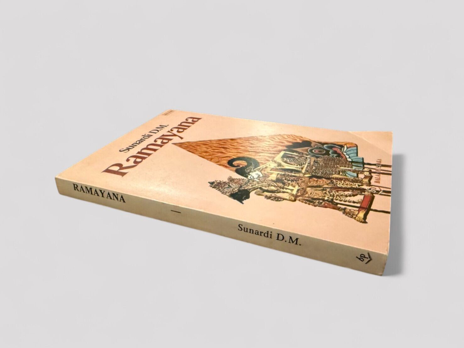インドネシアの伝統的な影絵芝居「ワヤン」の演目として広く親しまれてきた『ラーマーヤナ』を、インドネシア語で平易に語り直した一冊。著者スナルディ D.M. による再話は、古代インドの叙事詩に独自の色彩を加え、特にジャワの文芸文化と融合した形で物語を描き出している。影絵芝居の演目らしく、英雄ラーマと魔王ラーワナの対決、シータの誘拐、ハヌマーンの活躍など、壮大な冒険譚が親しみやすい語り口で展開される。表紙にはワヤン人形を描いた鮮やかな図像を用い、文化的背景を視覚的にも楽しめる造本となっている。1991年刊行第3刷。