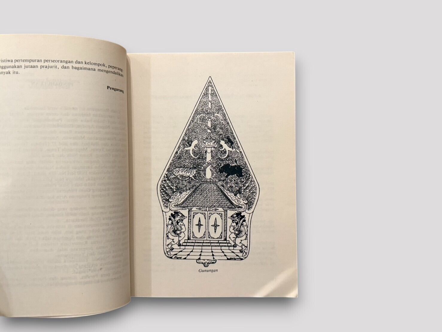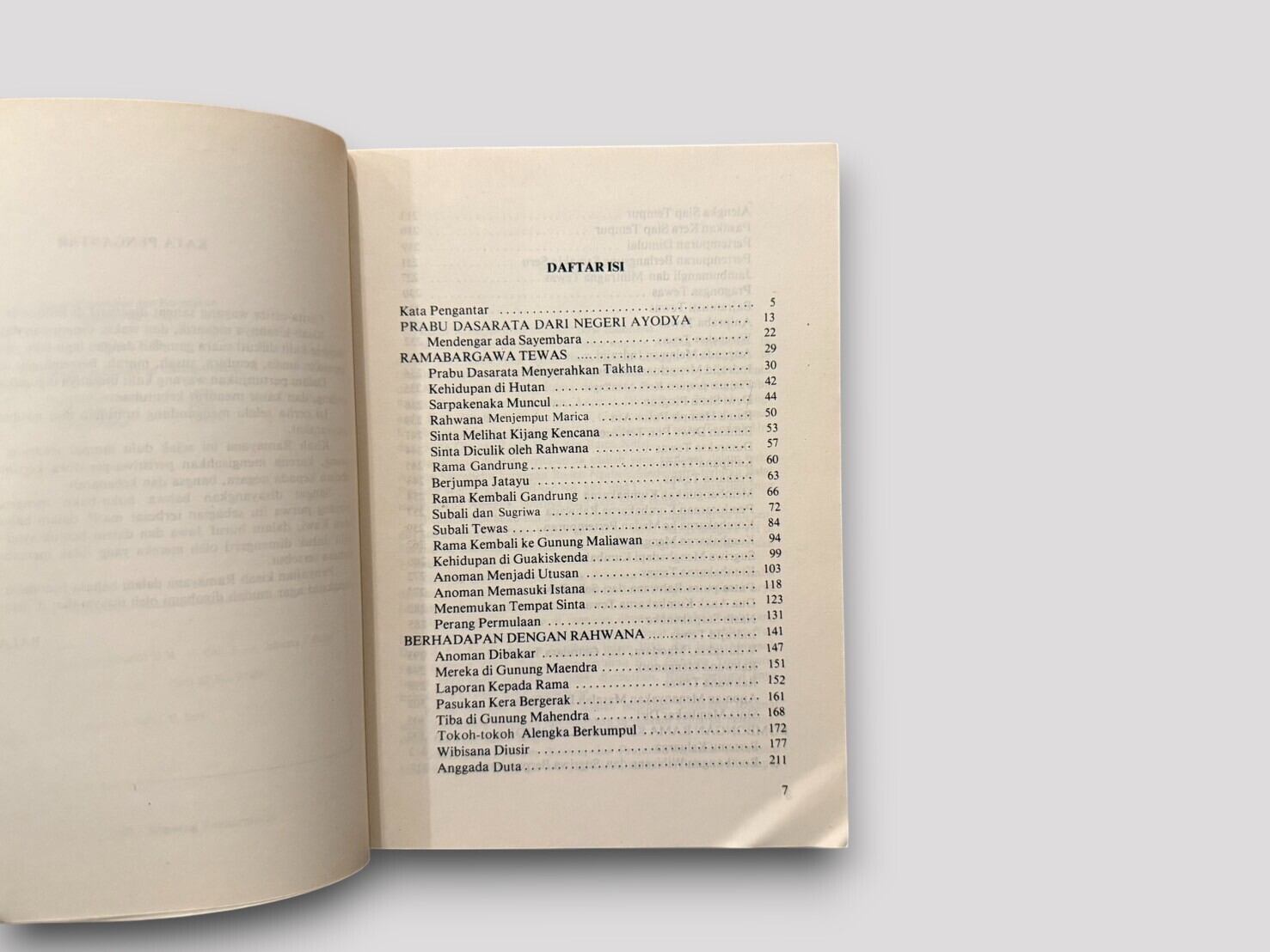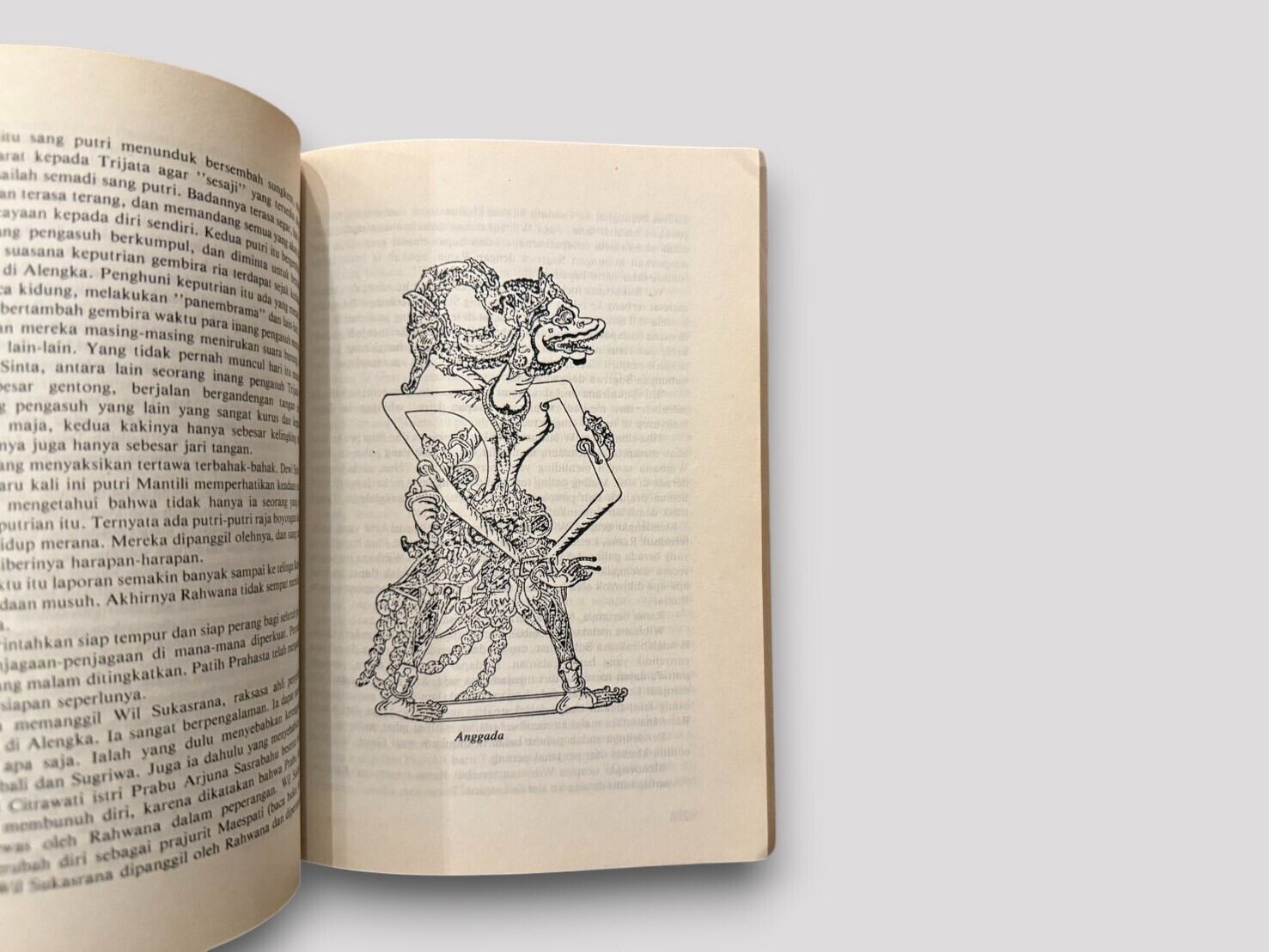 インドネシアの伝統的な影絵芝居「ワヤン」の演目として広く親しまれてきた『ラーマーヤナ』を、インドネシア語で平易に語り直した一冊。著者スナルディ D.M. による再話は、古代インドの叙事詩に独自の色彩を加え、特にジャワの文芸文化と融合した形で物語を描き出している。影絵芝居の演目らしく、英雄ラーマと魔王ラーワナの対決、シータの誘拐、ハヌマーンの活躍など、壮大な冒険譚が親しみやすい語り口で展開される。表紙にはワヤン人形を描いた鮮やかな図像を用い、文化的背景を視覚的にも楽しめる造本となっている。1991年刊行第3刷。
