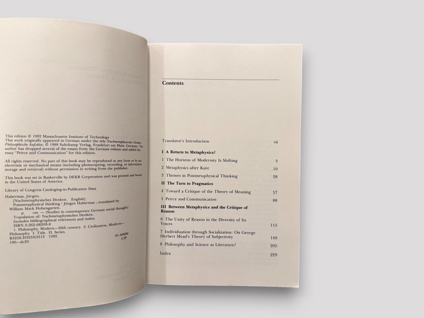 【SG170】【FIRST ENGLISH EDITION】Postmetaphysical Thinking: Philosophical Essays(1992) / Jürgen Habermas
