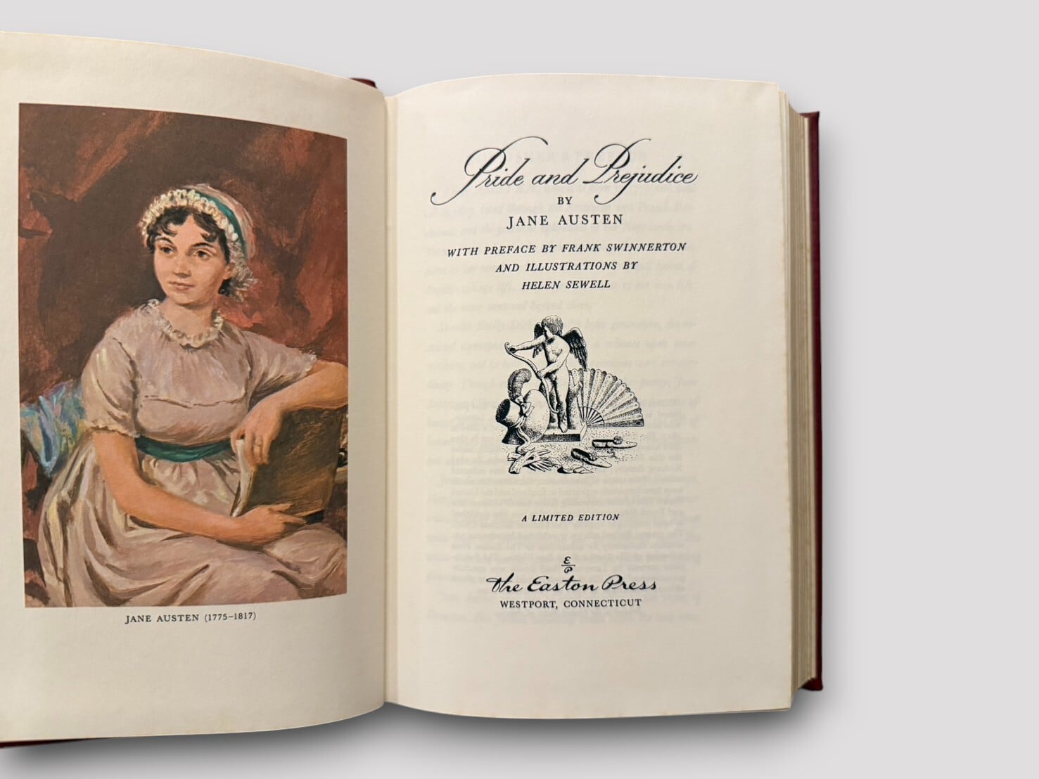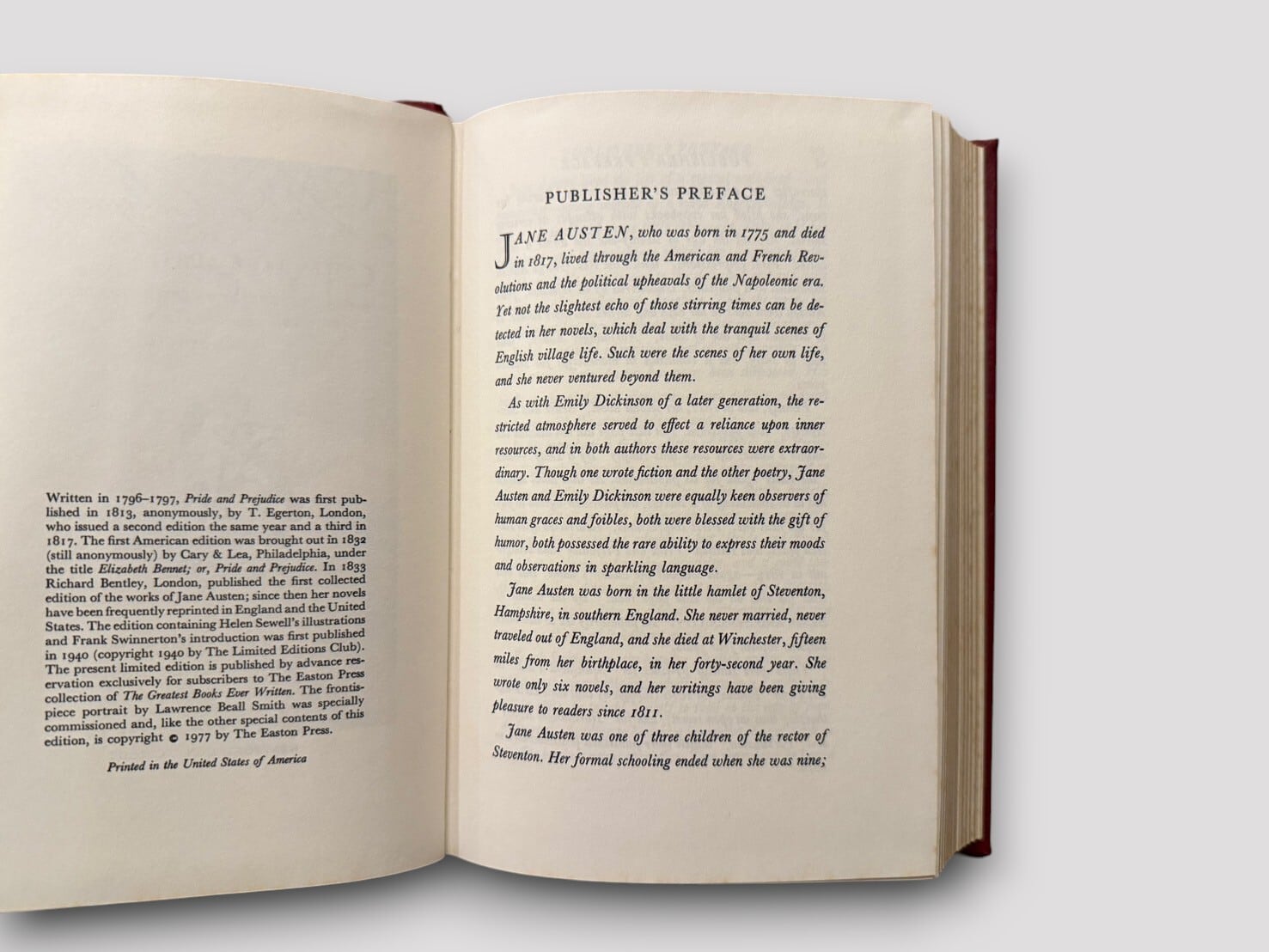イーストン・プレスより刊行された限定豪華本シリーズ「The Greatest Books Ever Written」の一冊。ジェイン・オースティンによる英国文学の名作『Pride and Prejudice(高慢と偏見)』を、布見返し・金箔装飾入りの本革装丁・三方金仕上げで荘厳に仕立てた逸品。1977年刊行。
