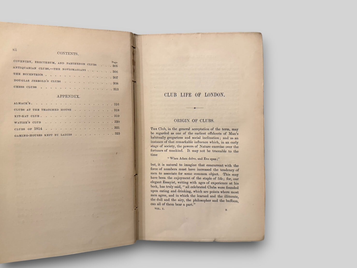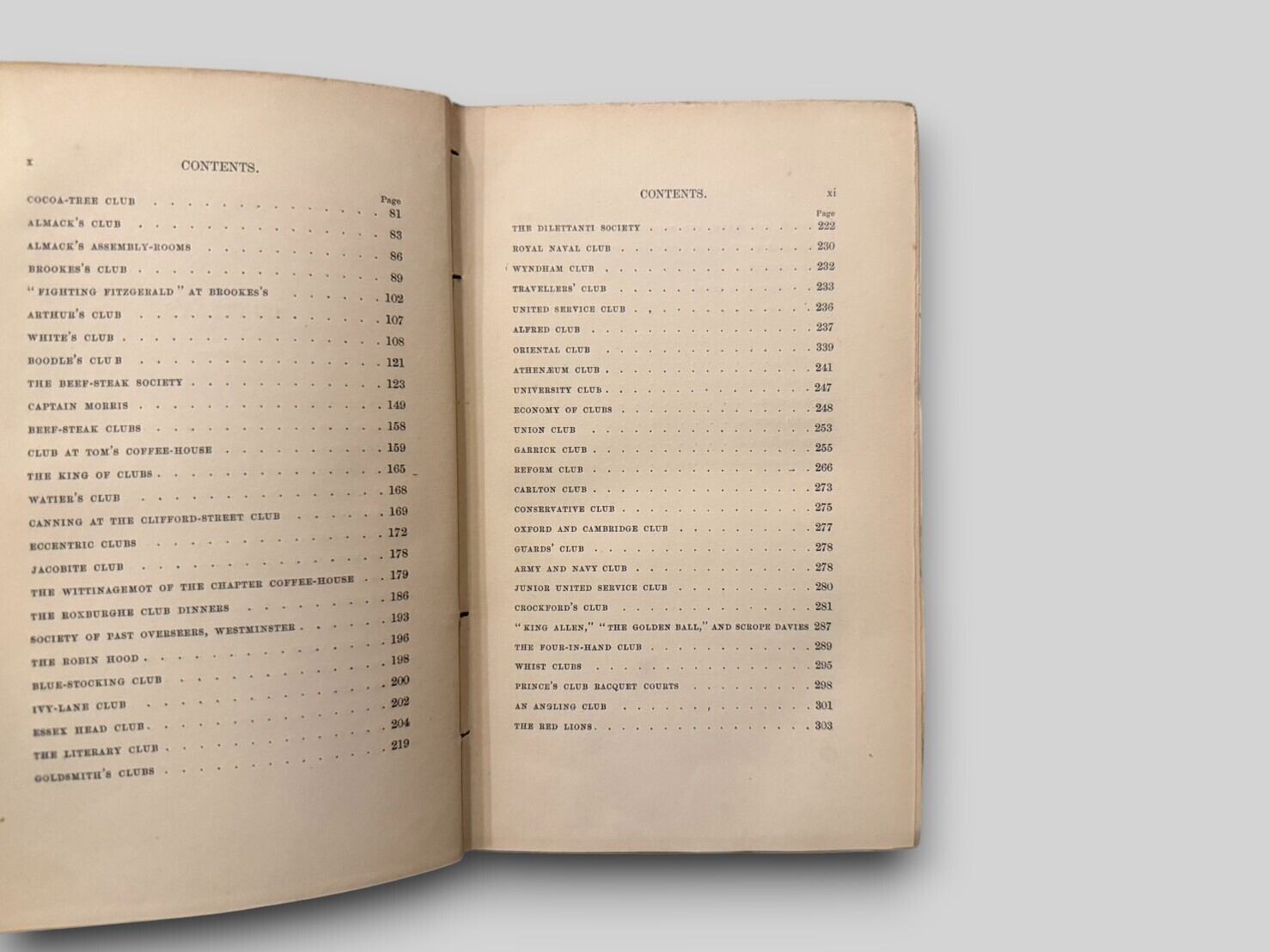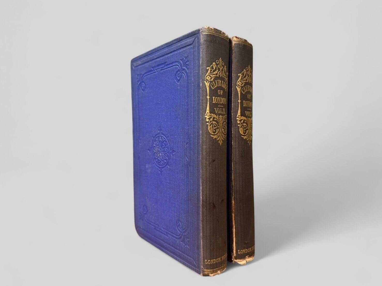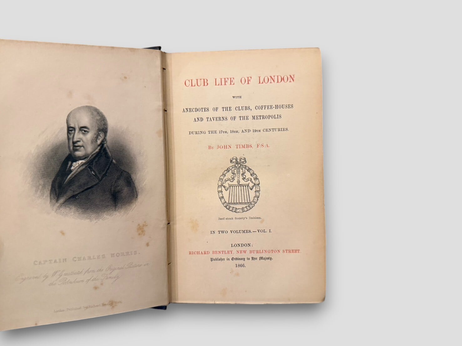 ホワイトズ・クラブ、ブルックス・クラブ、ブードルズ・クラブなどの著名な社交クラブ、政治家・文学者・芸術家が集う場から、庶民的な酒場や風変わりな会員制組織まで、多様な社交空間を網羅。当時の都市生活や文化、風俗の全貌を生き生きと記録している。各巻にはクラブの起源や特徴、著名な会員、逸話、時代背景が詳細に綴られ、Vol. I 巻頭にキャプテン・チャールズ・モリス、Vol. II 巻頭にジョージ・コールマンの挿絵肖像を収録。加えて、Vol. I には「Mermaid Club」「Apollo Club」「Early Political Clubs」など初期クラブの章、Vol. II には「Early Coffee-Houses」「Lloyd’s Coffee-House」などのコーヒーハウス文化や、「Mermaid Tavern」「White Hart Tavern」「Globe Tavern」などのタヴァーン文化を扱う章を収録し、歴史・都市文化・風俗史の研究資料としても価値の高い一組。