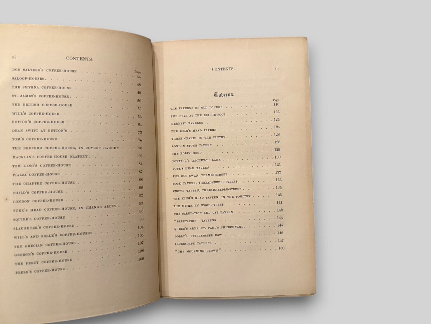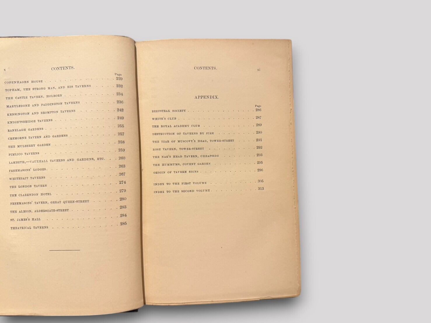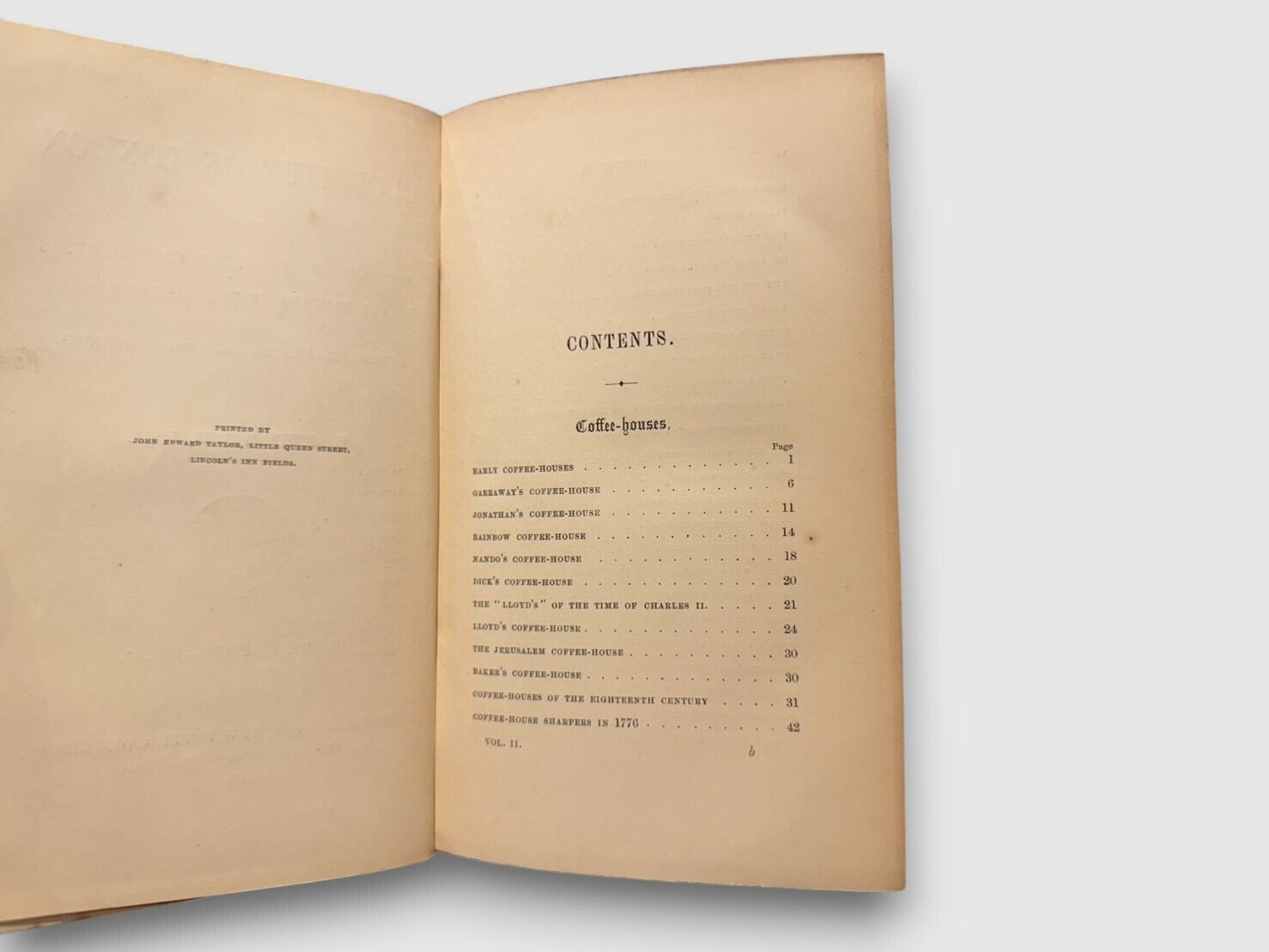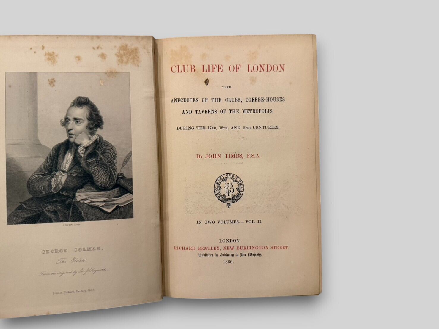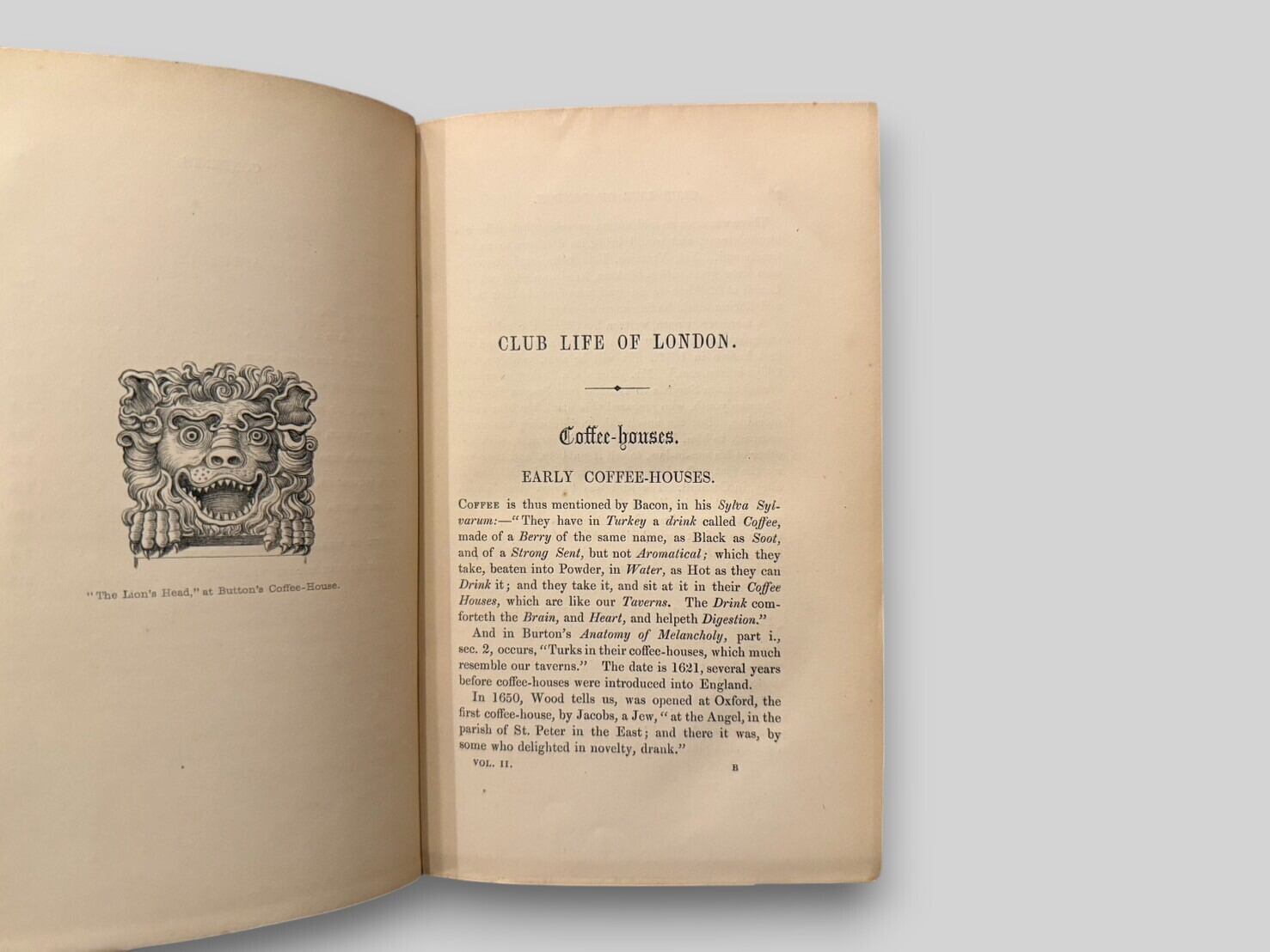 19世紀英国の歴史・風俗関係著述家ジョン・ティムズによる、ロンドンのクラブ、コーヒーハウス、タヴァーン(酒場)文化を17〜19世紀を通して描いた全2巻セット。1866年刊行貴重な初版。