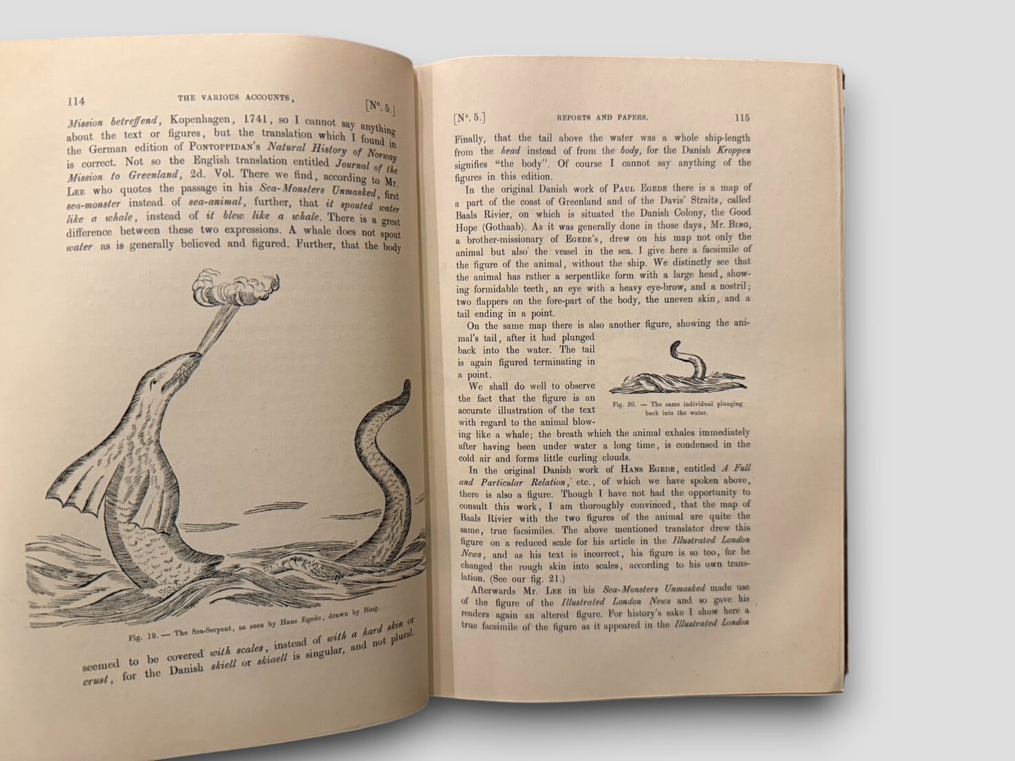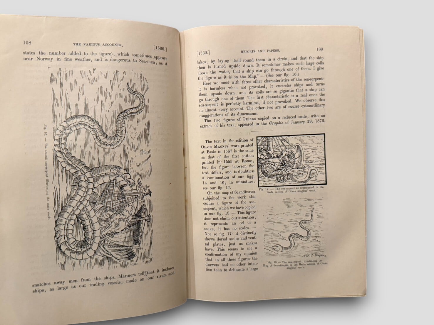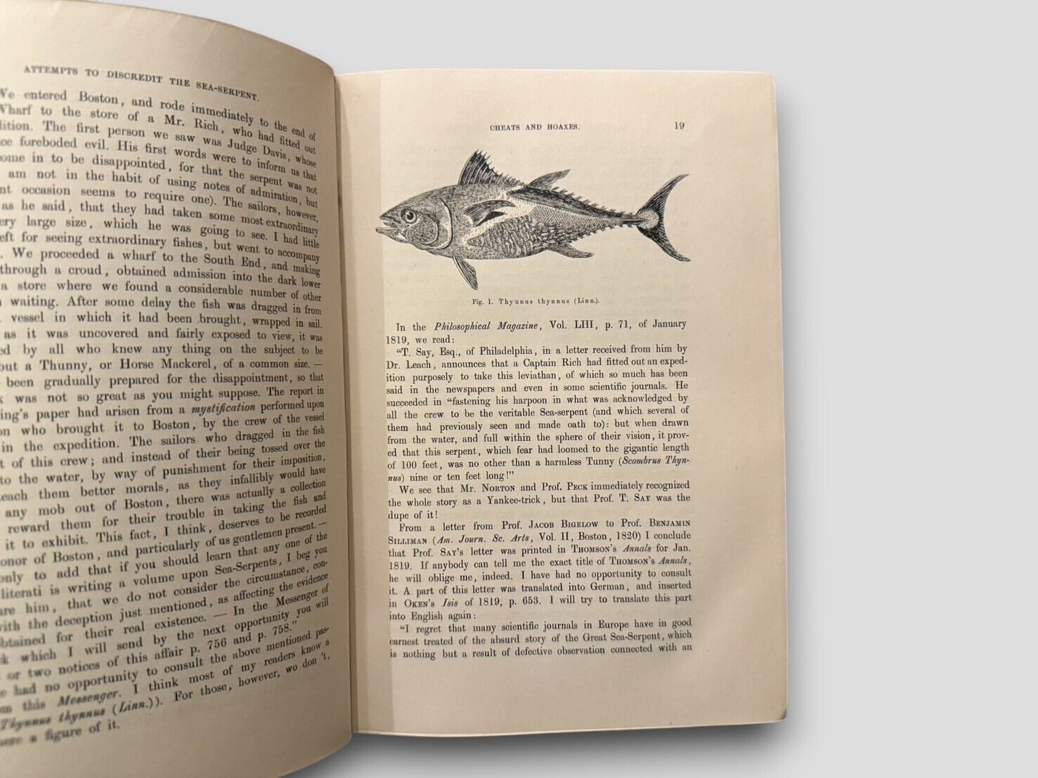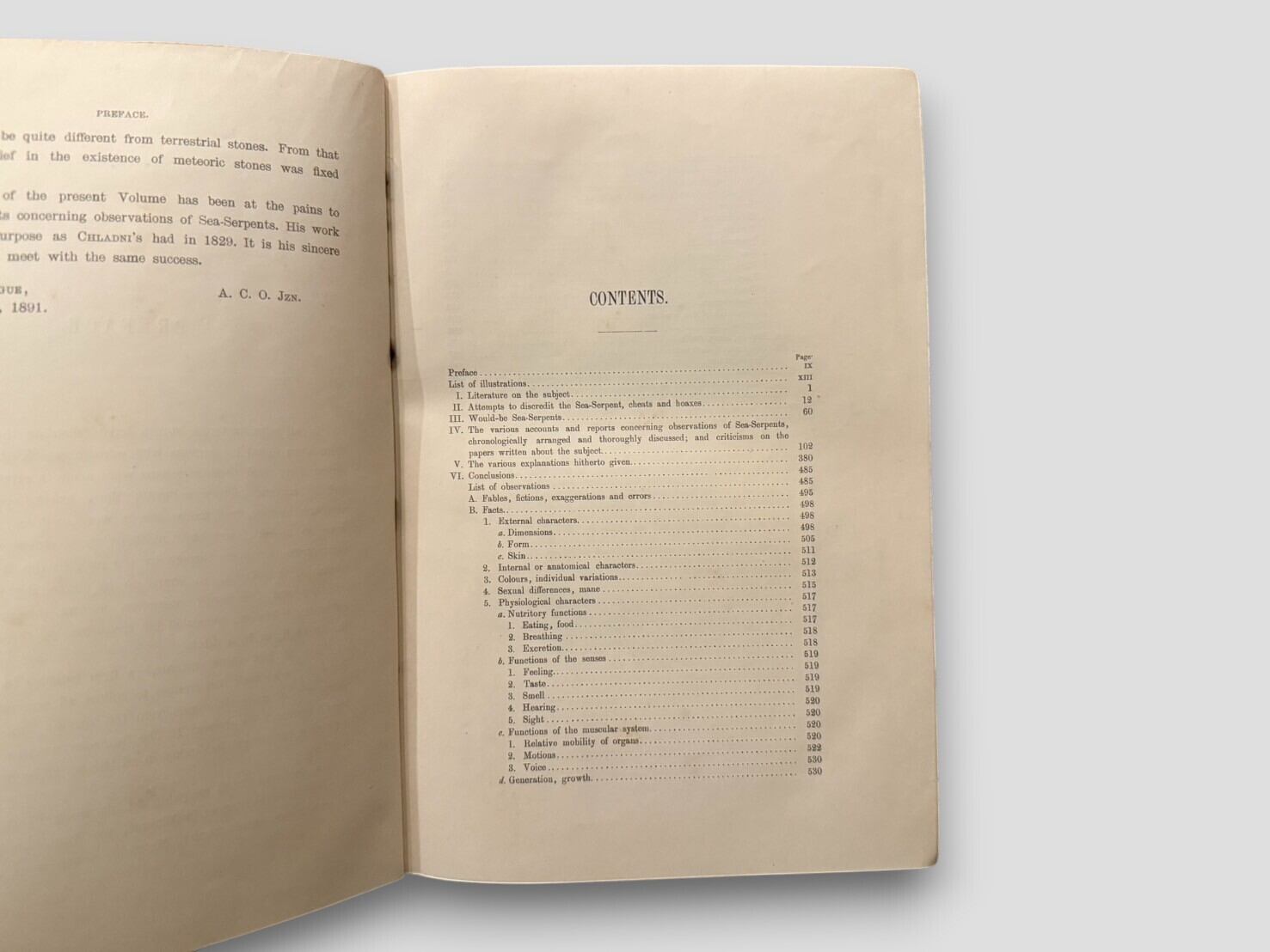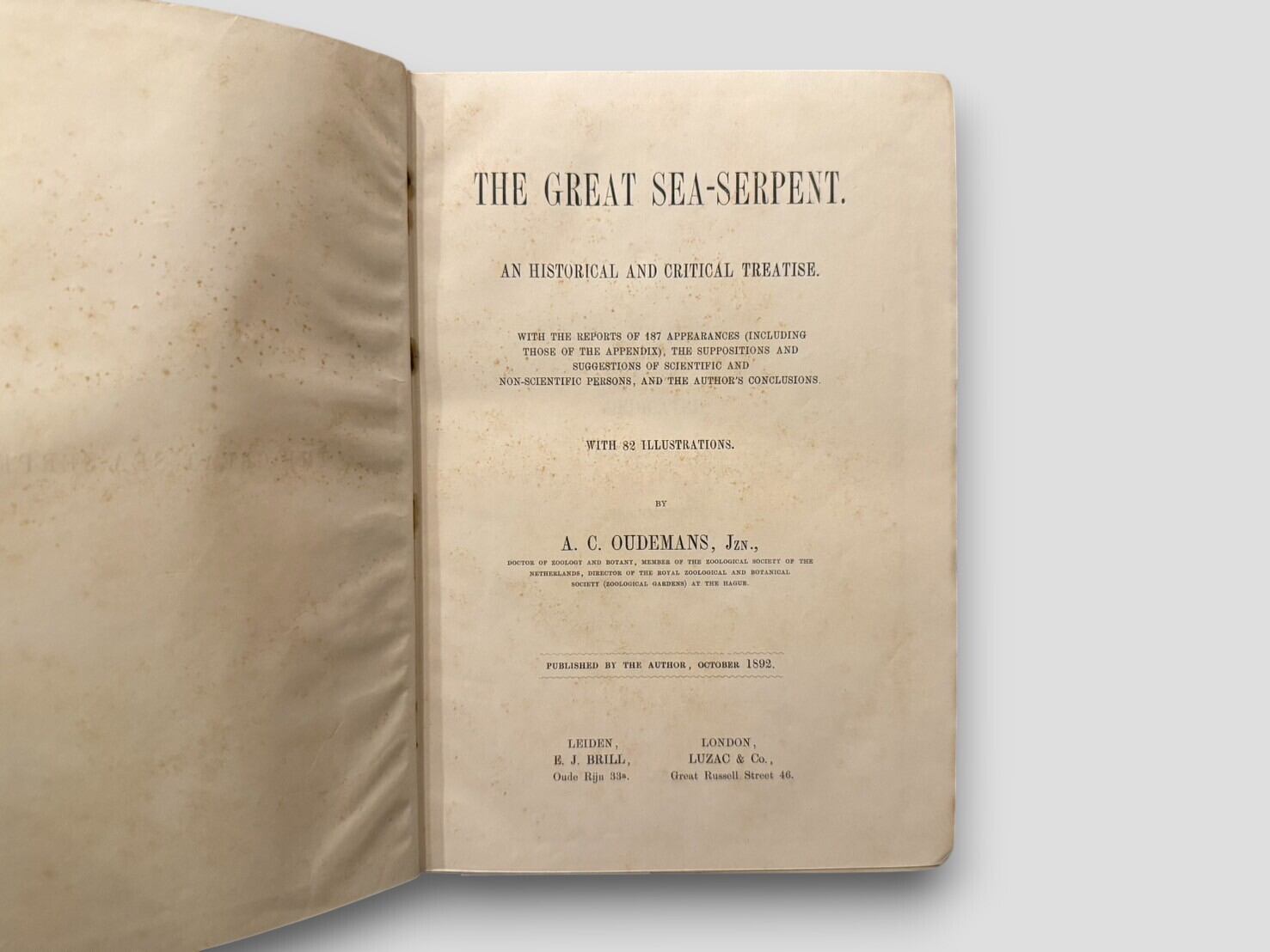 オランダの動物学者A. C. オーデマンスによる、海蛇(シーサーペント)に関する歴史的かつ批判的研究書。17世紀以降の世界各地における187件の出現報告を収録し、それぞれの記録を科学的・非科学的視点の双方から検証。仮説や観察記録、既存文献の批評、著者自身の結論を体系的にまとめた、未確認海洋生物研究の古典的資料。全82図版(挿絵・地図・スケッチ)を収録し、形態・生理・行動・分布などの詳細な章立てに加え、当時の科学者・船長・船員・民間人による証言を網羅。大型判による迫力ある紙面構成と詳細な索引を備え、博物学史・動物学史の分野においても極めて重要な1冊。1892年刊行初版。