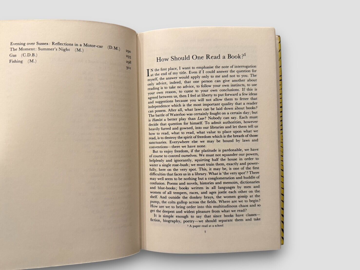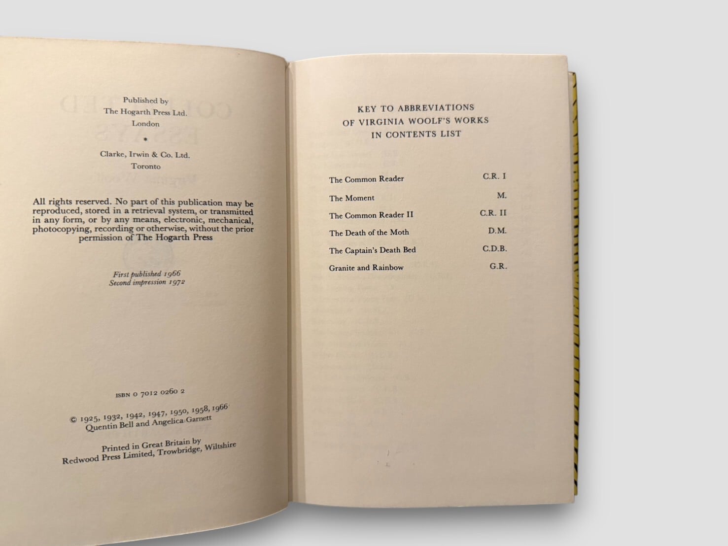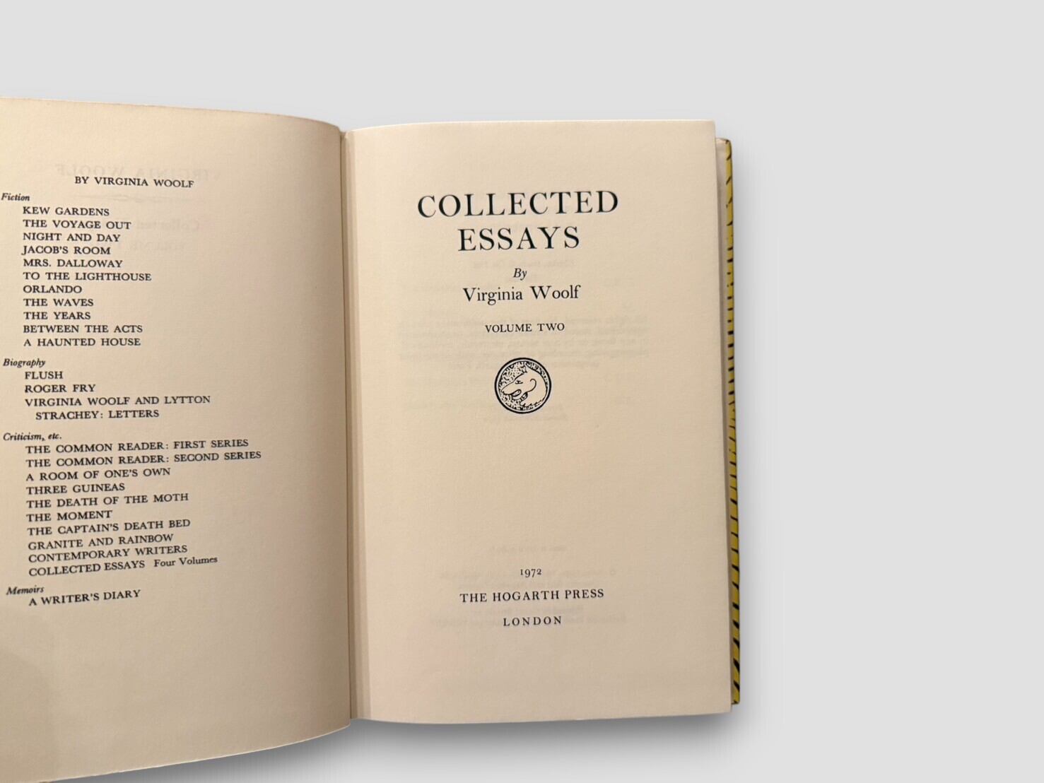 ヴァージニア・ウルフによる批評・エッセイを集成した全4巻の第2巻。文学・芸術・読書に関する随筆が収められており、ウルフの思想と批評的眼差しを示す重要な文章が並ぶ。初出は『The Common Reader』や『The Death of the Moth』など既刊エッセイ集からの再録を中心に構成され、時代や文脈を超えて読み継がれる価値を持つ。The Hogarth Pressによる印象的な装丁も魅力の一つ。1972年刊行第2刷。