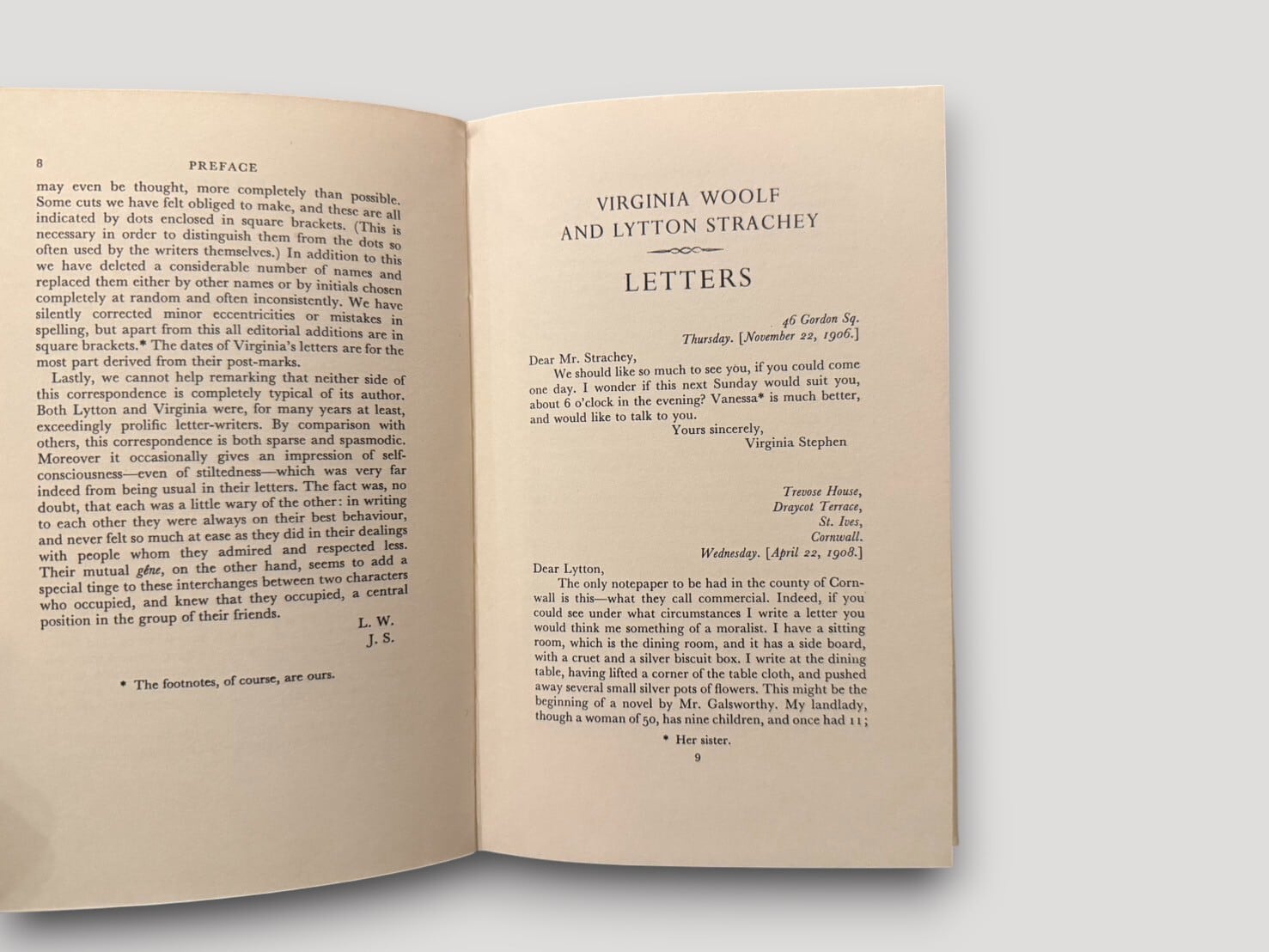 20世紀イギリス文学を代表する作家ヴァージニア・ウルフと、批評家・伝記作家リットン・ストレイチーとの往復書簡を収録した書簡集。収録期間は1906年から1932年までに及び、両者の文学的交流や友情、そしてブームズベリー・グループにおける知的関係が生き生きと描かれている。書簡はウルフの夫レナード・ウルフと、ストレイチーの甥で精神分析家のジェームズ・ストレイチーが編集。ジャケットは、ウルフの姉で画家・デザイナーとして知られるヴァネッサ・ベルによるデザインで、両者のシルエット肖像が配されている。初版は1956年刊行。本書は1969年刊行第2刷。