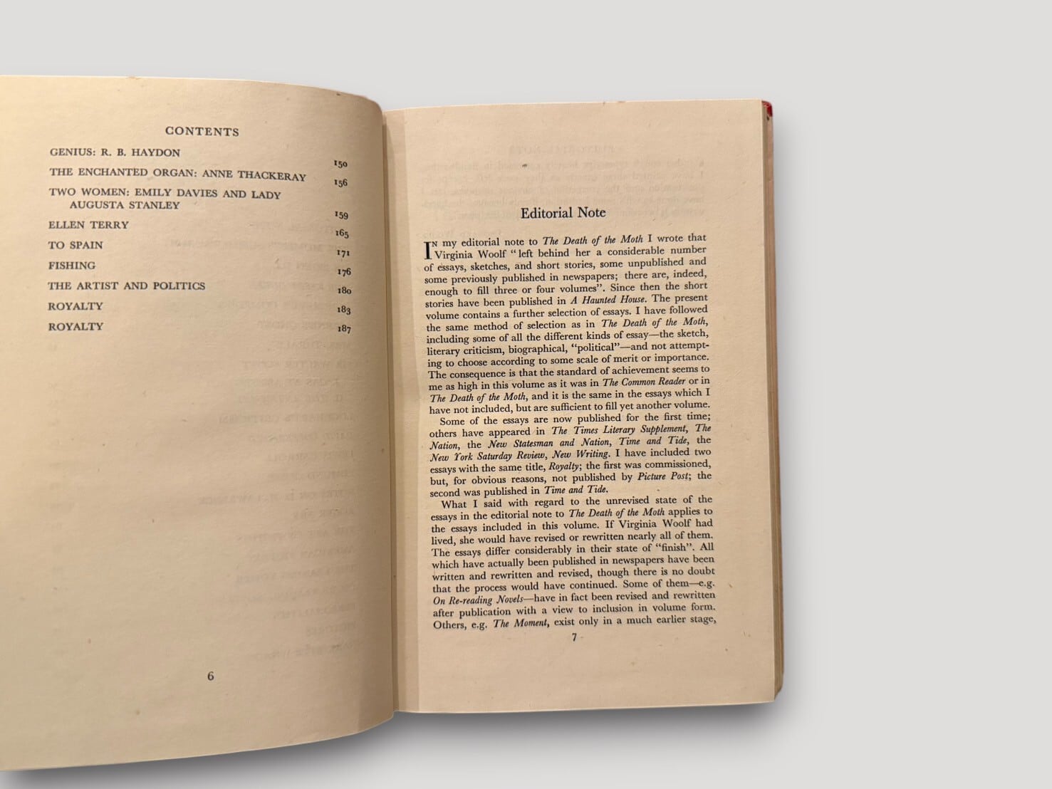 ヴァージニア・ウルフの死後、1947年にThe Hogarth Pressより刊行されたエッセイ集。全27編を収め、文学論、人物評、書評、文化批評など多彩なテーマを横断。ウルフ晩年の知的探究の軌跡を伝える一冊。編集者ノートでは、既刊のエッセイ集『The Death of the Moth』に収録されなかった作品や、初出誌から本書に収められた作品の背景について説明されている。装幀はヴァネッサ・ベルによる花瓶と花の意匠が印象的なデザイン。1947年刊行、ジャケット付きの貴重な初版。