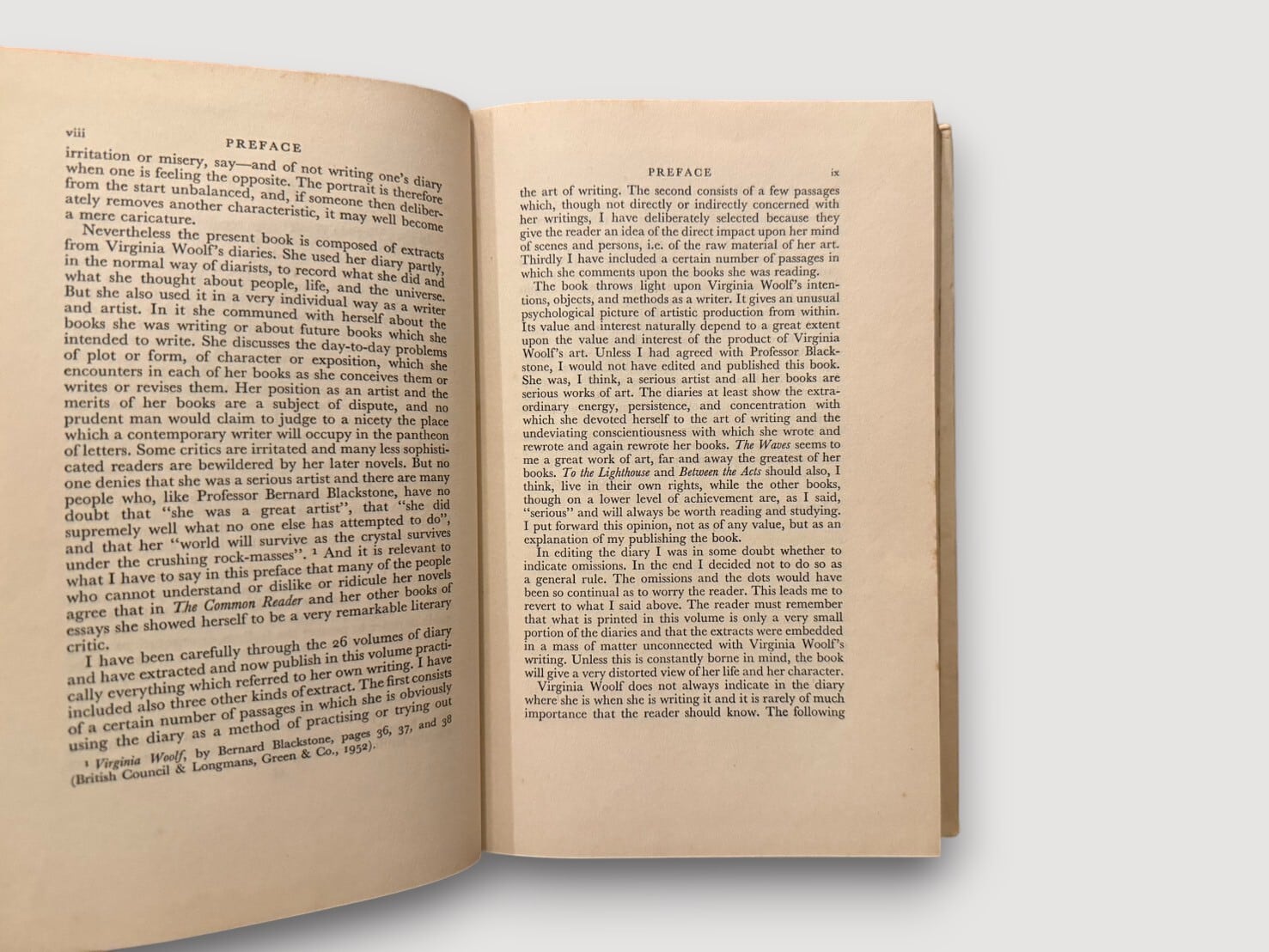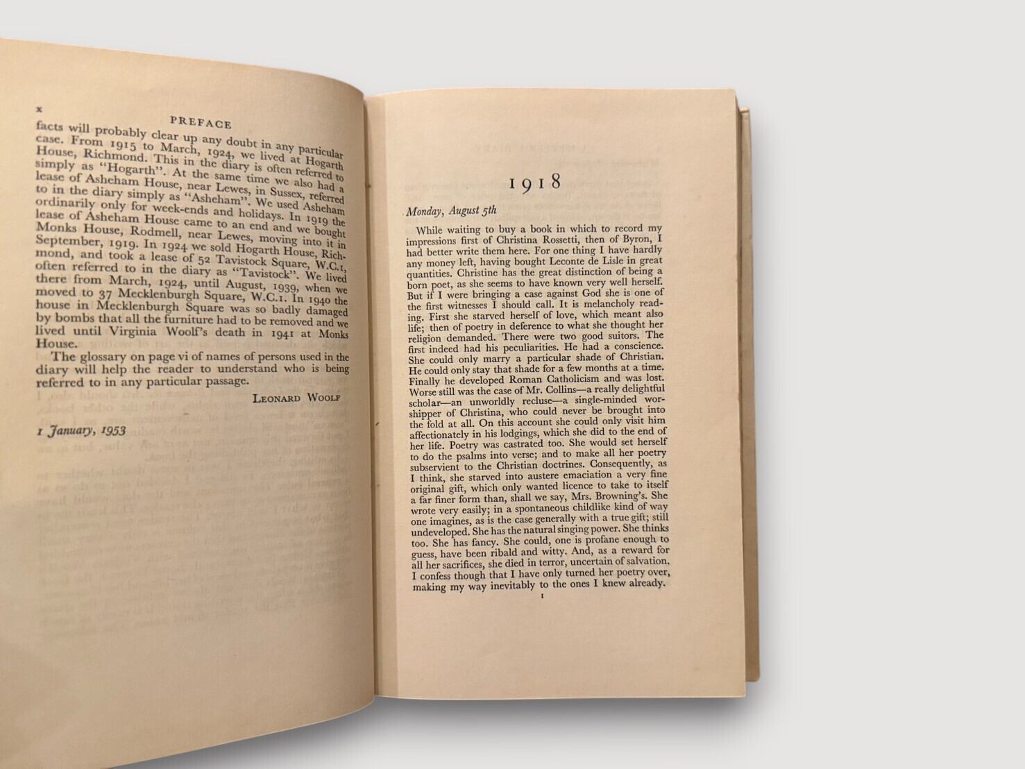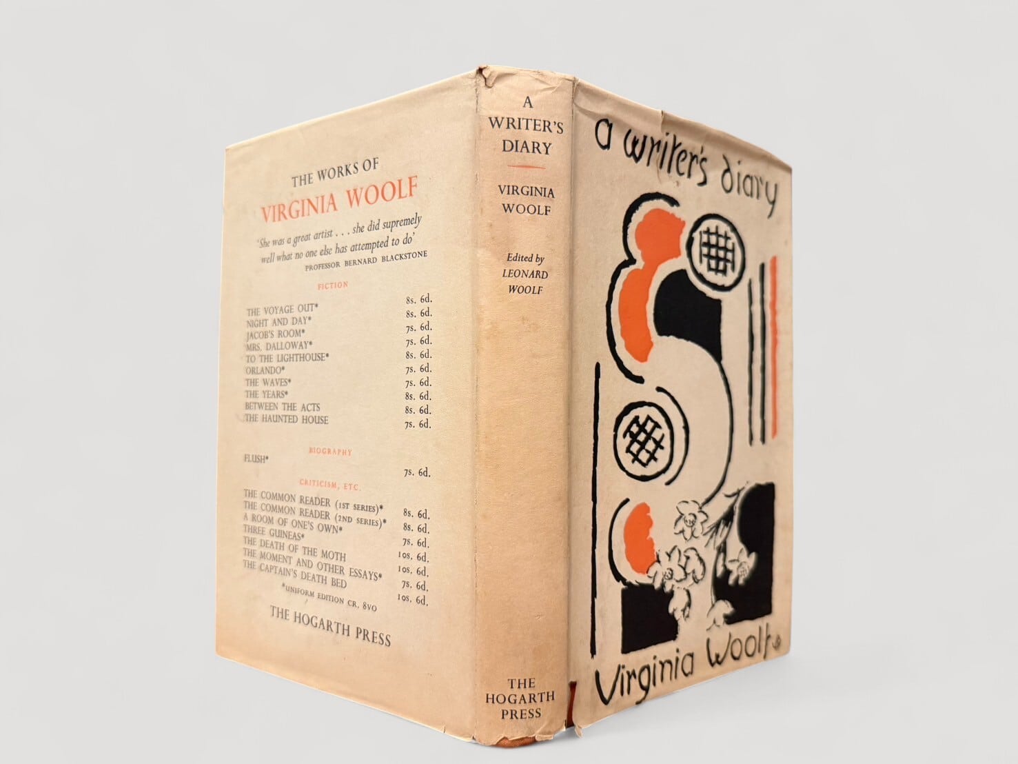 ヴァージニア・ウルフの死後、夫であり編集者のレナード・ウルフによって編纂された日記抄録集。1918年から1941年までの記録から抜粋された文章が年ごとに収められ、文学作品の構想や創作過程、交友関係、読書、日常生活、心境の変化など、作家としての営みと人間的な側面が生き生きと描かれる。序文では、ウルフの執筆姿勢や日記における自己表現の意味が語られ、本書が単なる私的記録にとどまらず、文学的価値を持つことが強調されている。モダンなデザインが特徴的な装幀はヴァネッサ・ベルによるもの。初版は1953年刊行。本書は1954年刊行の第2刷。ジャケット付きの貴重な1冊。