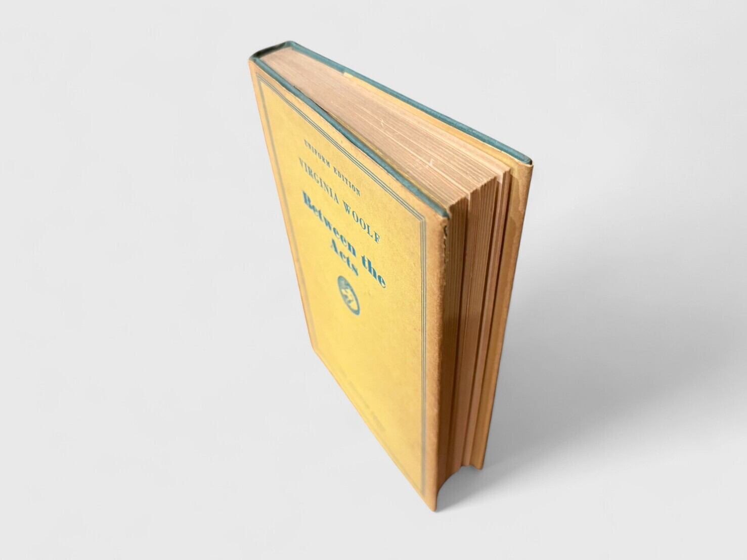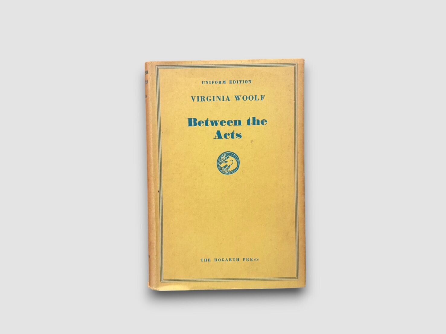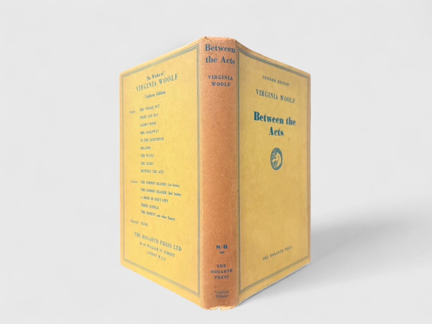 ヴァージニア・ウルフが1941年に刊行した最後の長編小説であり、彼女の死の直前に完成した作品『幕間』。物語は、第二次世界大戦前夜のイギリスの田舎町を舞台に、年に一度の村の歴史劇(ページェント)の一日を描く。舞台上の演劇と現実世界とが交錯し、歴史・芸術・個人の記憶といったテーマが詩的な文体で綴られる。本書は1953年発行の第5刷、Uniform Editionシリーズの一冊。黄色のジャケットに青いタイポグラフィの端正な装丁がHogarth Press刊の魅力を今に伝えている。