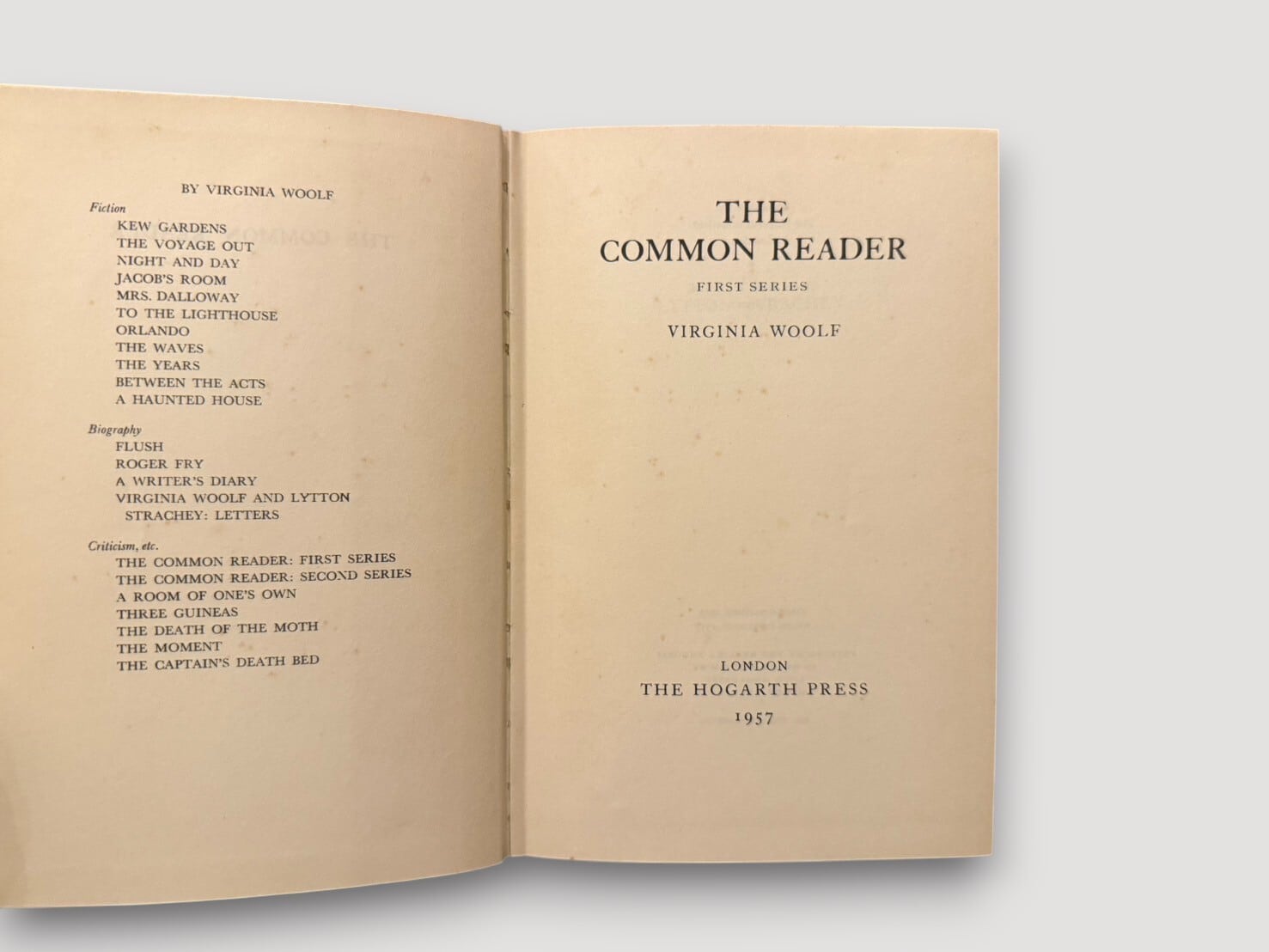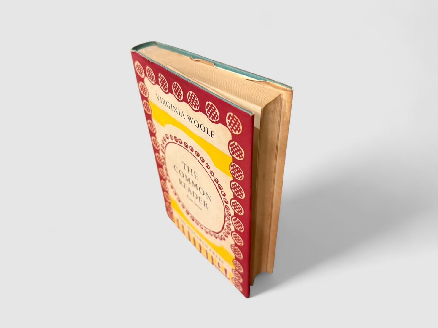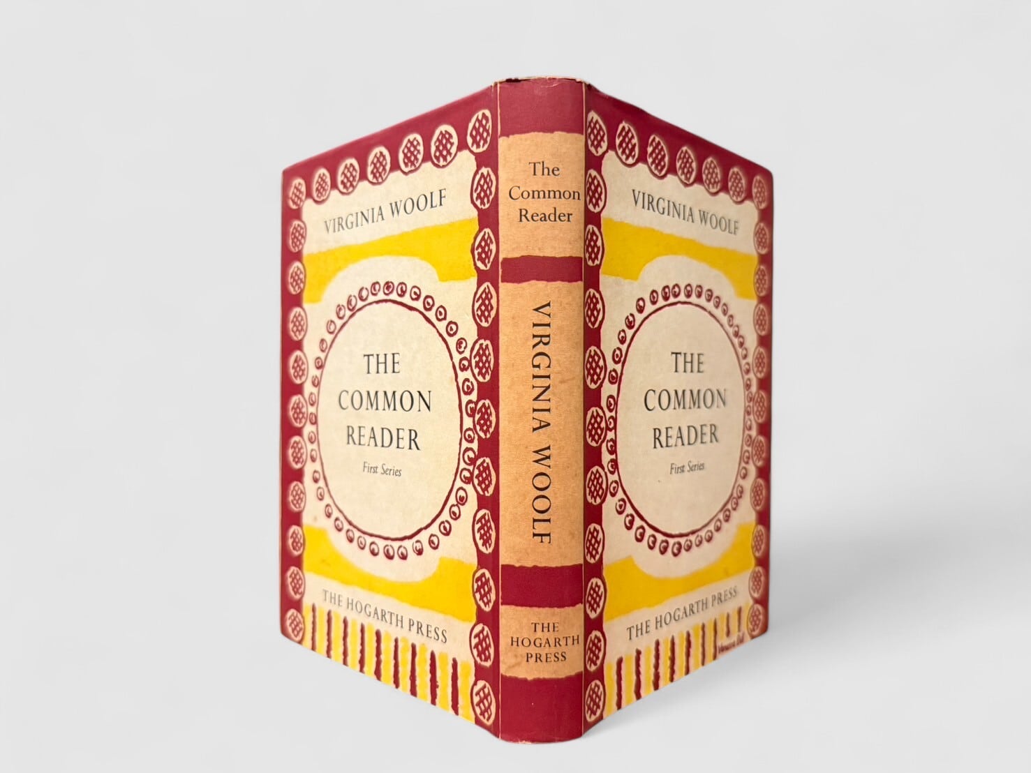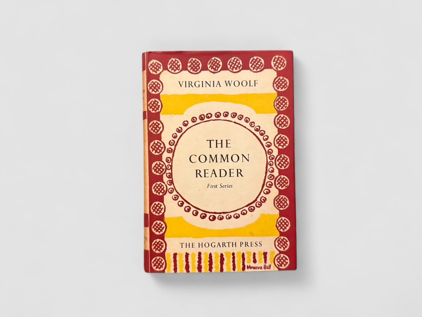 ヴァージニア・ウルフの代表的エッセイ集『The Common Reader』。1925年に初版が刊行された。二巻本構成のうちの第一巻にあたる「First Series」では、古典文学から同時代作家に至るまで、作家論・文学史・批評の諸相を軽やかかつ鋭い筆致で綴った26篇を収録。エリザベス朝演劇やジェイン・オースティン、ジョージ・エリオット、ジョゼフ・コンラッドなどを論じ、文学に対する深い洞察と独自の感性を示す。Times Literary Supplement や The Nation などに発表された記事を中心に構成され、新聞・雑誌発表時には見られない新稿も含む、ウルフの批評家としての力量を示す重要な一冊。本書はウルフの姉ヴァネッサ・ベルによる印象的な装幀デザインを纏った第九刷(1957年)版。姉ヴァネッサ・ベルによる装幀デザインが魅力的。