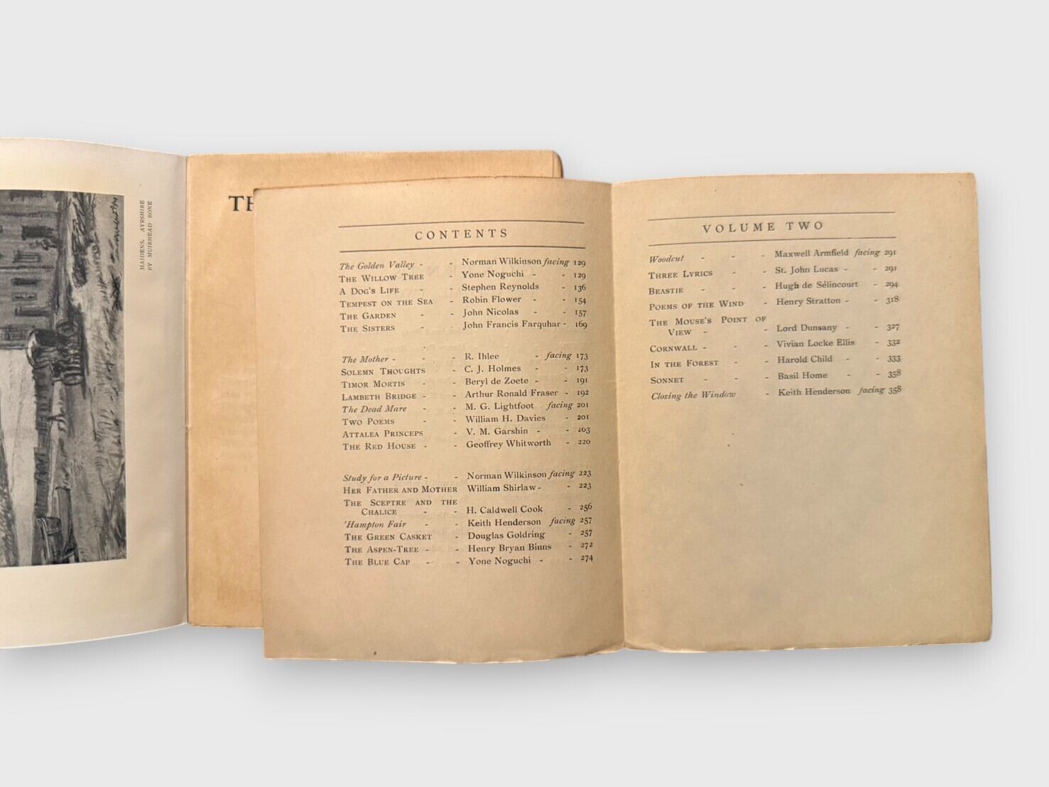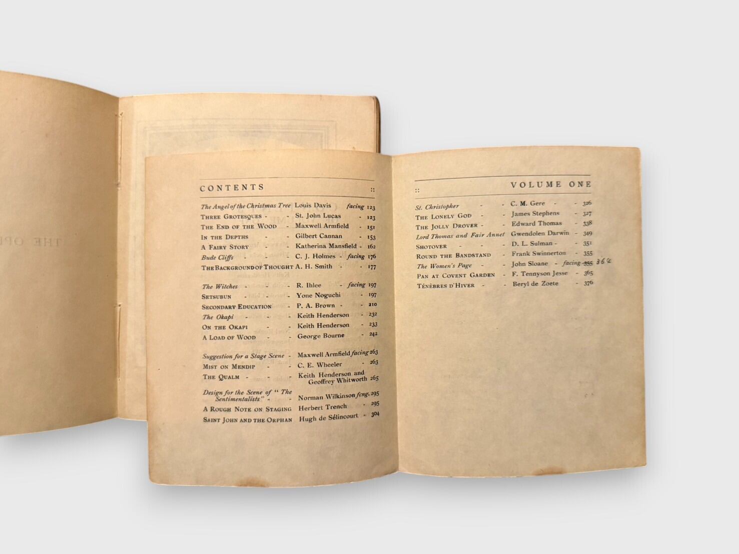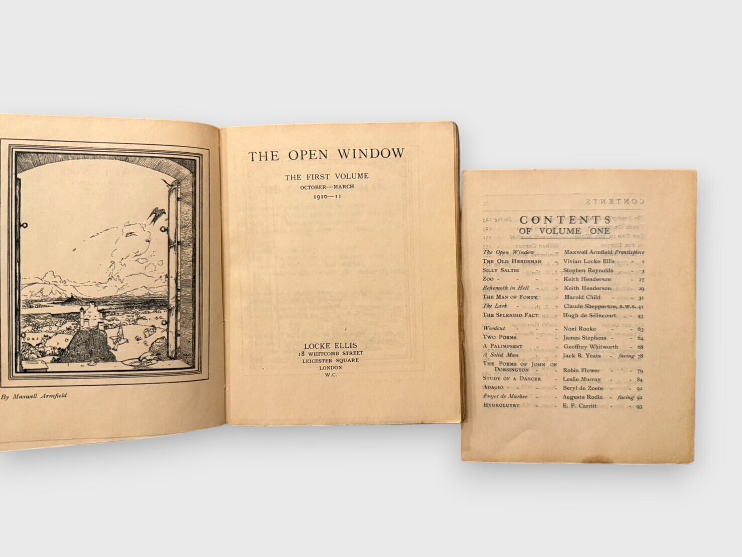 1910年10月に創刊され、1911年9月に終刊を迎えた英国の文芸雑誌 The Open Window の全12号(創刊から終刊までの完本)を揃えた、極めて稀少なセット。詩・短編小説・随筆・美術批評など多彩なジャンルを収め、当時の文学・芸術界で注目を集めた作家や詩人、美術家が寄稿している。特記すべき事項として、モダニズム文学を代表する作家キャサリン・マンスフィールドによる初期短編「A Fairy Story」を収録(Vol.Ⅲ)しており、その文学史的価値は非常に高い。さらに、E.M. フォースター、ウォルター・デ・ラ・メア、ロード・ダンセイ、ジャック・B・イェイツなど、20世紀初頭の英国文芸サークルを象徴する著名作家の作品を網羅する。また、マクスウェル・アームフィールドなどによる画家たちの木版画や口絵も随所に掲載され、美術的魅力も兼ね備えている。全冊オリジナル装丁。コレクションおよび研究資料として大きな価値を持つ完本である。