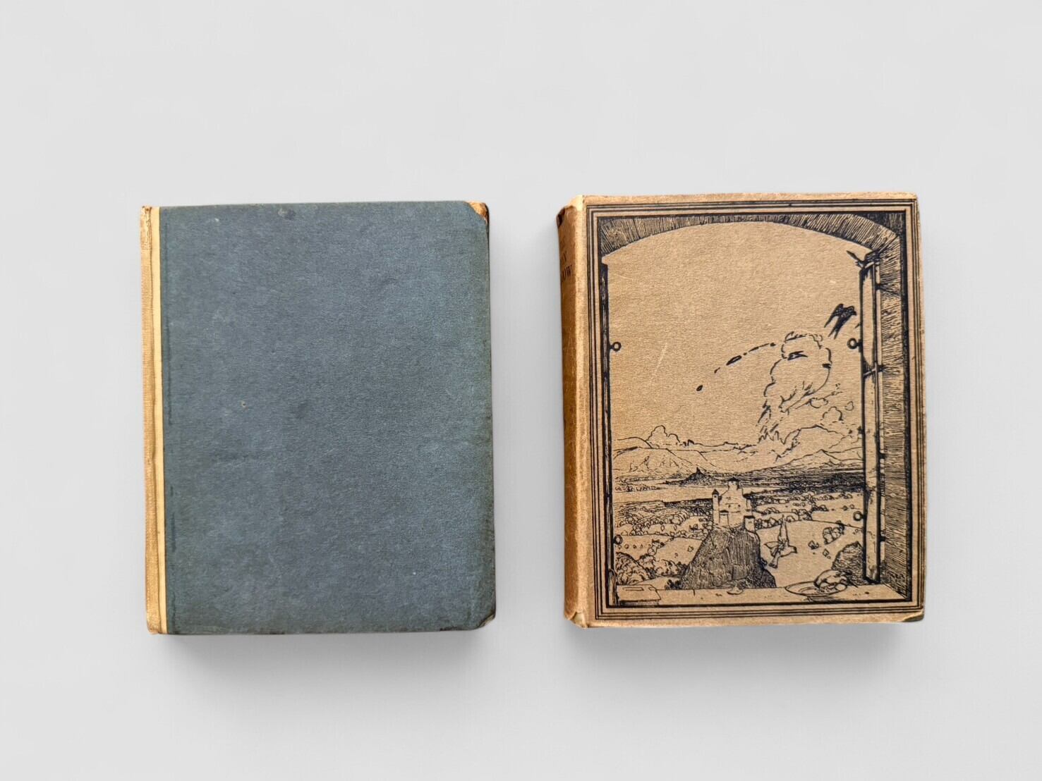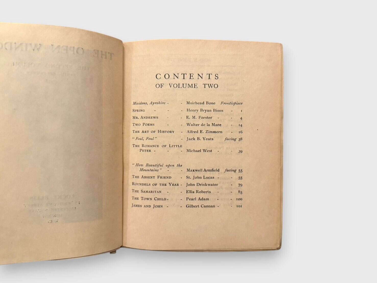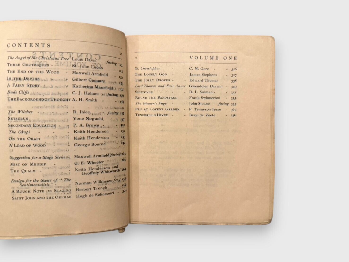 1910年10月創刊、1911年9月まで刊行された英国の文芸誌 The Open Window の本文初版と同一内容を収録した二巻本(出版社合本)。初出の月刊全12号分冊(初版形態)とは異なり、本品は刊行元が同年中に全12号分を連続ページで組み直し、Vol. I(Oct–Mar)/Vol. II(Apr–Sept) の二冊に製本した後期形態(later issue)。内容は初版分冊と完全に同一で、詩・短編小説・随筆・美術批評など多彩な作品を収録。特にキャサリン・マンスフィールドの初期短編「A Fairy Story」(Vol. I収録)が収録されていることが重要。他にもE. M. フォースター、ウォルター・デ・ラ・メア、ロード・ダンセイ、ジャック・B・イェイツなど、20世紀初頭の英国文芸界を代表する作家の寄稿を網羅している。誌面にはアームフィールドほか画家たちの木版画・口絵が随所に掲載される。Vol.Ⅰは残念ながらジャケットがないが、初版本文を持ちながらも後期合本形態という点が特徴的な、資料的価値の高い一組であることは間違いない。