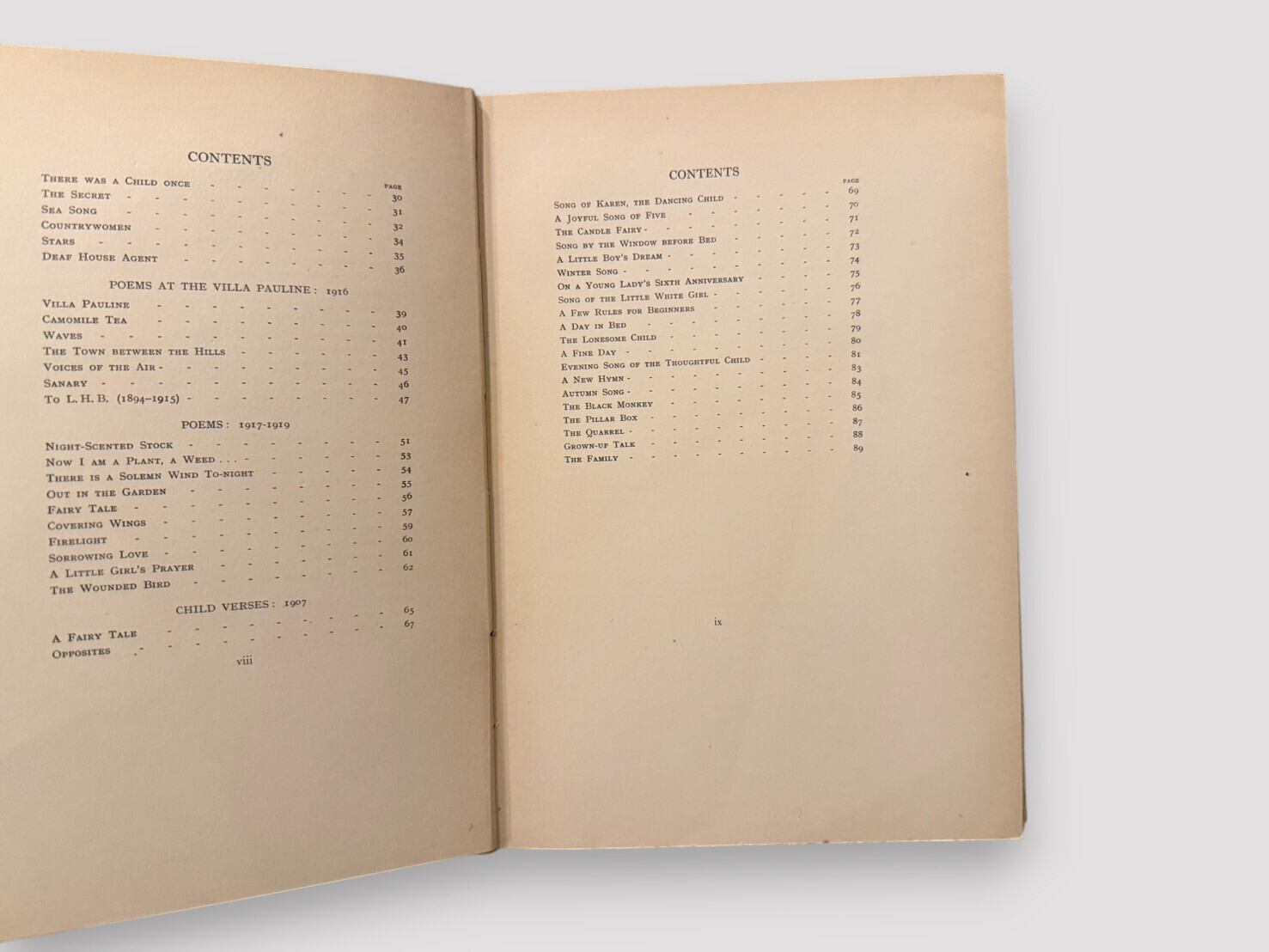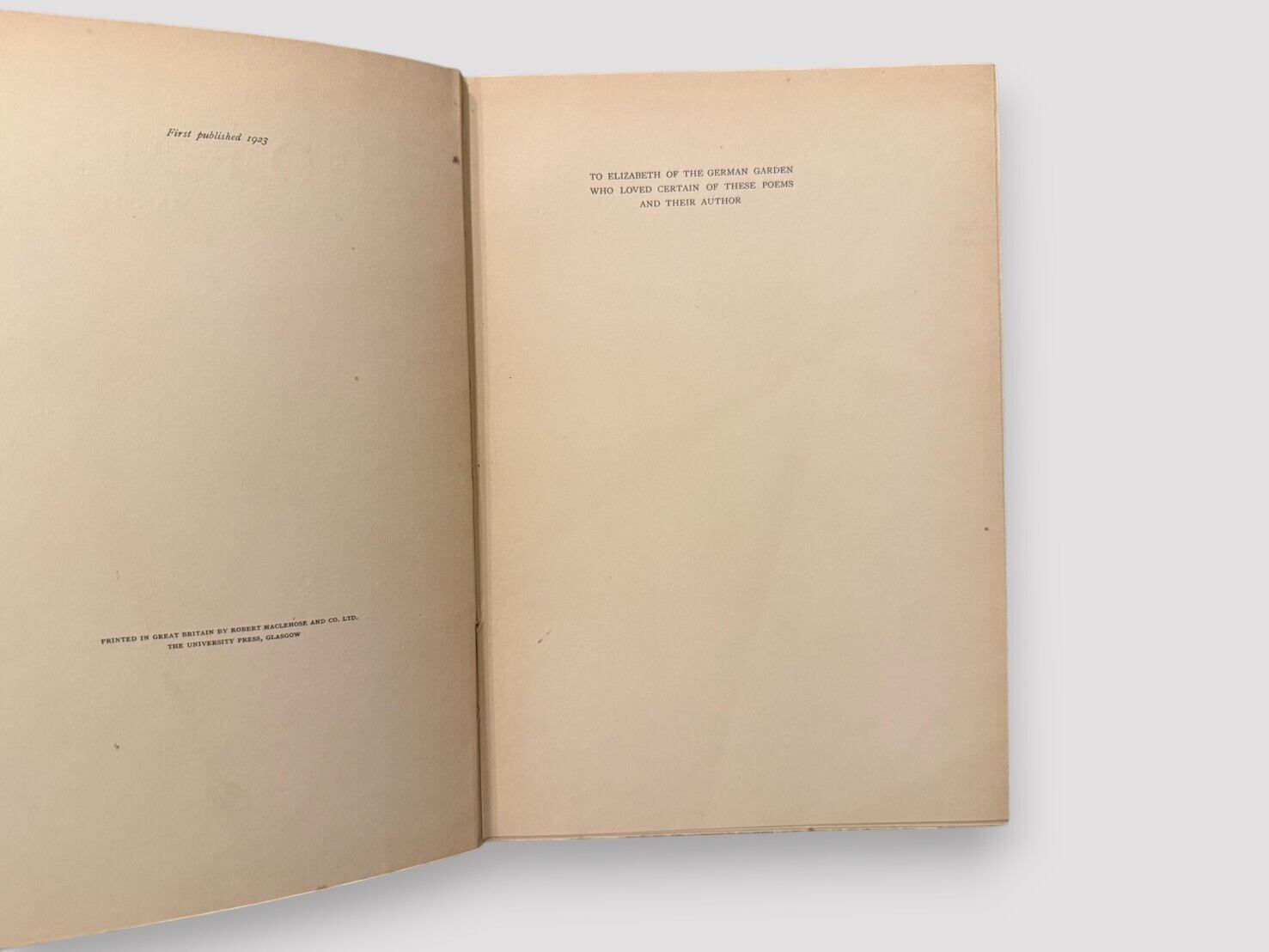 キャサリン・マンスフィールド唯一の詩集。夫で文学者のジョン・ミドルトン・マリー編集により、彼女の死後1923年に刊行された。1909年から1919年にかけて執筆された詩篇に加え、1907年の「Child Verses」を収録。自然や日常の情景、愛や孤独といったテーマを、簡潔で清澄な言葉と柔らかなリズムで描き出している。巻頭には、友人で作家のElizabeth of the German Garden(エリザベス・フォン・アーニム)への献辞を収める。文学的・資料的価値の高い1冊。1923年刊行初版。