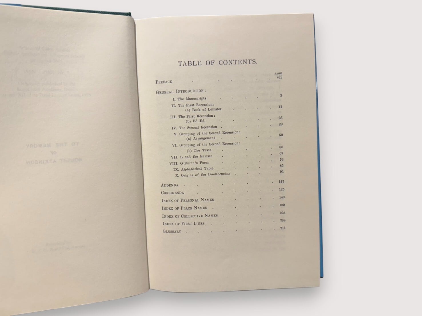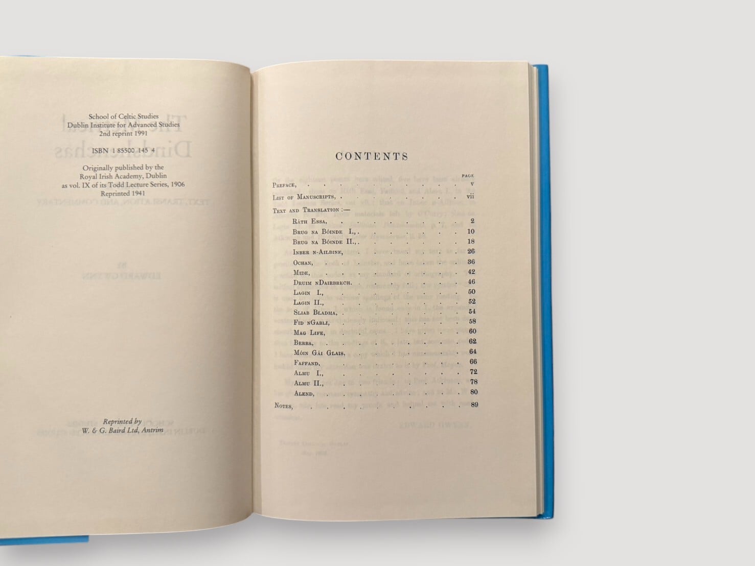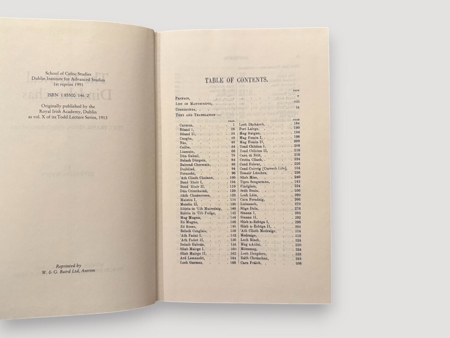 中世アイルランドに伝わる地名伝承詩群「Dindshenchas」を集成した最重要資料。初版は1903年から1935年にかけてRoyal Irish Academyの Todd Lecture Series(Vol. VIII–XII)として刊行された。本書は、1991年にDublin Institute for Advanced Studies(ダブリン高等学術研究所)のケルト学部門より再刊されたリプリント版。各巻には中世写本に基づくテキスト、英訳、詳細な注釈が収録され、アイルランド神話学・地名学・文献学の基礎文献として高く評価されている。ケルト文学研究者や神話学・民俗学に関心を持つ読者にとって必携の全集。