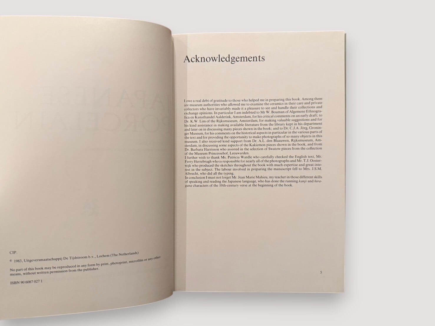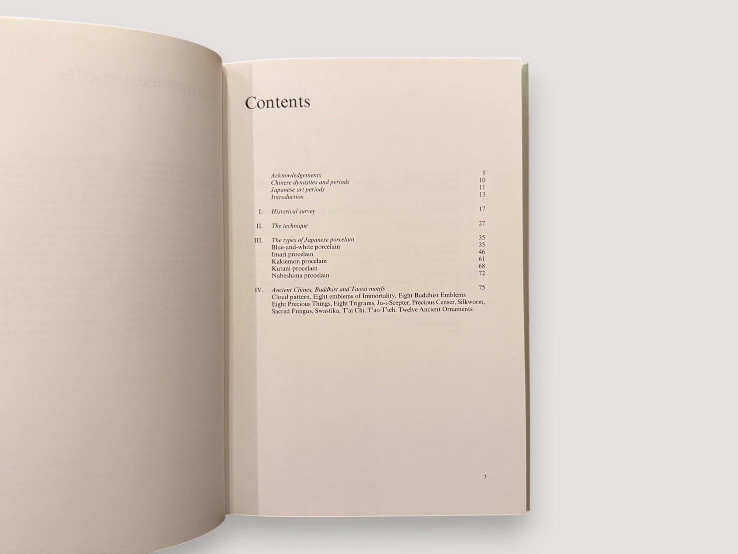 日本磁器を体系的に解説したコレクター向けガイドブック。伊万里、柿右衛門、鍋島、九谷(Kutani)など主要な様式を豊富な図版とともに紹介し、歴史的展開から製法、装飾モチーフに至るまで幅広く網羅している。1983年刊行初版。