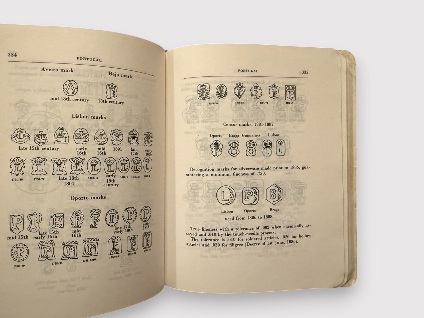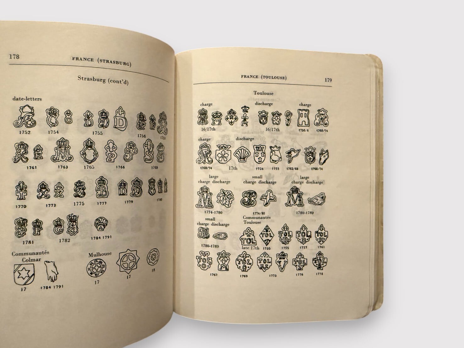 世界各国の銀製品に刻まれるホールマーク(品位・製造地・年代等を示す刻印)を体系的に収集・分類した、専門的な図録。パリの出版社Tardyによって刊行されて以来、銀器愛好家や骨董ディーラー、研究者にとって長らく愛されてきた定番書。1981年刊行。