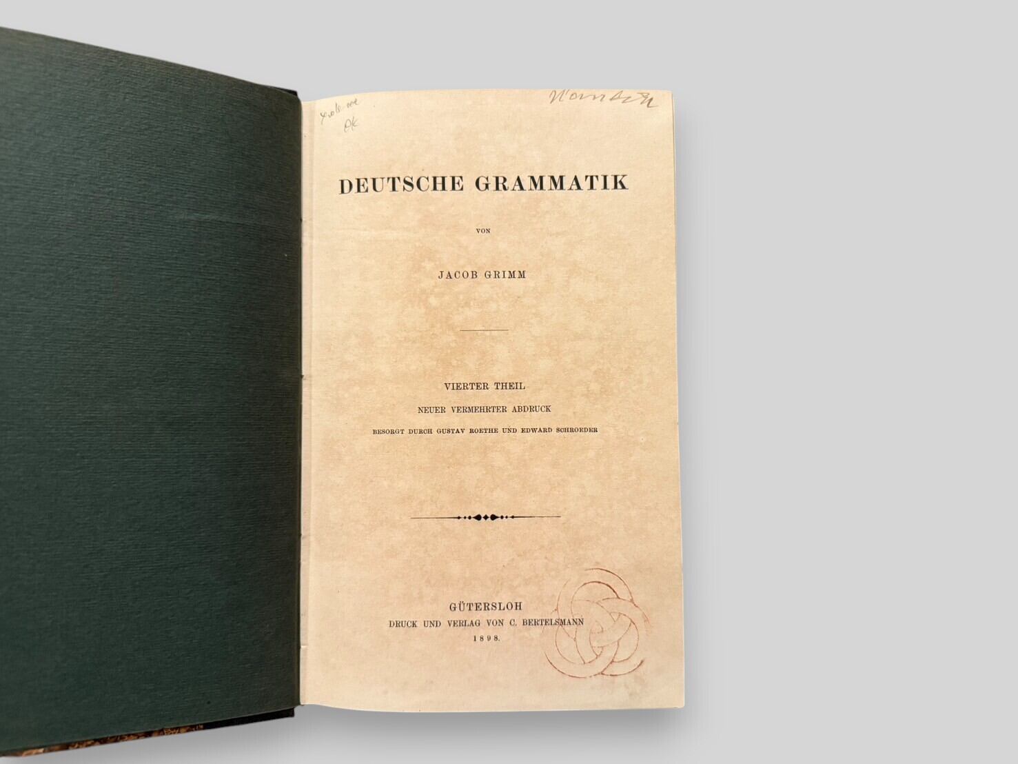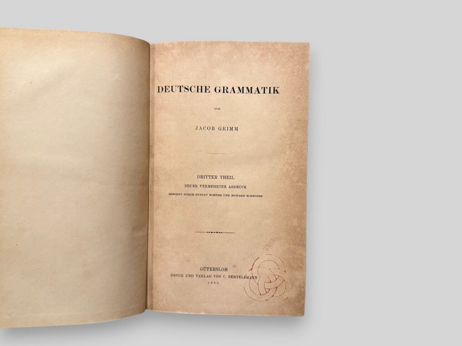 グリム兄弟のヤーコプ・グリムが生涯をかけて編纂したドイツ語学・比較言語学の基礎的大著。初版(1819–1837年)から半世紀後に刊行された本書は、第1・2巻をウィルヘルム・シェーラーが校訂し、第3・4巻をグスタフ・レーテとエドゥアルト・シュレーダーが監修することで増補版として刊行された、学術史的にも価値の高い改訂版。ドイツ語文法を音韻・形態・統語の体系に分けて論じ、ゲルマン諸語を比較することによって「グリムの法則」として知られる音韻変化の法則を明らかにした本書は、近代言語学の出発点ともいえる存在である。
