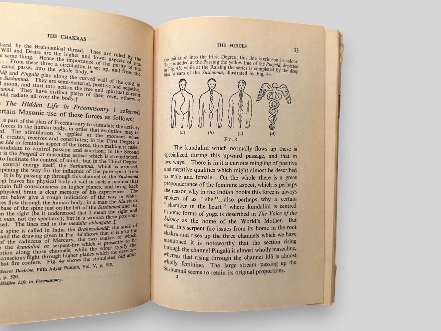 C. W. リードビーターによる神智学の古典的研究書。エーテル体における「フォース・センター」、すなわちチャクラの構造と機能を詳細に論じた代表的なモノグラフである。カラーを含む図版を多数収録し、ルートチャクラからクラウンチャクラに至る各センターの象徴性と霊的意義を視覚的に示している。著者はまた、生命力(プラーナ)、クンダリニーの覚醒、アストラル体と霊的進化との関係についても論じ、20世紀西洋における「チャクラ観」の形成に大きな影響を与えた。神秘思想・オカルト研究の分野において長らく参照され続ける重要な文献である。1927年初版刊行。本書は1973年に刊行されたリプリント。