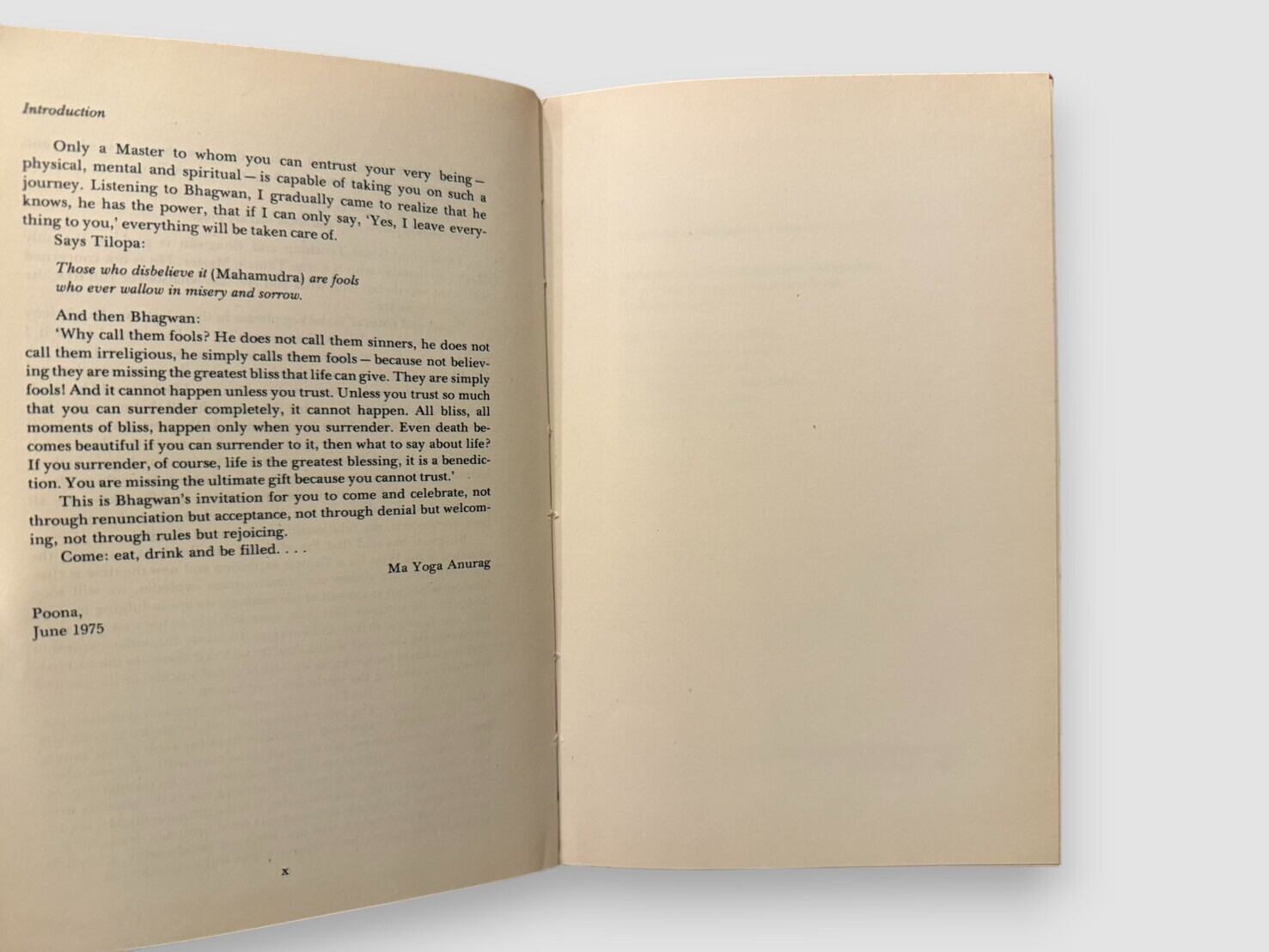 インドの思想家バグワン・シュリー・ラジニーシ(後のOsho, 1931–1990)が、チベット仏教の「大手印(Mahamudra)」の教えに基づき、タントラ思想について語った講話を収めた一冊。瞑想・真理・自然・自己超越といったテーマを多角的に展開し、「外界を変えるよりも内的革命を重視する」というラジニーシ思想の核心が示されている。1970年代にプーナのアシュラムで行われた講話をもとに、弟子のスワミ・アムリット・パティクが編纂し、マ・ヨーガ・アヌラグが編集した講話録として刊行された。ラジニーシ(Osho)は、20世紀後半のスピリチュアル思想家として世界的に知られ、瞑想法や講話を通じて広く影響を与えた一方、アメリカでの大規模コミューン建設や「ラジニーシ事件」に代表されるように賛否両論を呼んだ人物でもある。その思想と活動の両義性を背景に、本書は思想史的にも研究価値の高い一冊となっている。1975年刊行、貴重な初版。