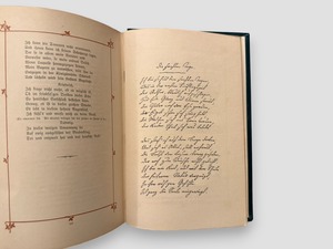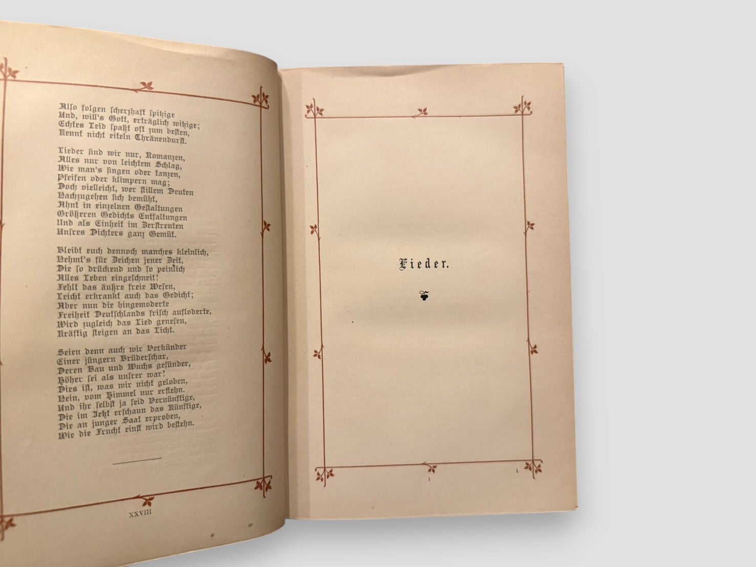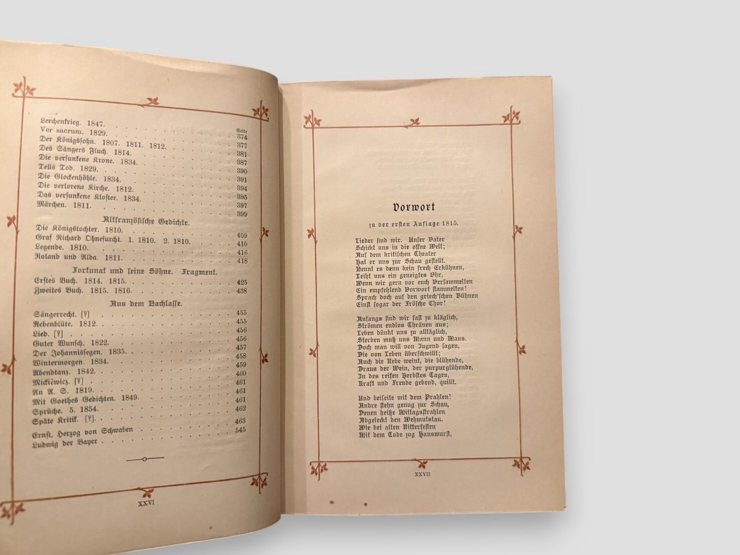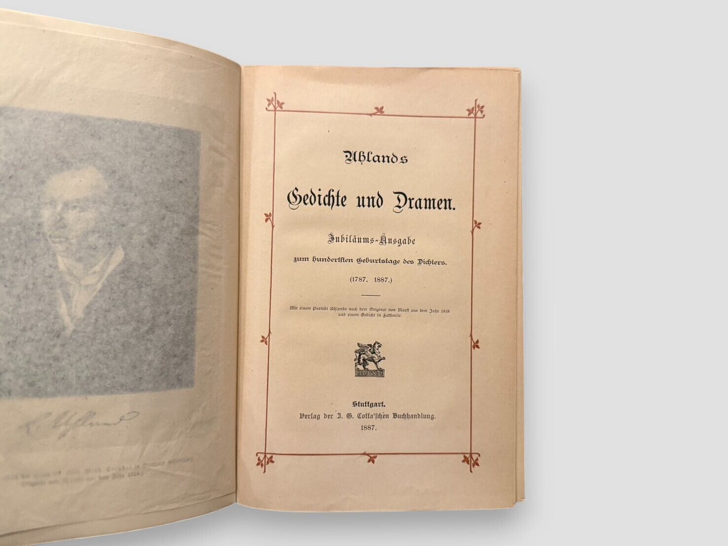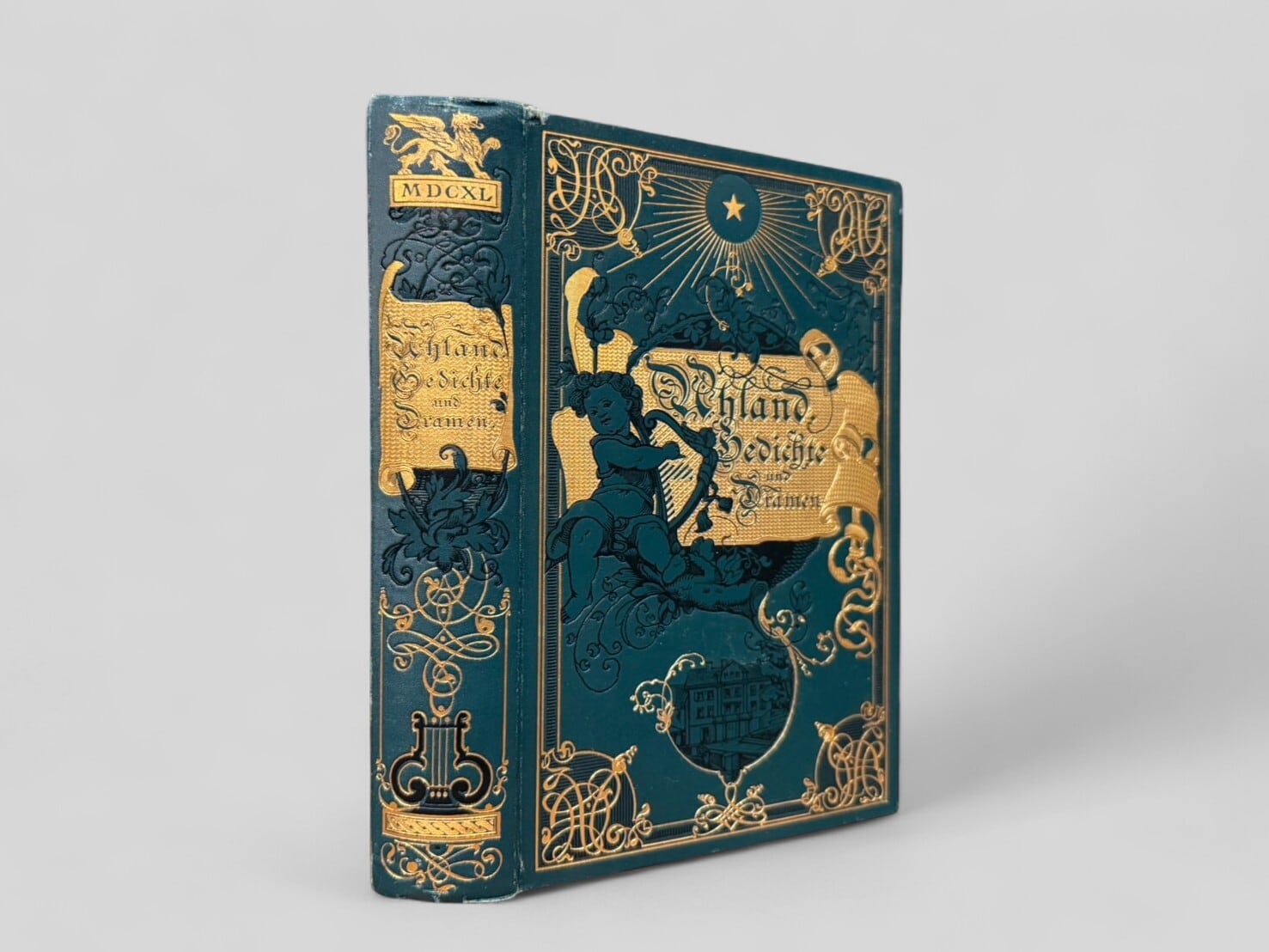 ドイツ・ロマン派詩人ルートヴィヒ・ウーラント(1787–1862)の生誕100周年を記念して刊行された記念版初版。ウーラントの詩と戯曲を網羅した集大成で、1787年から1887年までの文学的遺産を振り返る重要な一冊。冒頭には伝記的序文やウーラントの肖像版画も収められ、詩人の歩みと作品世界を多角的にたどることができる。金箔装飾が施された豪華なクロス装幀も特徴的で、記念出版ならではの特別な存在感を放っている。