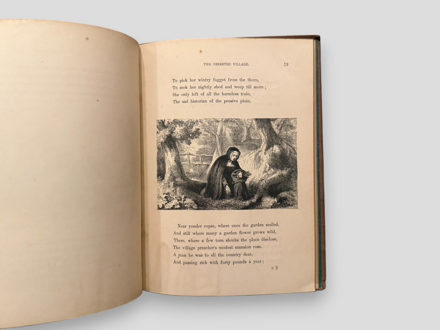 アイルランド出身の詩人オリヴァー・ゴールドスミスによる代表作『The Deserted Village』は、18世紀イギリスにおける農村共同体の衰退を描いた牧歌的詩編。囲い込みや経済的変化によって荒廃してゆく理想郷のイメージを通じて、失われゆく伝統的な生活と共同体の喪失感を批判的に描き出している。芸術的価値の高いヴィジュアルが詩世界を豊かに引き立てており、文学史と美術史の双方に触れる稀少な一冊である。挿絵多数収録。刊行年不明(献辞に “Christmas 1880” の記載あり)。
