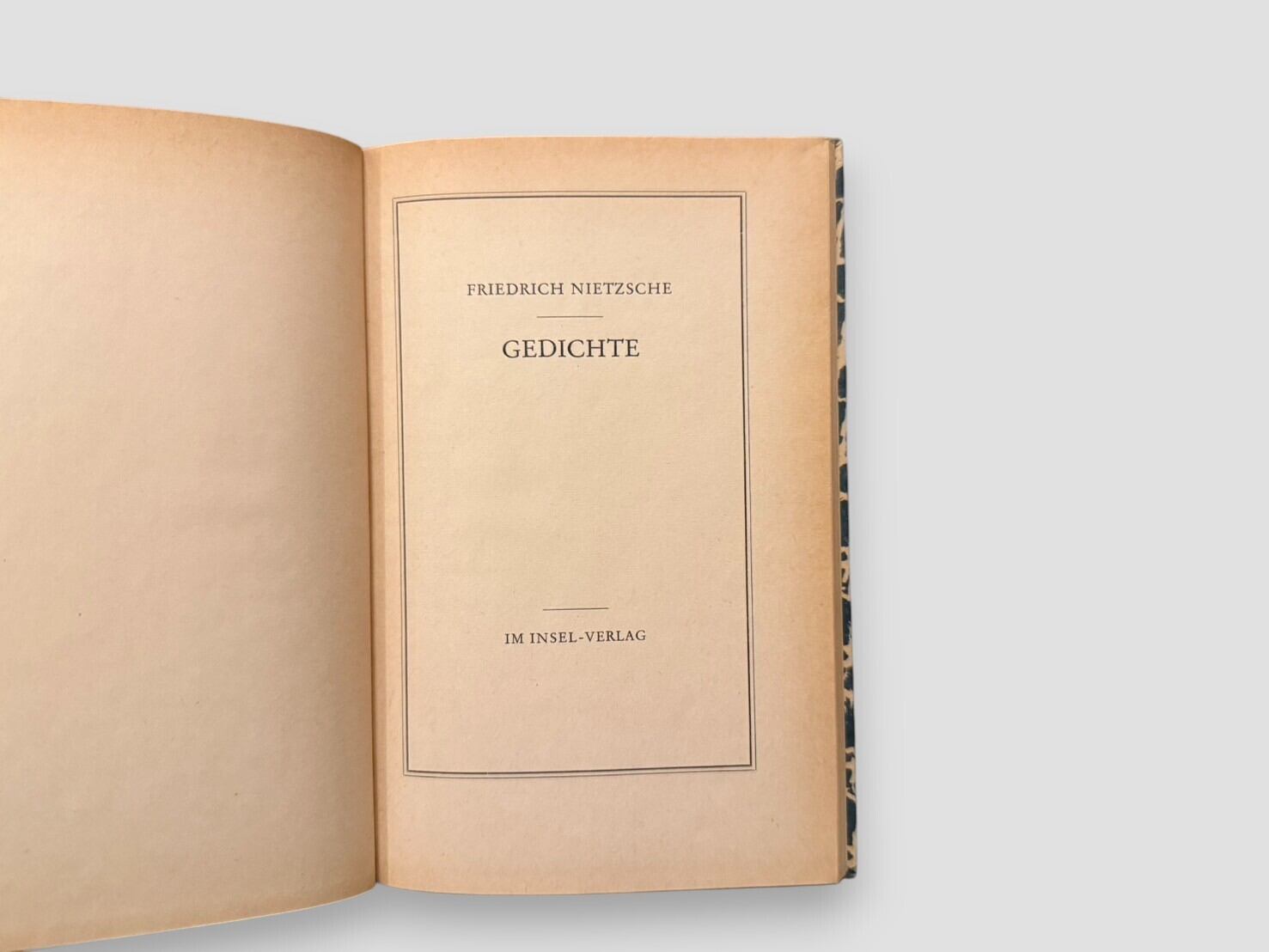 フリードリヒ・ニーチェ(1844–1900)の詩作を収録したインゼル文庫版。初期の青春詩から『人間的、あまりに人間的』時代の詩、さらにディオニュソス讃歌に至るまで、思想と感情が交錯する多様な詩篇を収めている。哲学者としての側面だけでなく、抒情詩人としての感性を伝える一冊。1956年刊行。