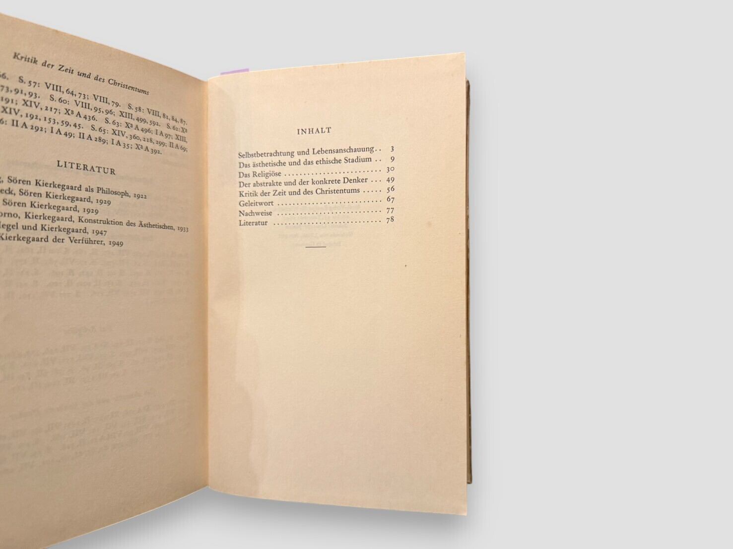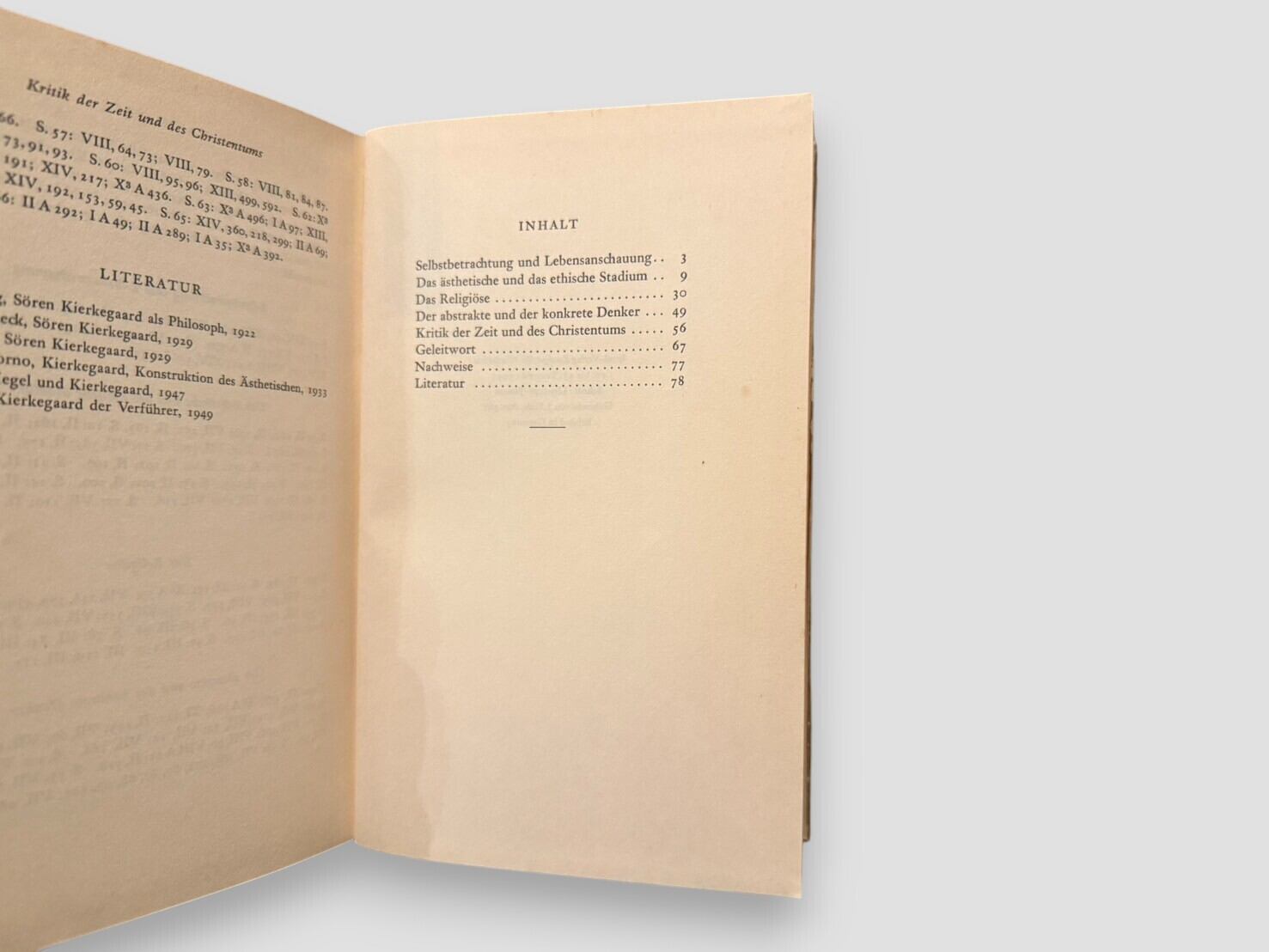 デンマークの思想家セーレン・キェルケゴール(1813–1855)の著作から主要な断章を精選した抜粋集。、自己省察と人生観、美的段階と倫理的段階、宗教的考察、時代批判とキリスト教批判など、キェルケゴール思想の核心がコンパクトに収録されている。インゼル文庫シリーズ。1955年刊行。