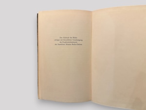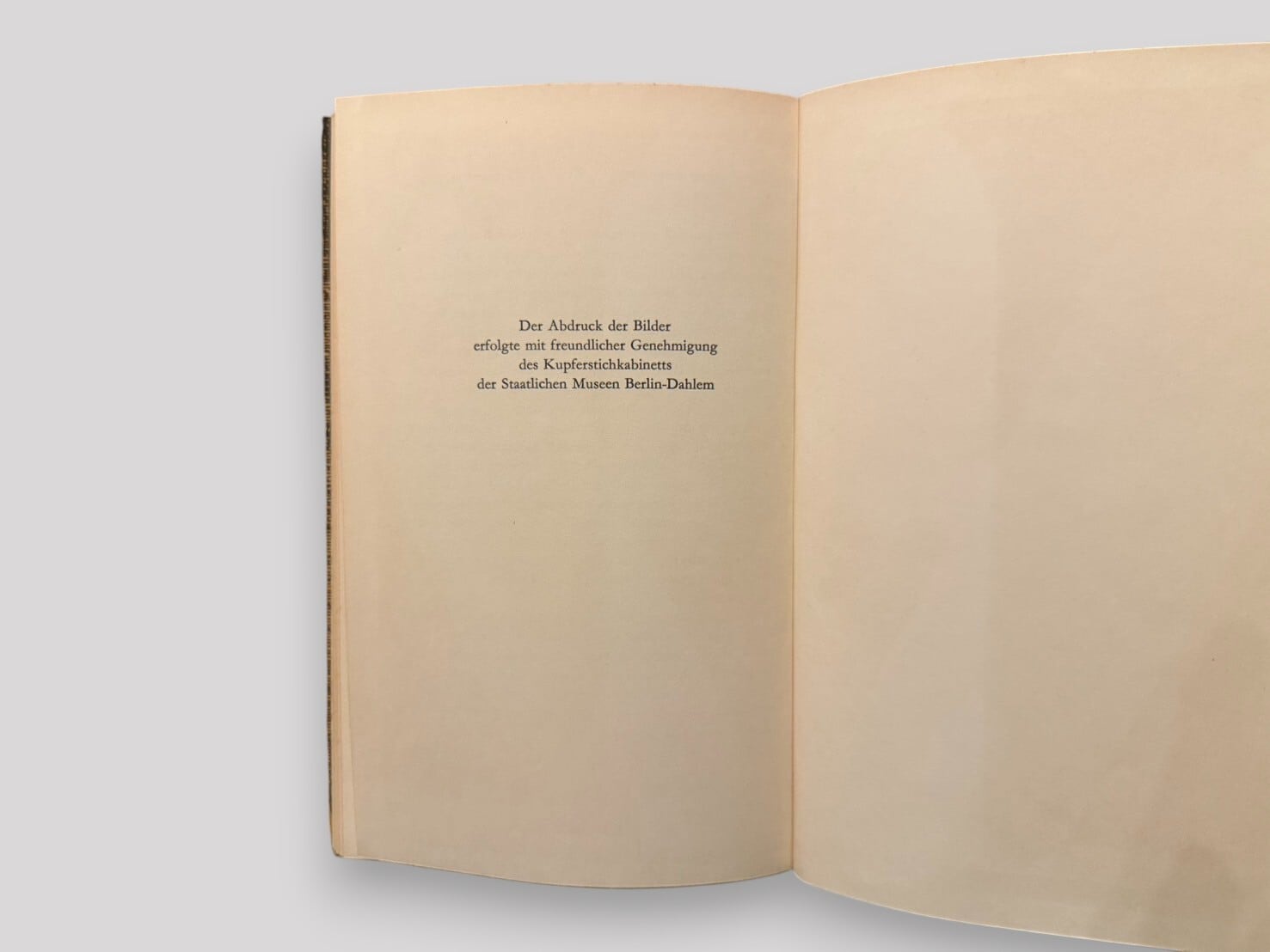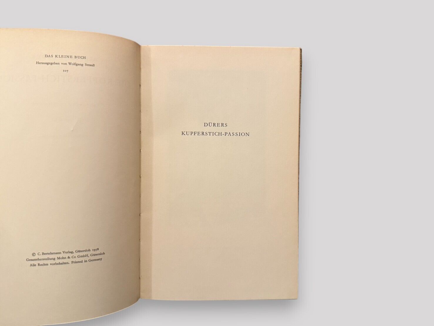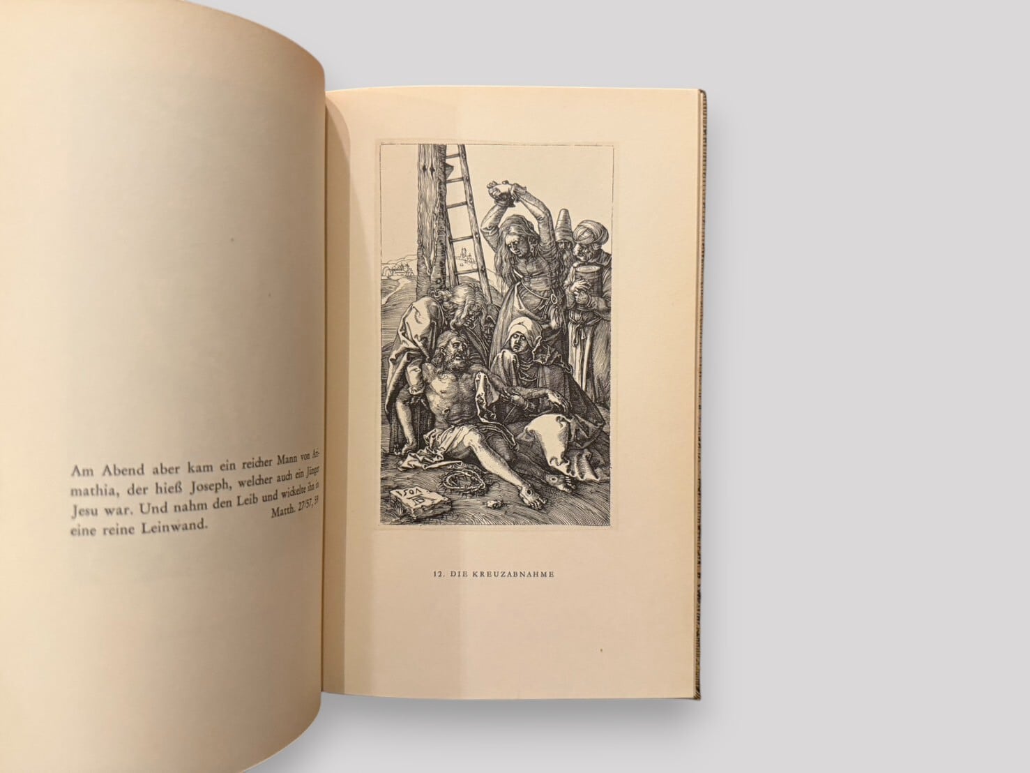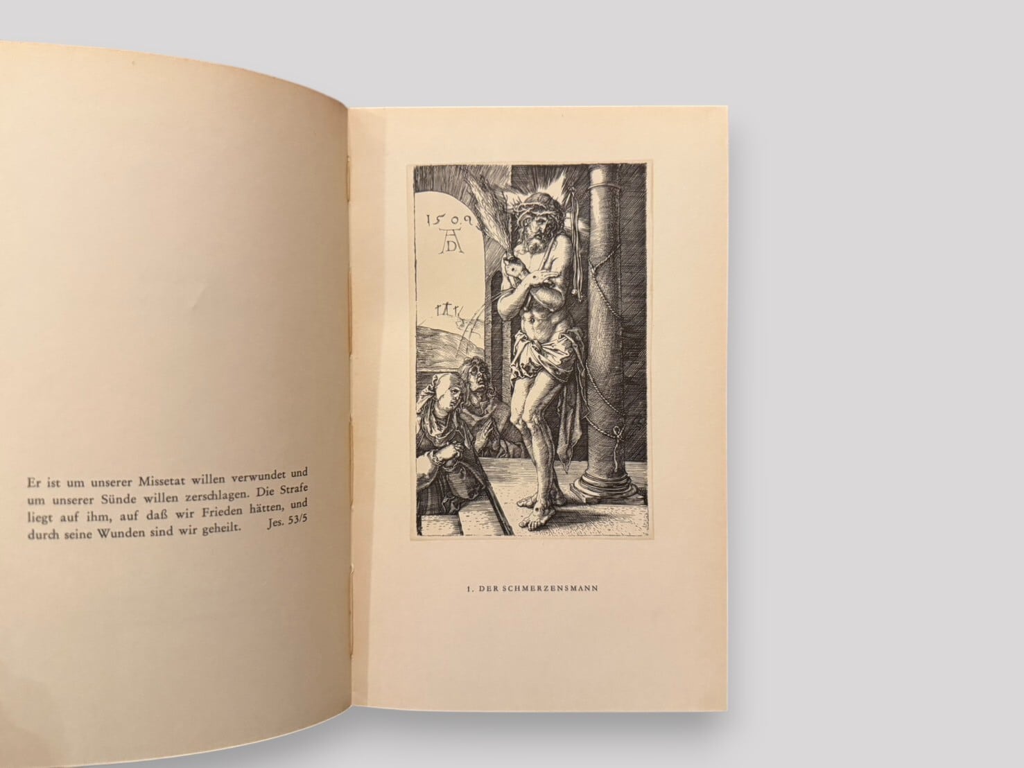 アルブレヒト・デューラー(1471–1528)の代表的な銅版画連作《大受難図》を収録した一冊である。デューラーが1512年に完成させた16枚の銅版画は、新約聖書に描かれるキリストの受難を精緻かつ劇的に刻み込み、ルネサンス美術史における頂点の一つとされている。本書は1958年にベルテルスマン社より刊行されたもので、ベルリン国立美術館銅版画室所蔵の版を基に収録。ゲルハルト・ウルリッヒによる解説を付し、聖書の引用と共に図像を鑑賞できるよう編集されている。