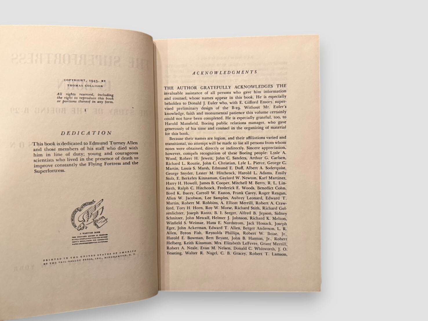 第二次世界大戦期にアメリカで刊行された戦時出版物で、ボーイング社の大型爆撃機B-29「Superfortress」の誕生を描いた一冊。設計から製造、飛行試験、そして実戦に投入されるまでの過程が、豊富な証言と記録をもとに詳細に叙述されている。戦時下において刊行された本書は、歴史資料としての価値とともに、戦時広報的な側面もあわせ持つ。1945年刊行、現在では比較的入手が困難な初版。