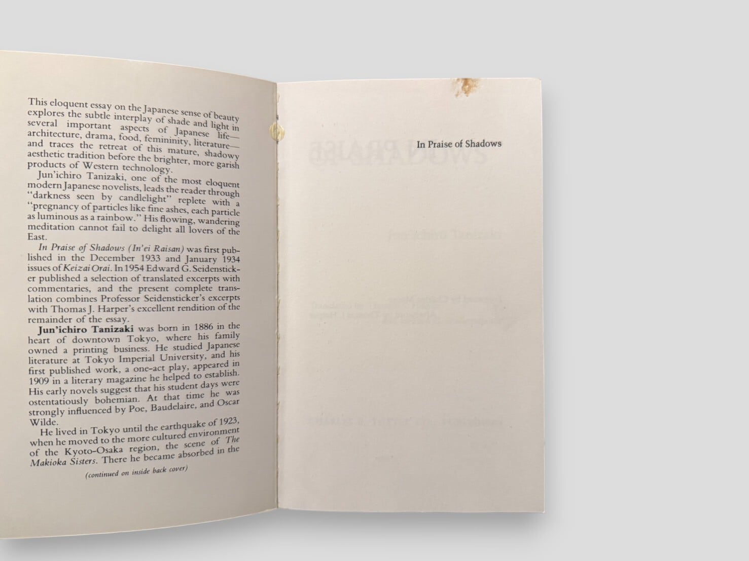 【SJ784】【FOURTH TUTTLE PRINTING】In Praise of Shadows(1992) /Jun'ichiro Tanizaki