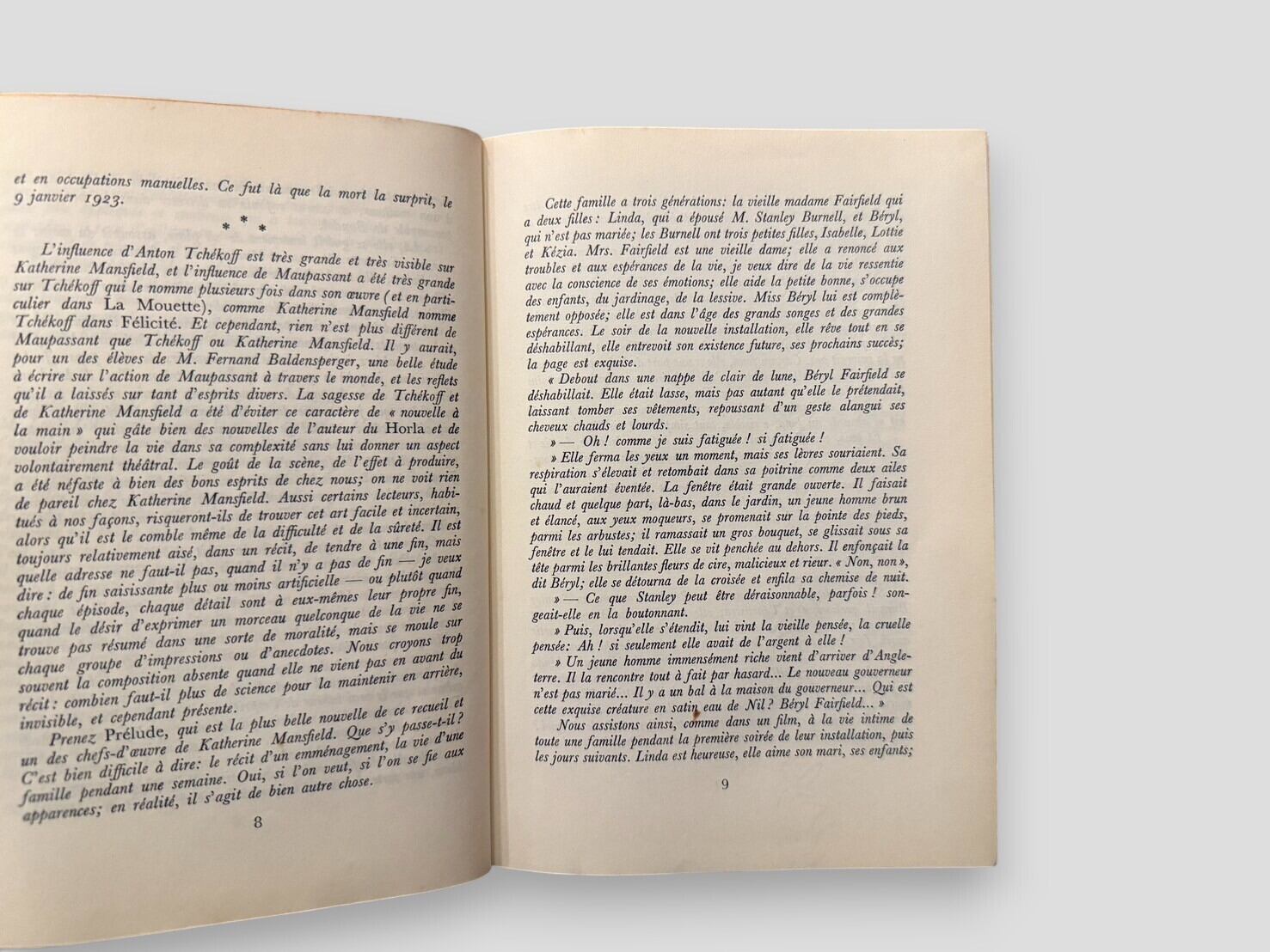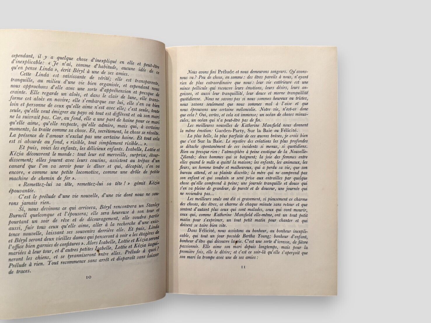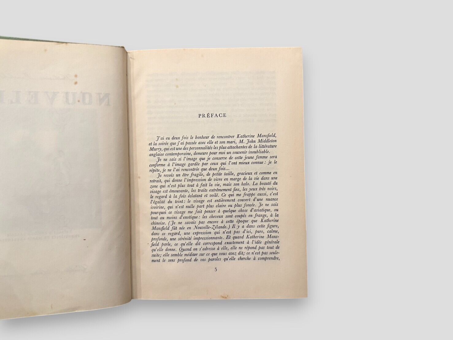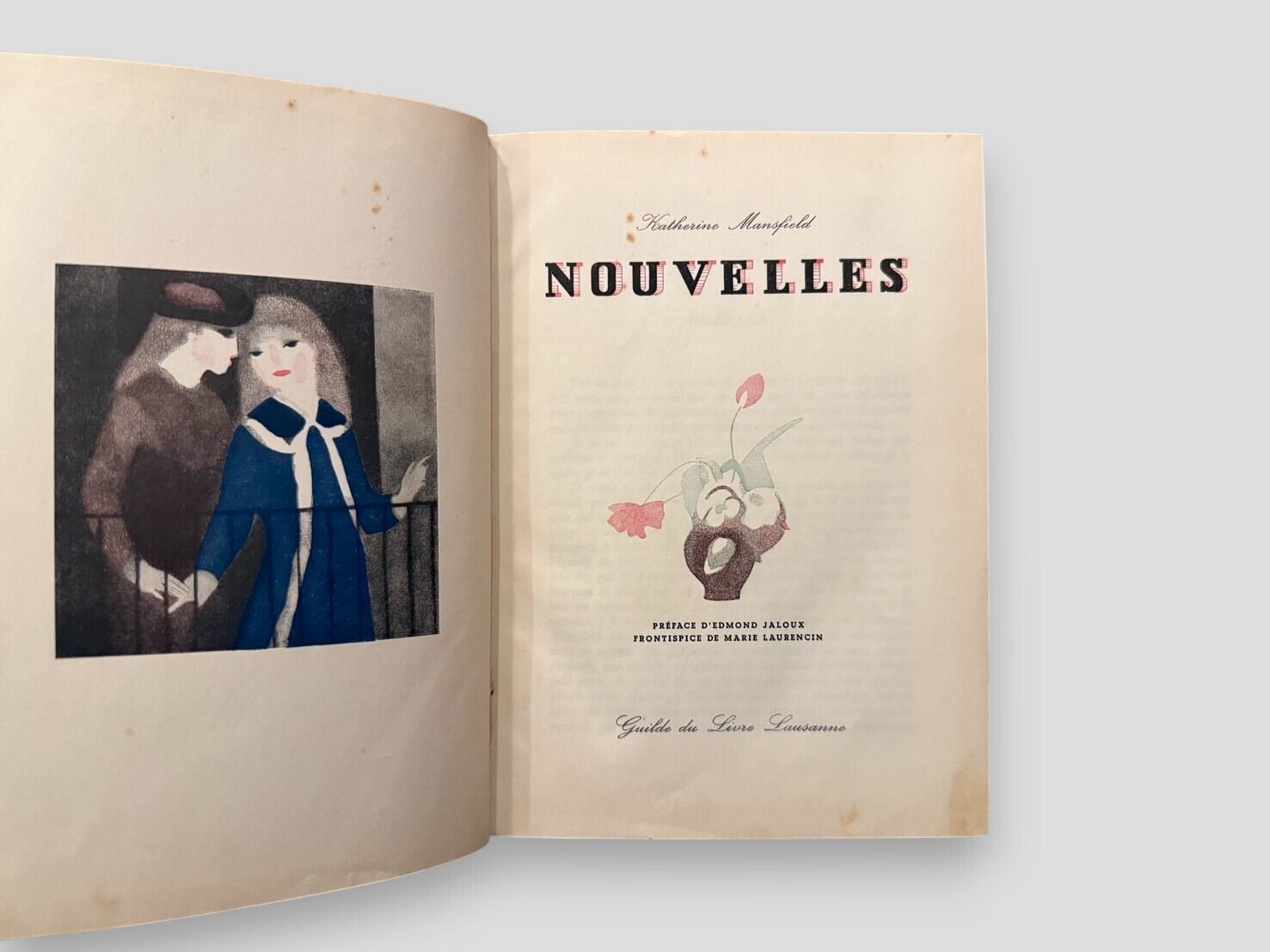 キャサリン・マンスフィールドによる「Félicité」をはじめとする代表的短編集を収めた仏語訳版。序文はエドモン・ジャルーによるもので、フロントピースにはフランスの画家マリー・ローランサンの挿画を収録。1944年に限定8,300部で刊行され、本書はそのうちのNo. 3357である。
