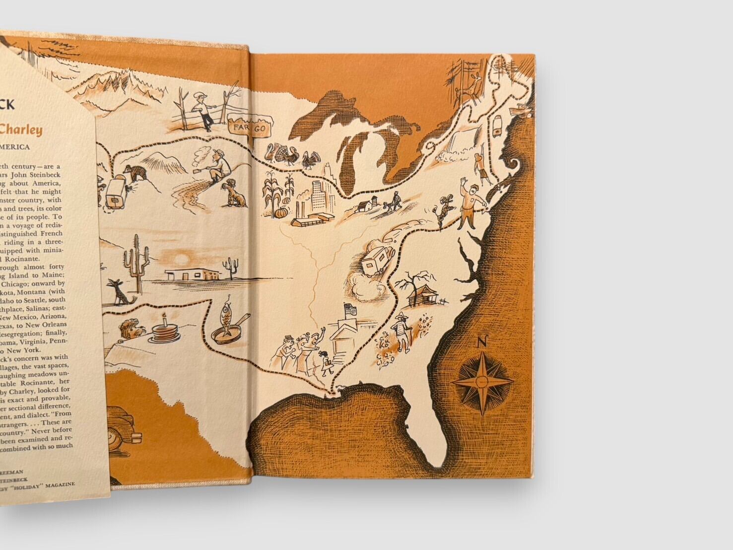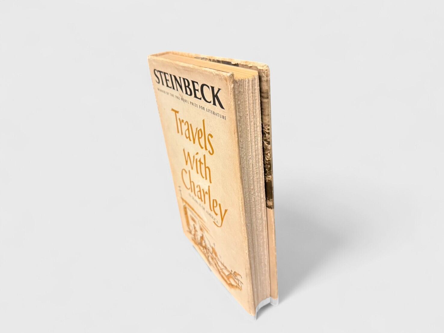 ジョン・スタインベックが1962年に発表した紀行文学『チャーリーとの旅―アメリカを求めて』初版第14刷。スタインベックの愛犬チャーリーと共にキャンピングカーに乗り込み、アメリカを横断した旅の記録で、広大な国土とそこで出会った人々の姿を描きながら、1960年代初頭のアメリカ社会を批判的かつ愛情深いまなざしで見つめ直す。スタインベックは人種問題や消費社会への疑問、アメリカ的アイデンティティを問い直し、ノーベル賞作家としての社会的責任を自らの旅の言葉に託した。軽快な筆致とユーモアに満ちつつも、鋭い洞察に彩られた一冊。